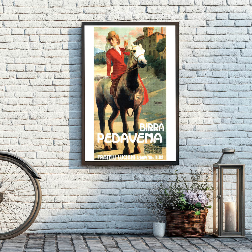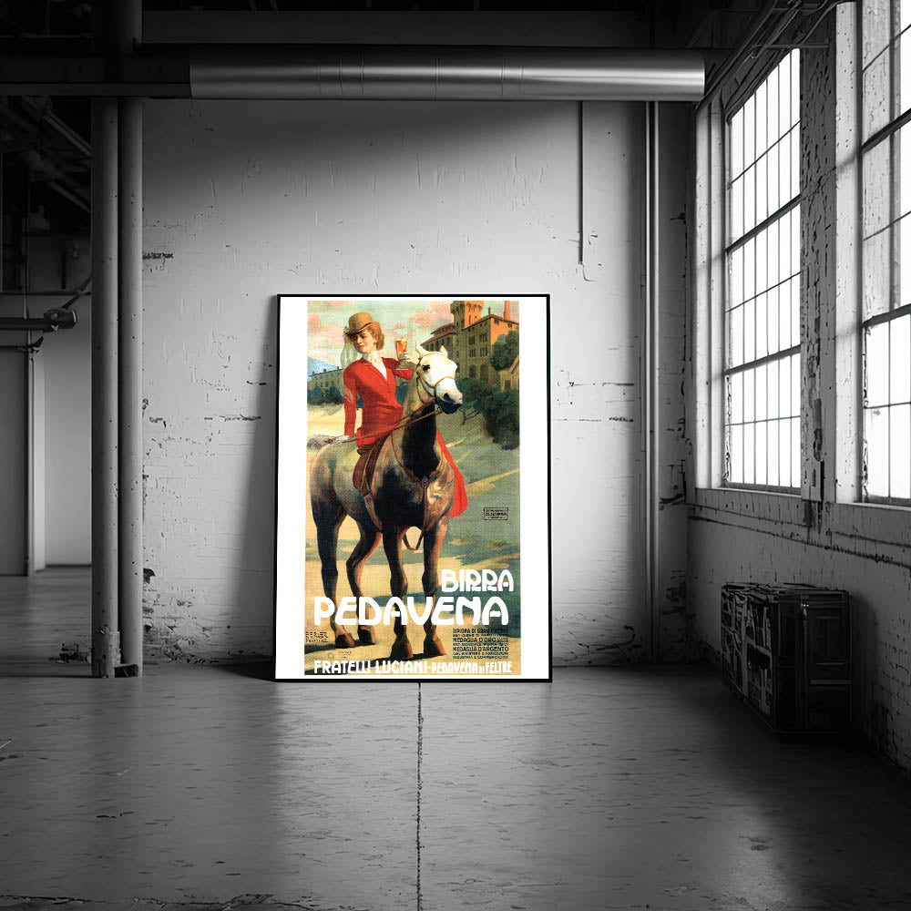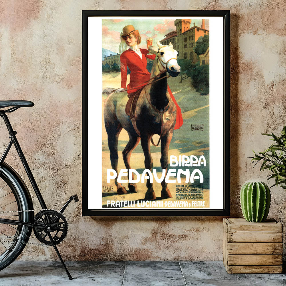 This captivating vintage-inspired wall art features the Birra Pedavena advertisement, showcasing a beautiful woman in a red riding outfit holding a glass of beer while riding a horse. The soft, warm colors and scenic background create a nostalgic and elegant feel, making it a perfect addition to any retro home decor collection. The design combines vintage charm with a sense of movement, making it stand out in any space.