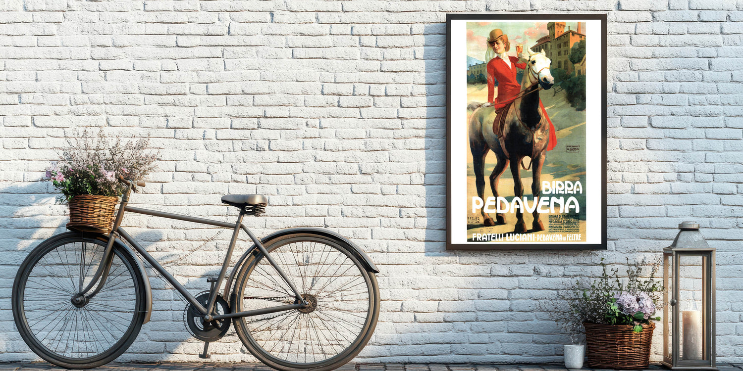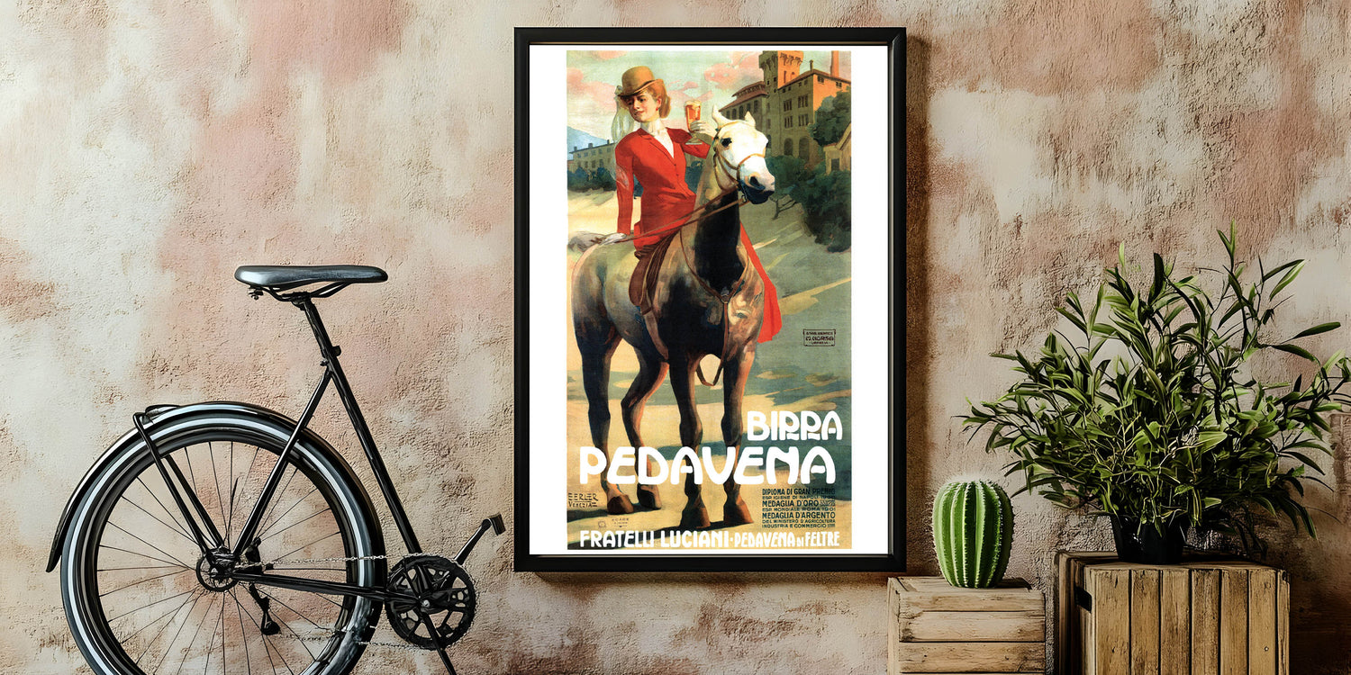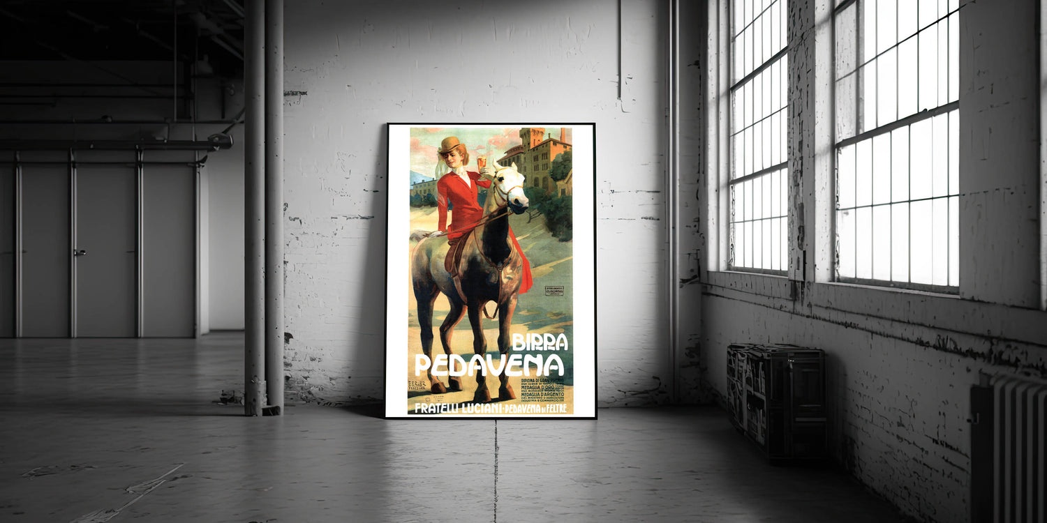 This captivating vintage-inspired wall art features the Birra Pedavena advertisement, showcasing a beautiful woman in a red riding outfit holding a glass of beer while riding a horse. The soft, warm colors and scenic background create a nostalgic and elegant feel, making it a perfect addition to any retro home decor collection. The design combines vintage charm with a sense of movement, making it stand out in any space.