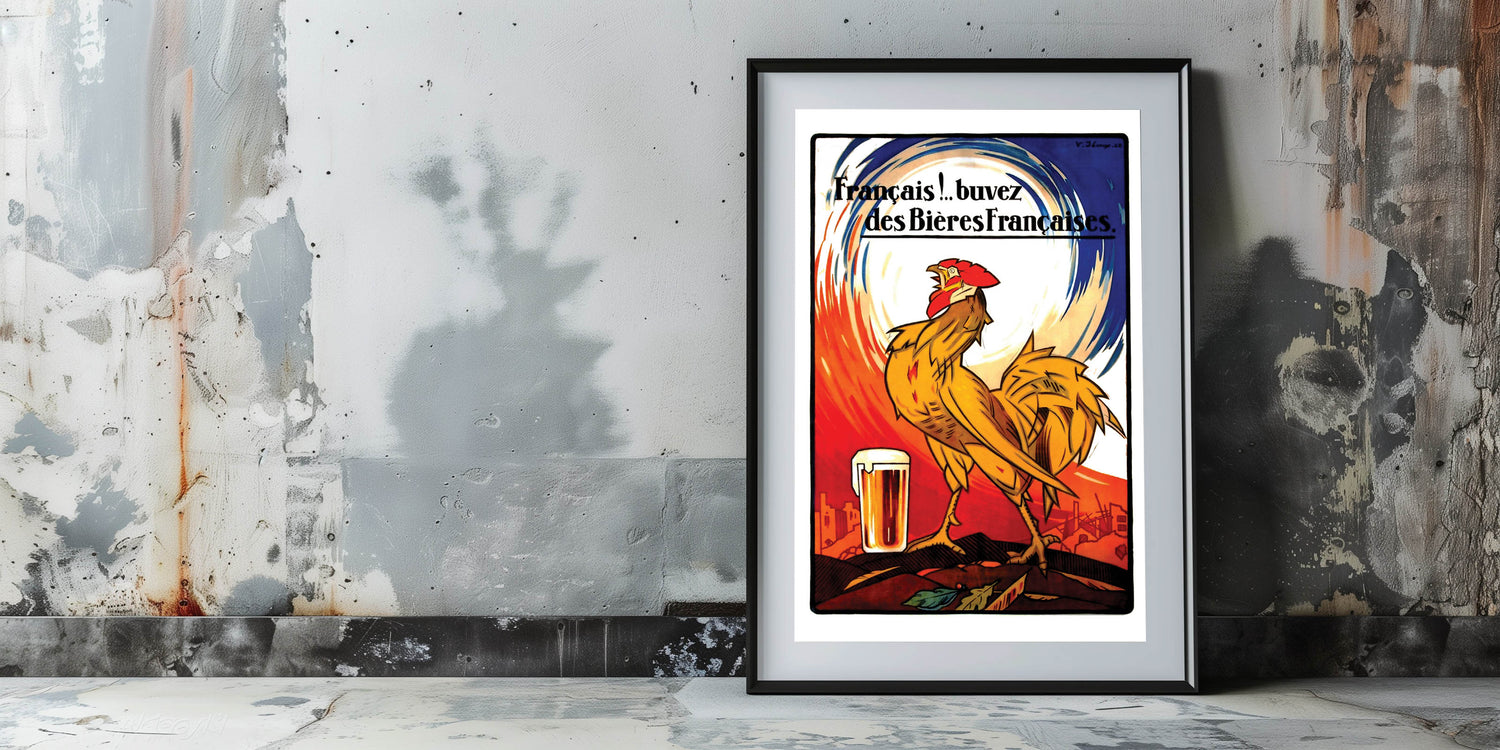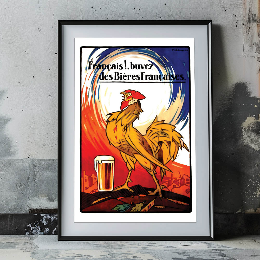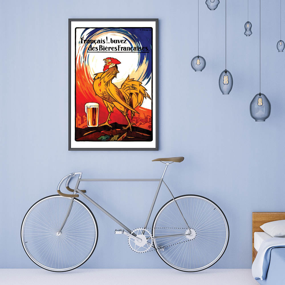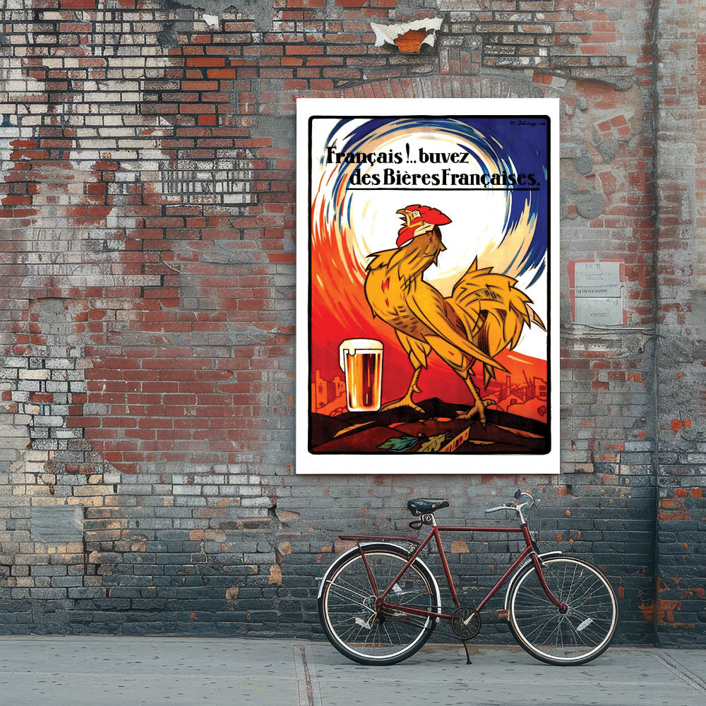 Add a vibrant pop of color to your home with this vintage-inspired wall art featuring the iconic Français ! Buvez des Bières Françaises advertisement. The bold illustration of a proud rooster with a glass of beer creates a striking, retro look that will make a statement in any space. The bright yellow and red tones make this poster an eye-catching addition to your retro home decor.