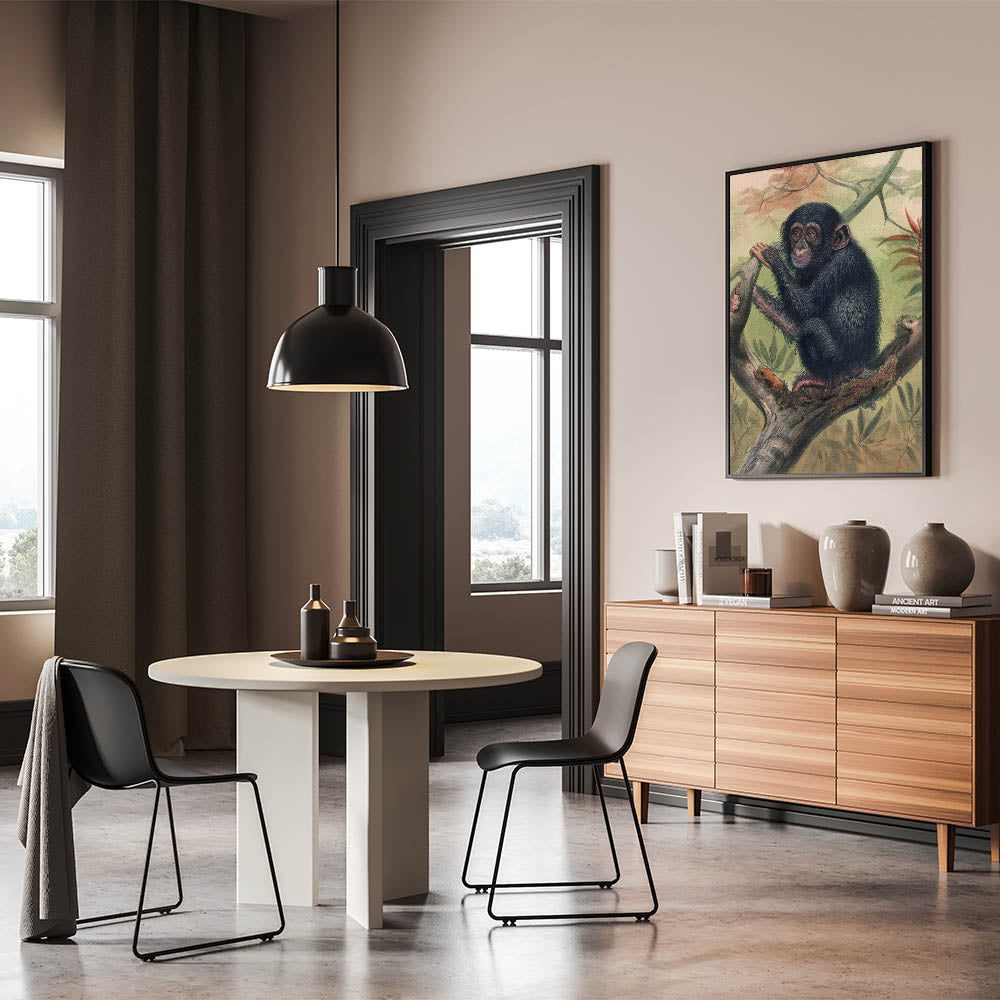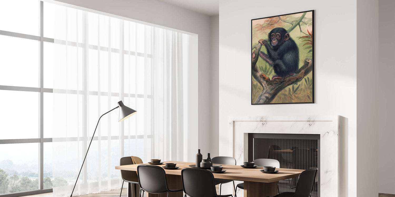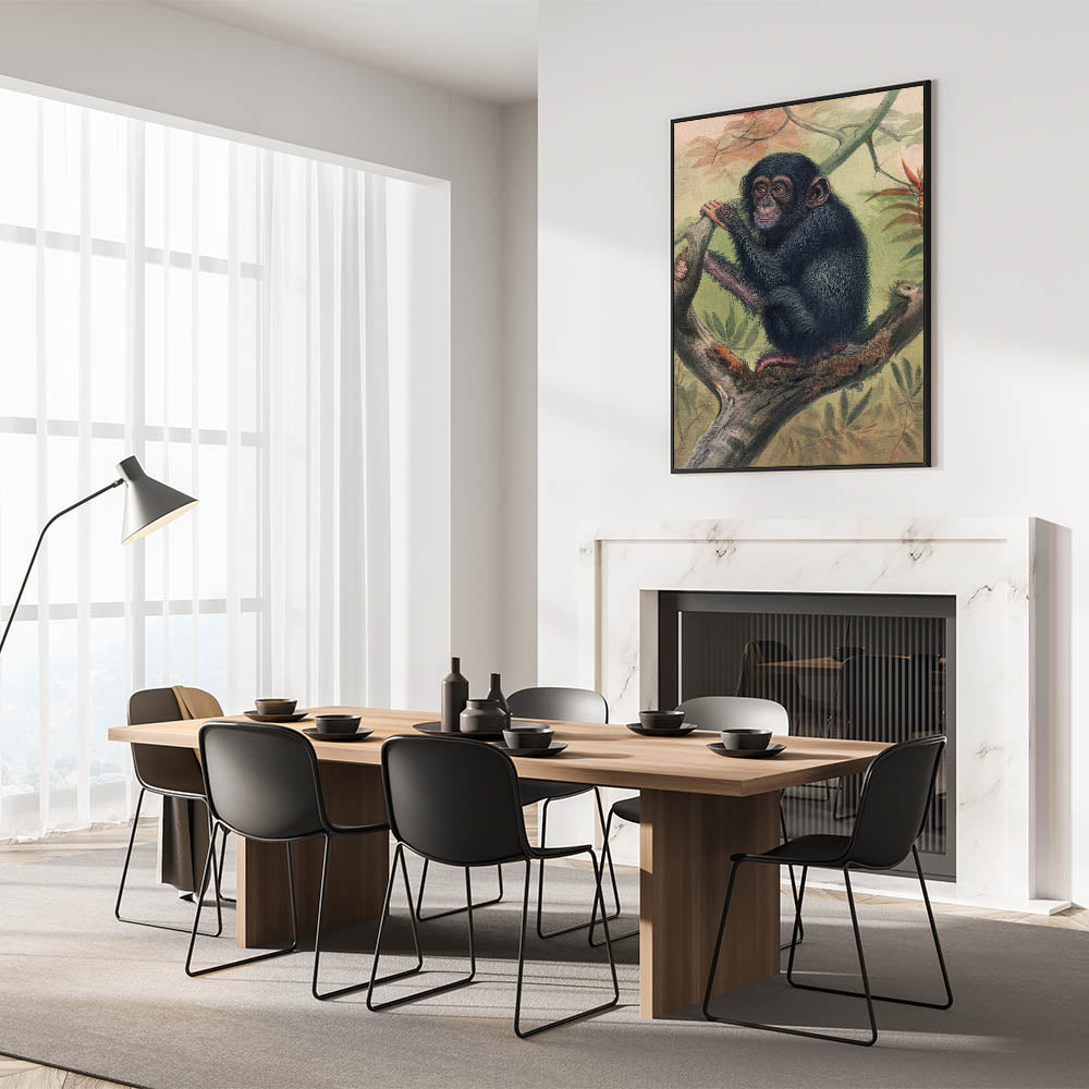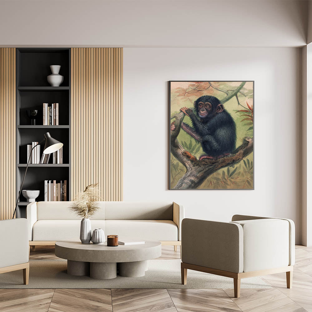 - High-quality art print featuring a vintage illustration of a chimpanzee