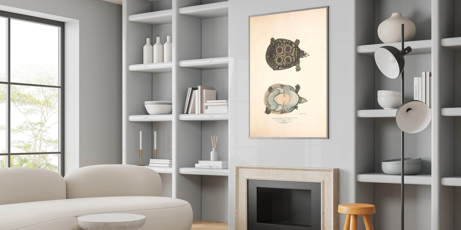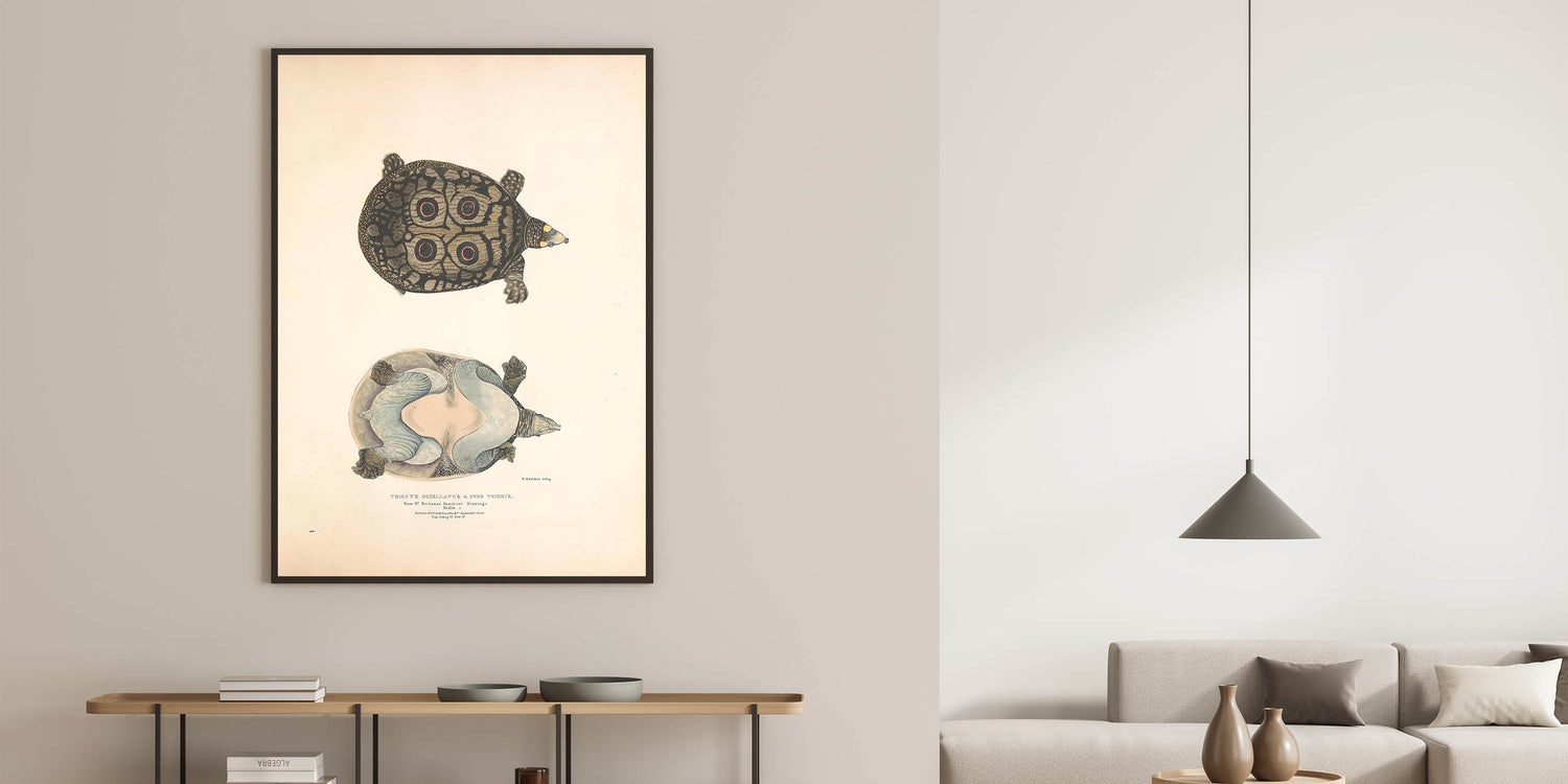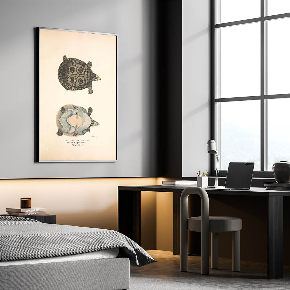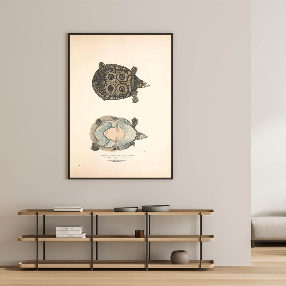 Bring a touch of timeless vintage animal art into your space with this Eyed Trionix Turtle illustration. This detailed animal artwork showcases a rare and intriguing species, featuring its distinctive circular shell markings, intricate skin textures, and a soft muted color palette. A perfect choice for animal wall decor enthusiasts, nature lovers, and collectors of retro animal illustrations.