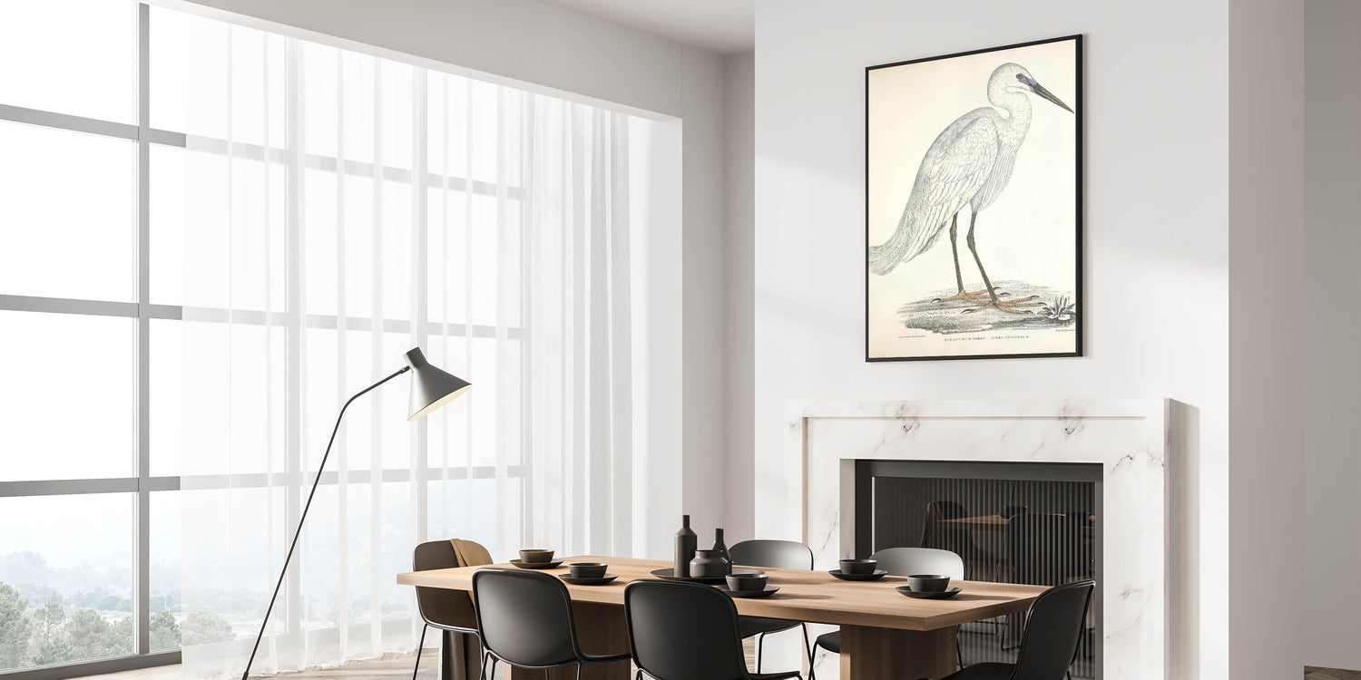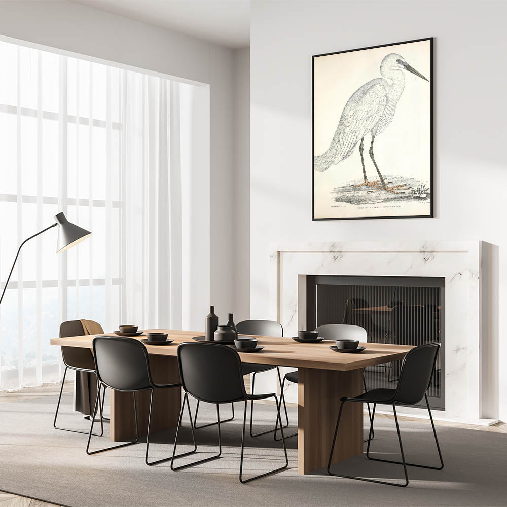 Elevate your space with this timeless vintage animal art featuring an Indian White Heron illustration. This handcrafted animal illustration showcases the bird’s graceful stance, intricate feather details, and soft monochrome tones, making it a refined addition to any animal wall decor collection.
