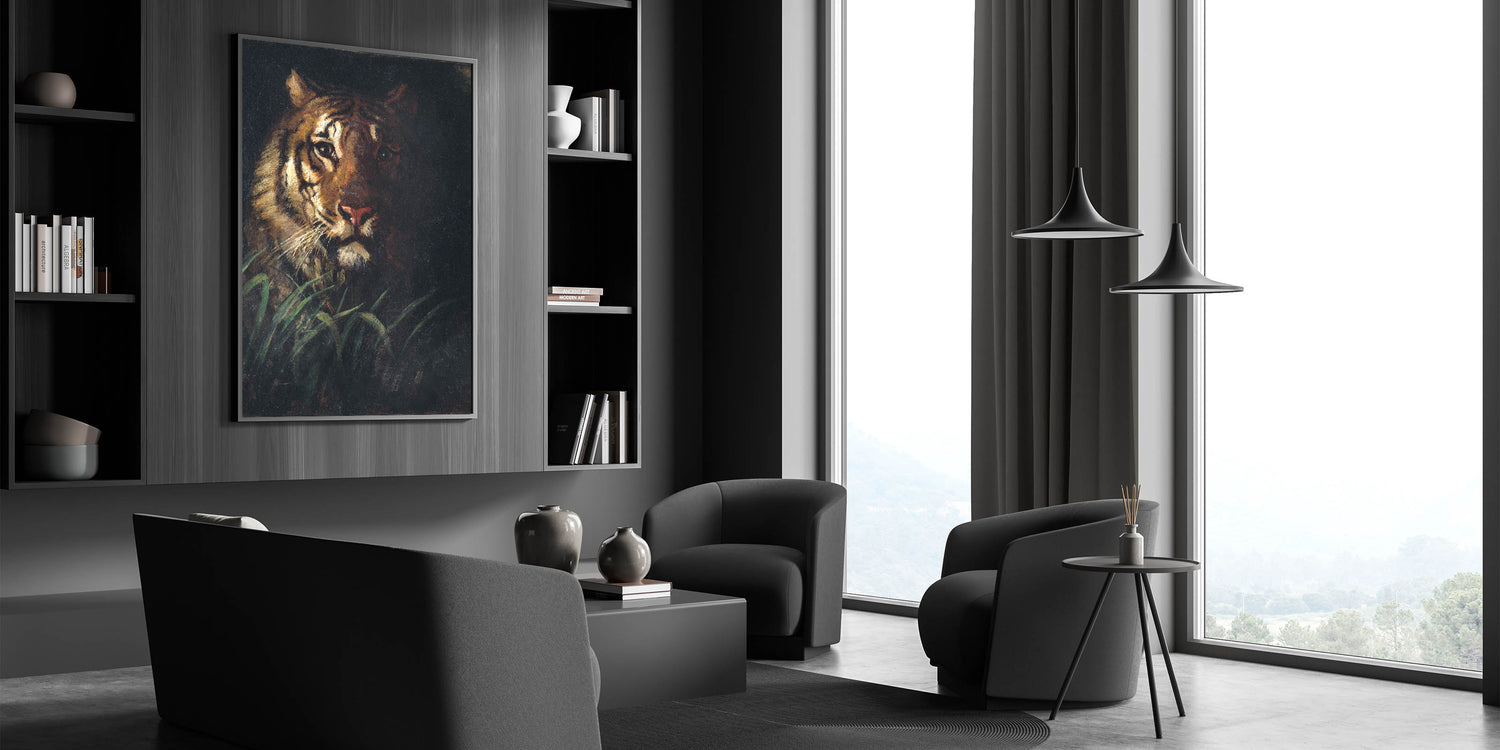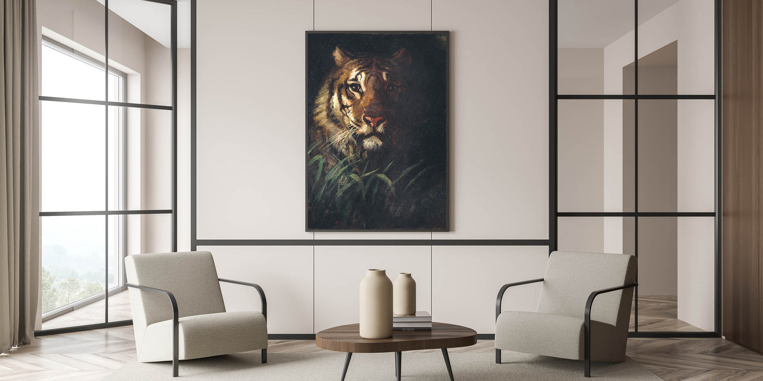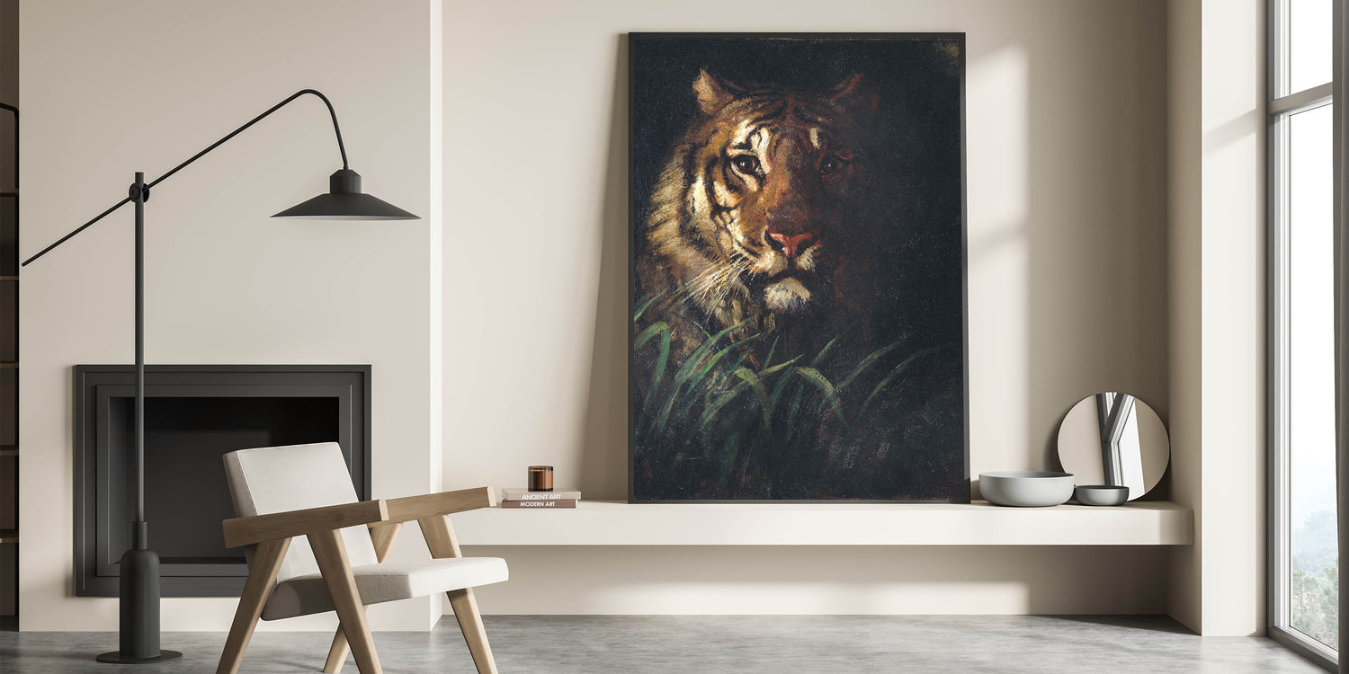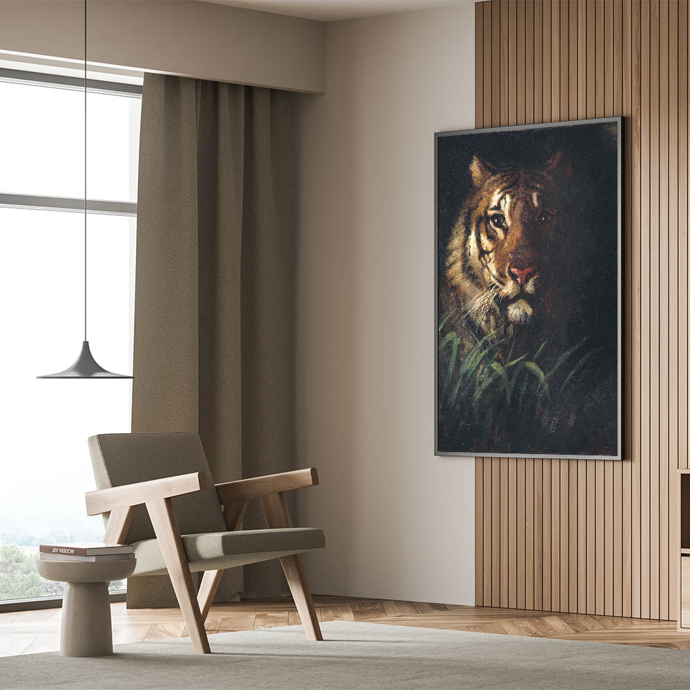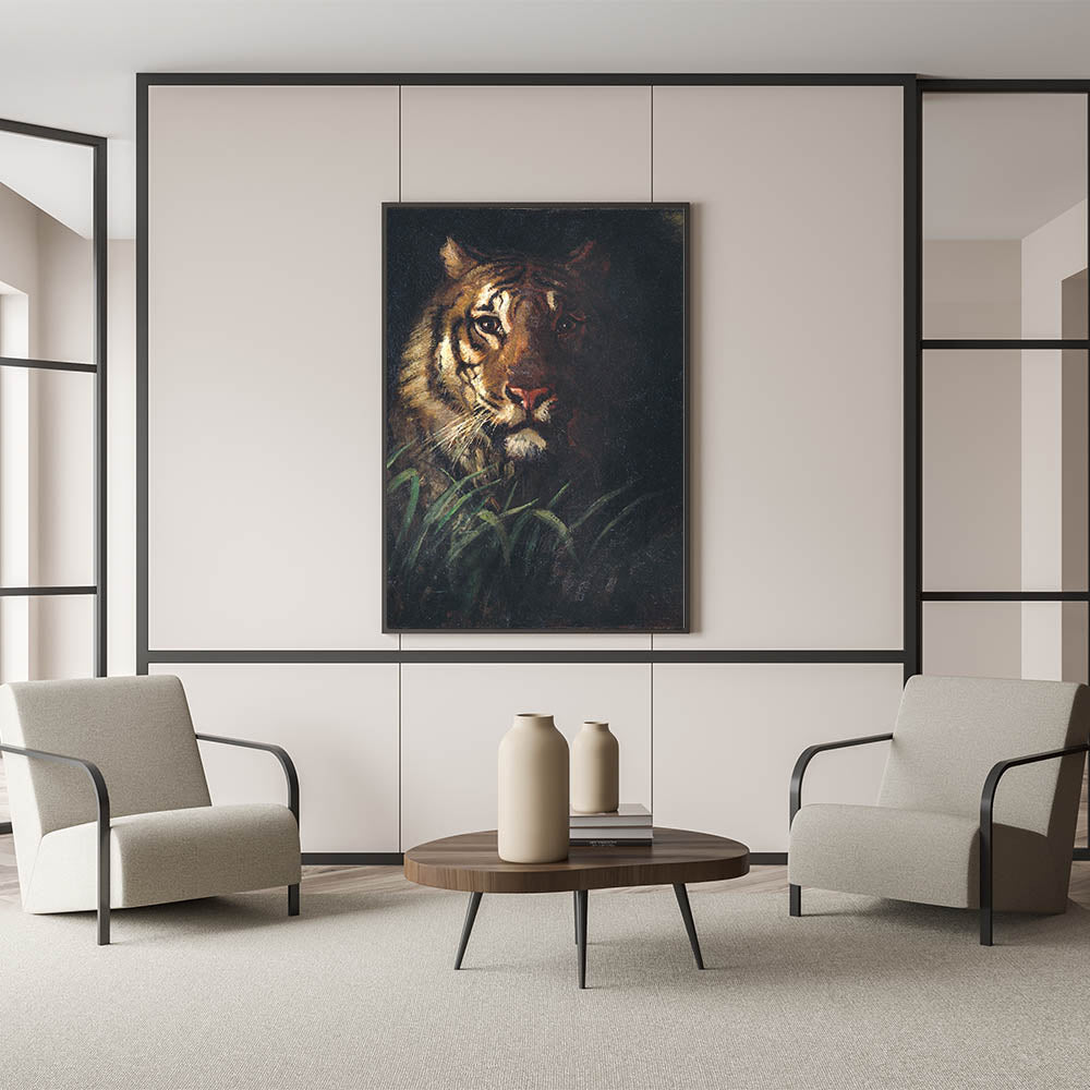 This captivating Vintage Animal Art features a fierce yet majestic tiger peering out from the shadows, with its piercing eyes and striking fur beautifully captured. The delicate play of light and shadow adds depth to this stunning portrayal, while the tiger's presence in the wild grasses highlights its raw power and elegance. This piece is ideal for nature lovers and wildlife art enthusiasts who admire the beauty and strength of big cats. With its dramatic composition, this print is sure to make a bold statement in any space.