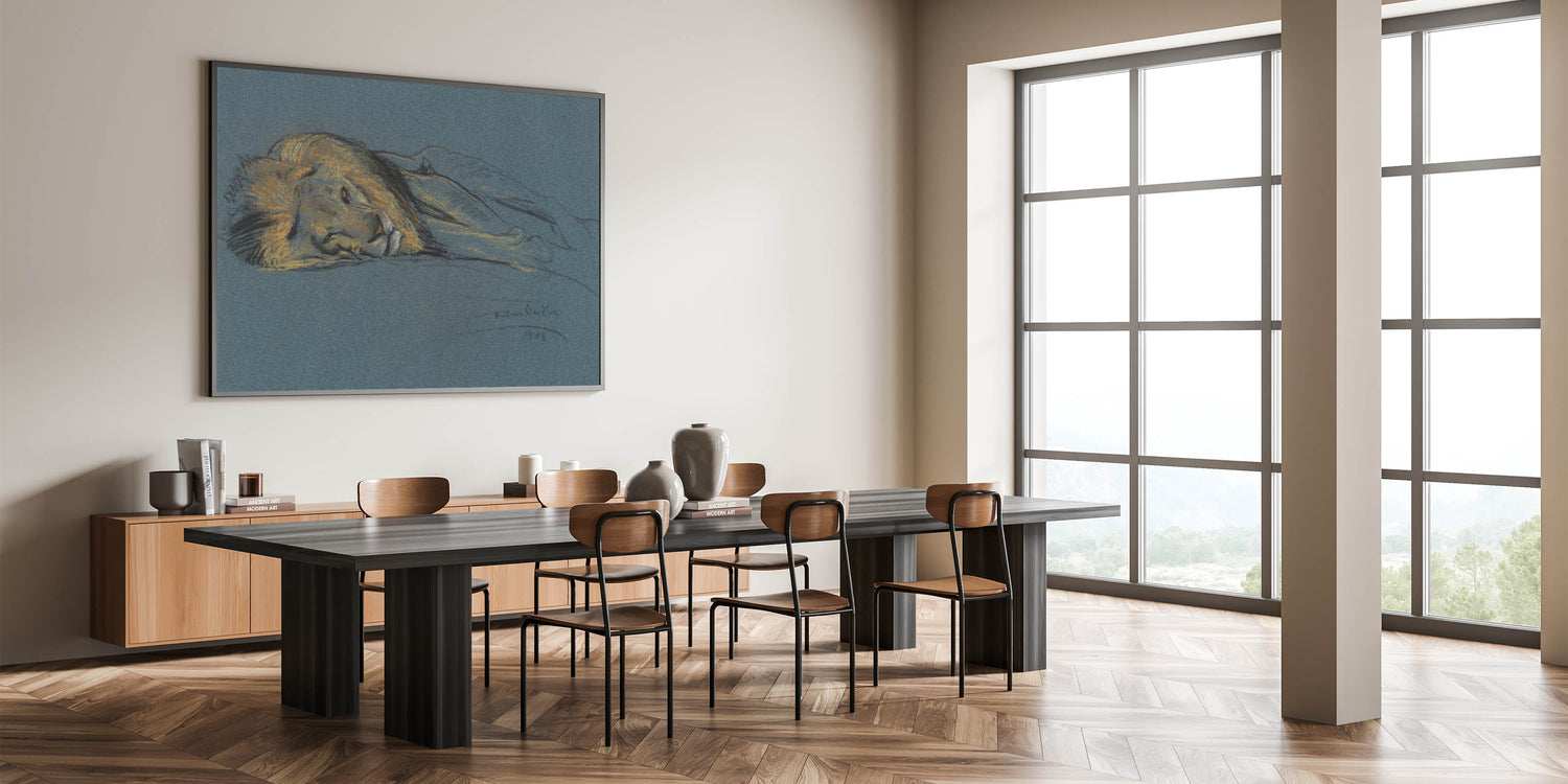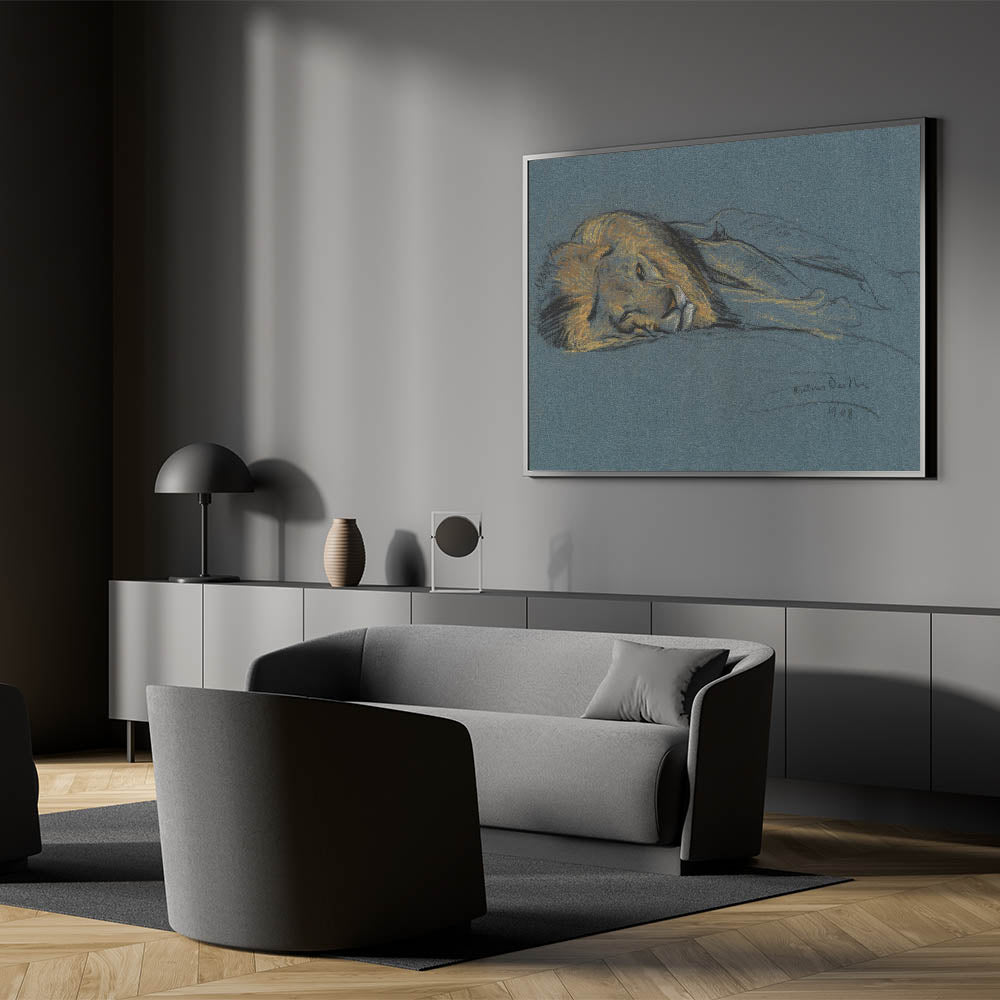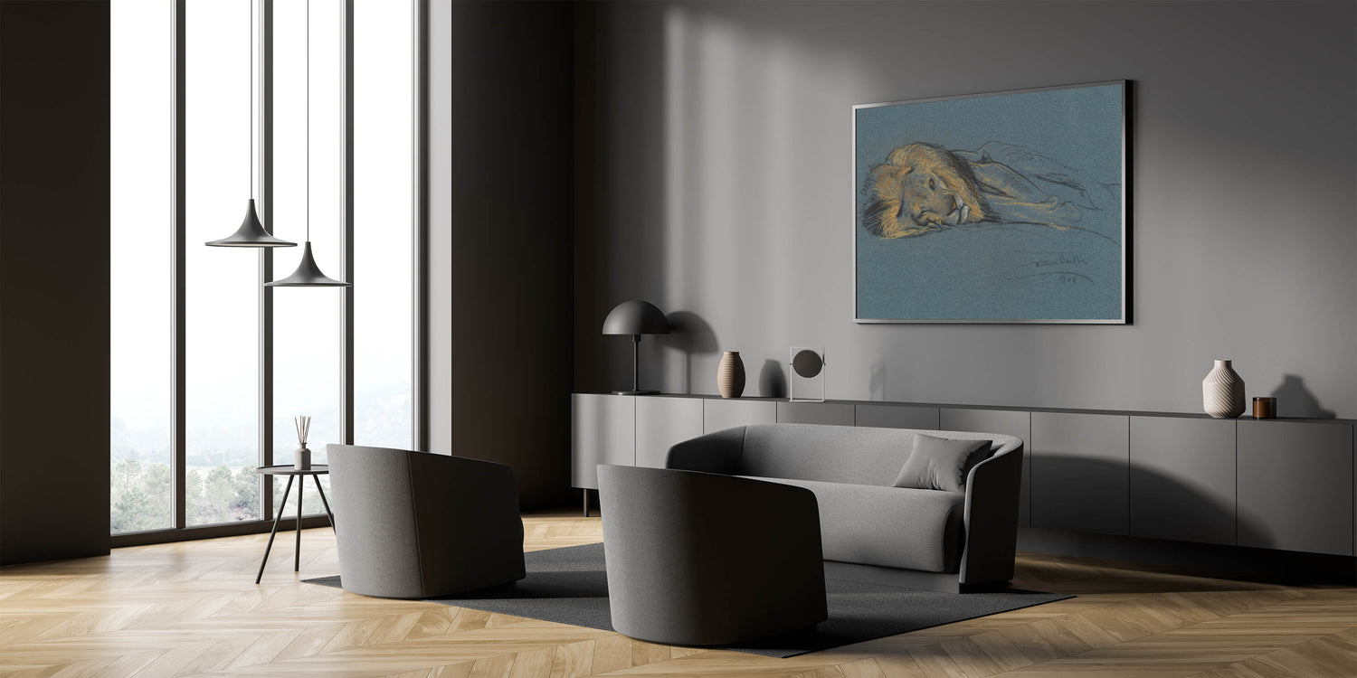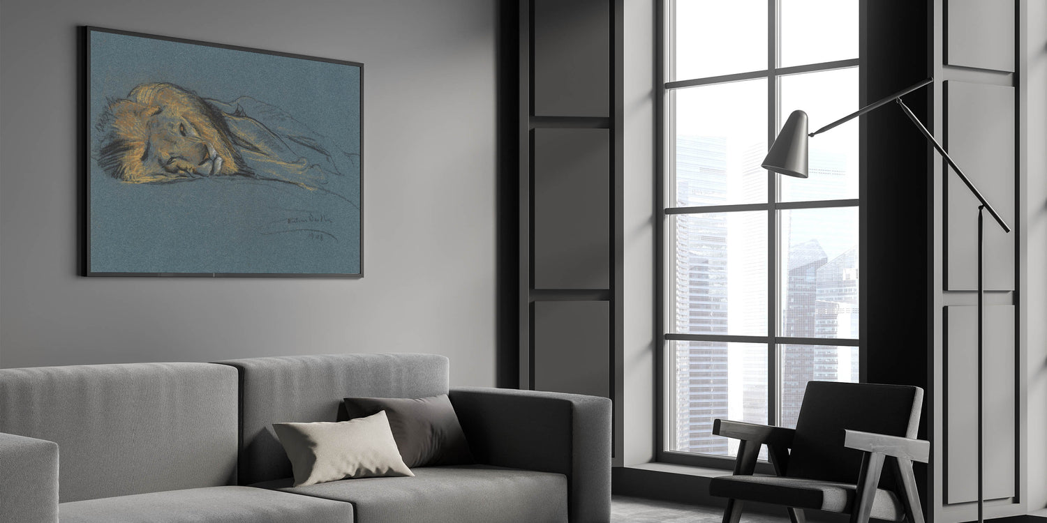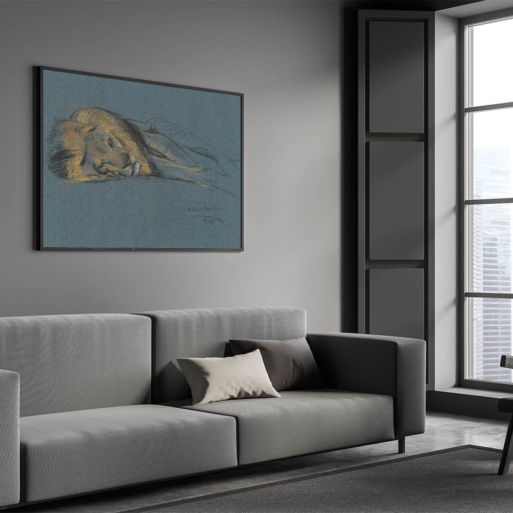 This captivating Vintage Animal Art features a peaceful lion in a resting pose, sketched with delicate pastel hues on a rich blue background. The soft, yet striking, details capture the lion's regal features and the relaxed tranquility of this majestic creature. The artist’s choice of muted tones and fine lines makes this piece a timeless addition to any collection, perfect for those who appreciate the raw beauty of wildlife and fine art sketches. This work of art is a true celebration of the lion's grace and power in a peaceful moment.