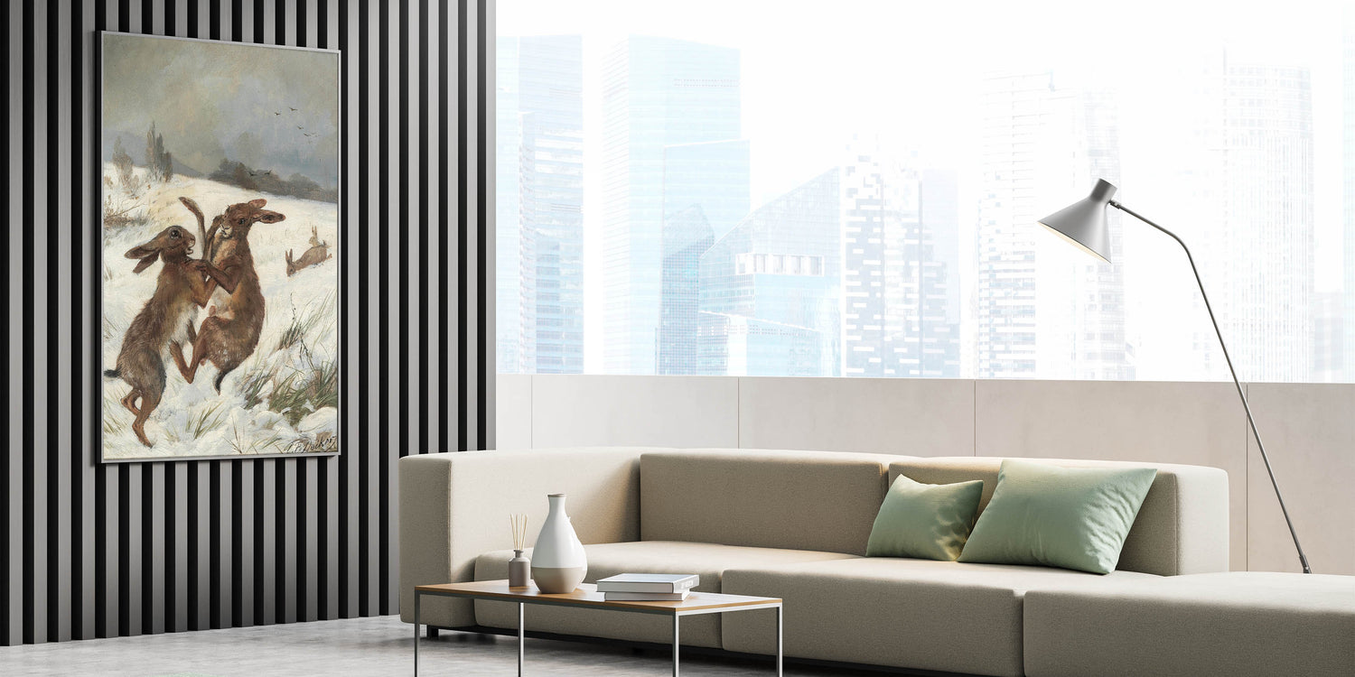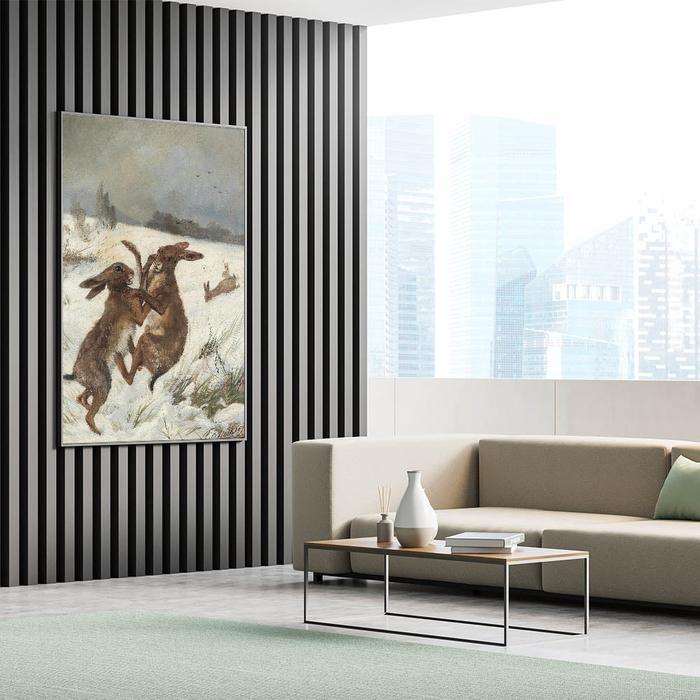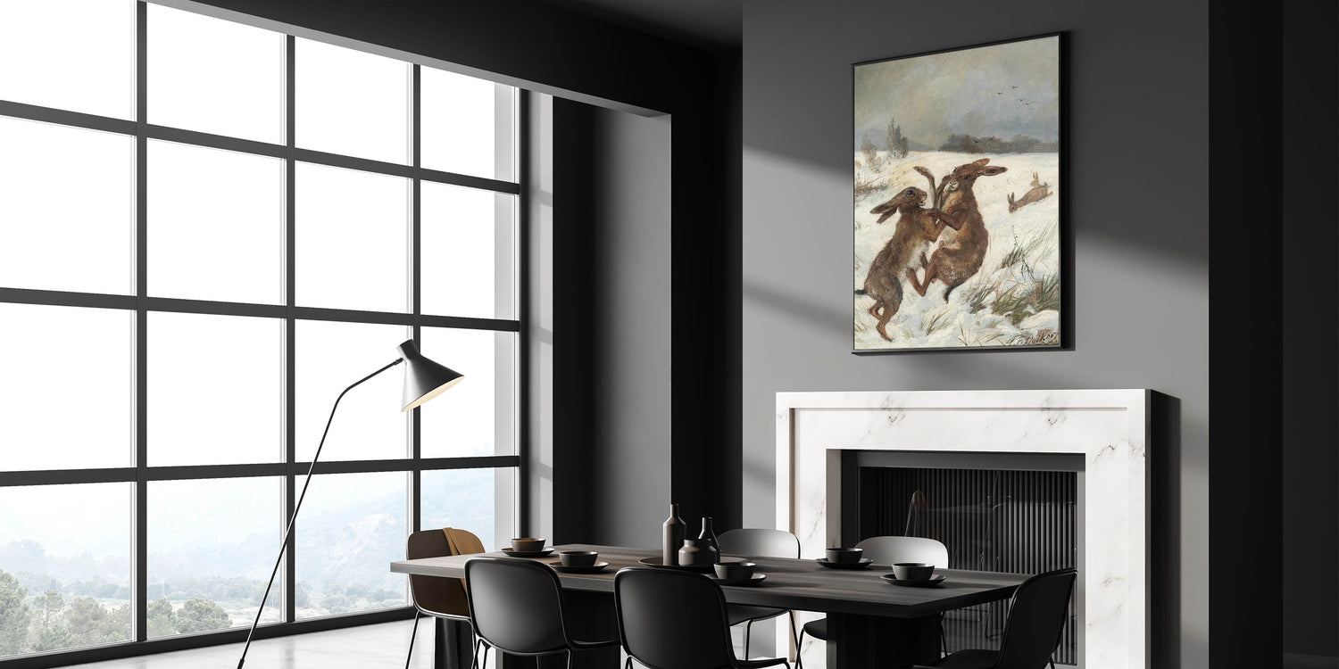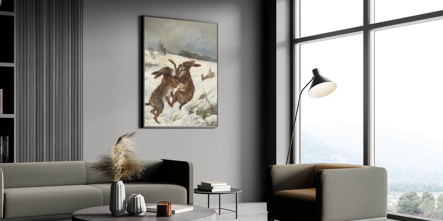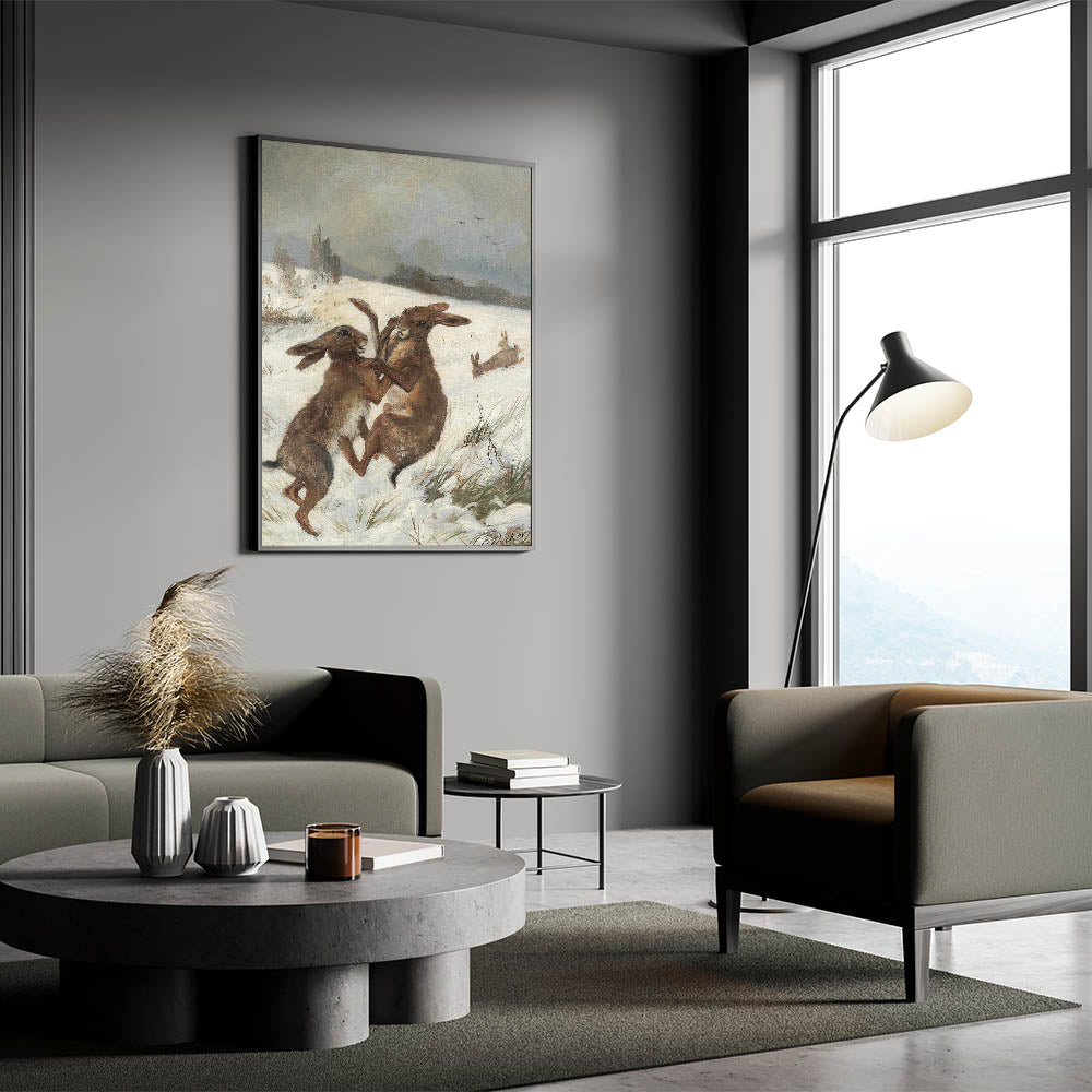 This delightful Vintage Animal Art captures the playful nature of two hares in a snowy field, engaged in a lively display of energy and joy. Set against a winter backdrop, this antique wildlife print brings the beauty and charm of nature's creatures to life. The artwork’s soft, muted colors combined with the dynamic movement of the hares make this piece an ideal addition to any vintage animal decor collection. Whether you're an animal lover or a fan of nostalgic winter scenes, this print is a perfect fit for any home or office.