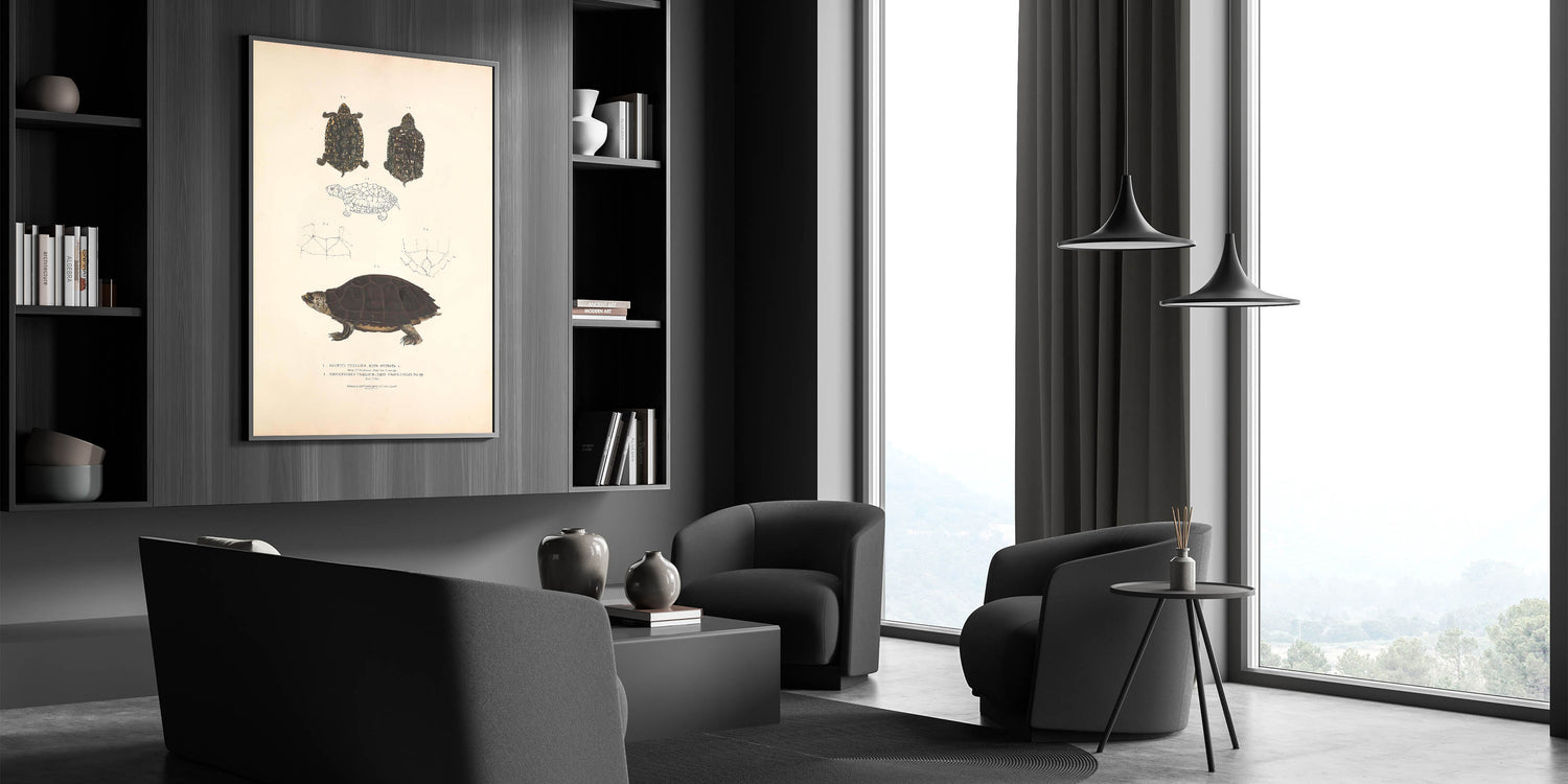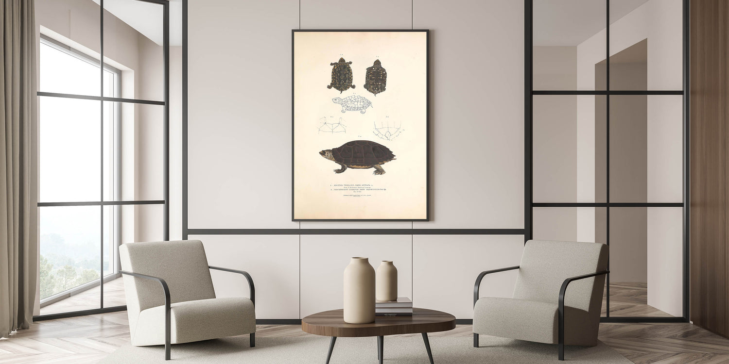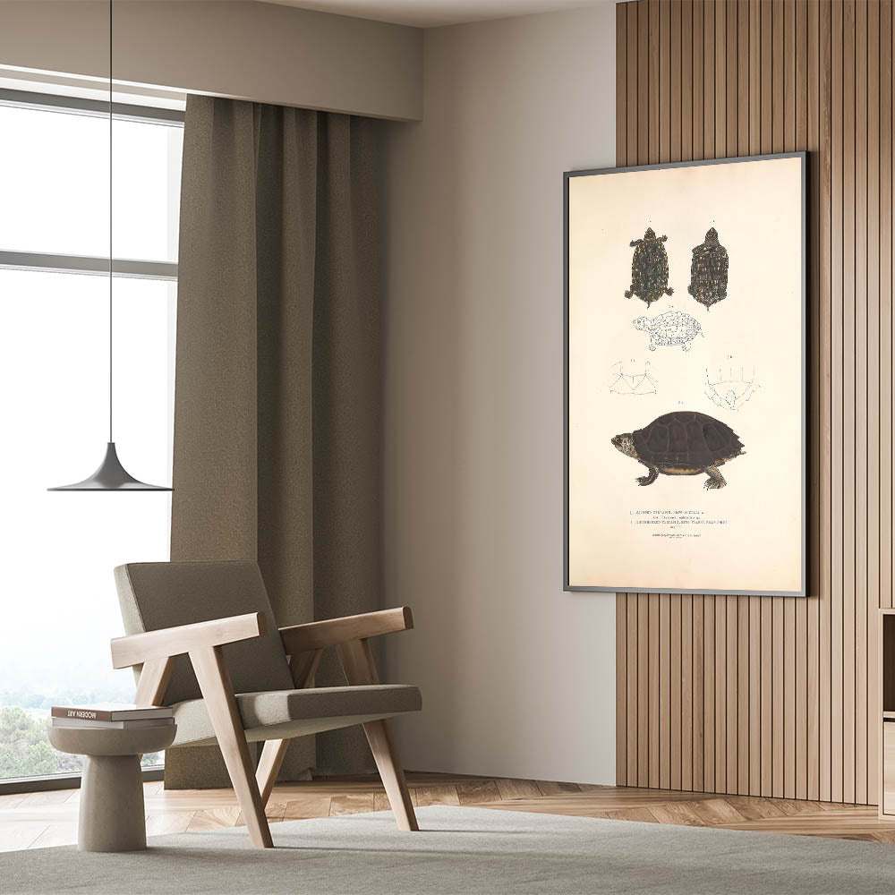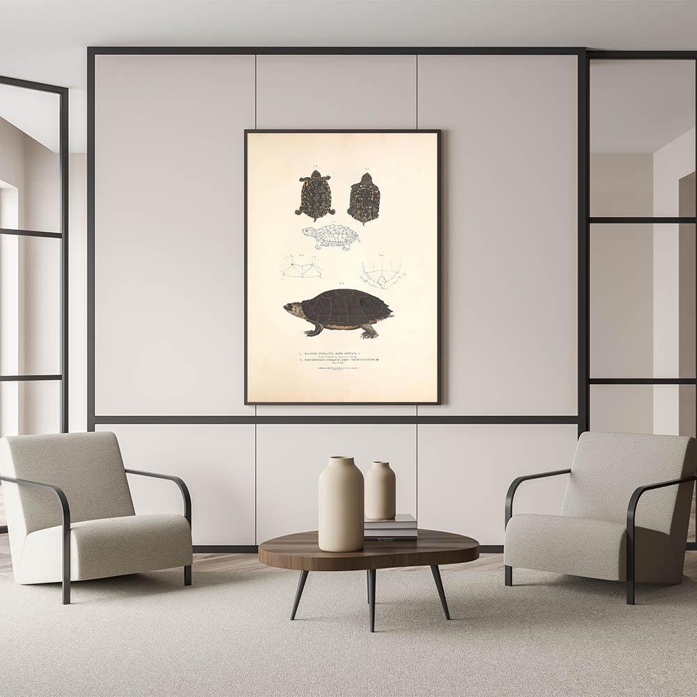 Bring the elegance of timeless vintage animal art into your home with this Spotted Terrapin Turtle illustration. This detailed animal artwork presents multiple perspectives of this unique reptile, capturing its intricate shell patterns, rich dark tones, and delicate scientific sketches. A perfect piece for animal wall decor enthusiasts, turtle lovers, and vintage art collectors.