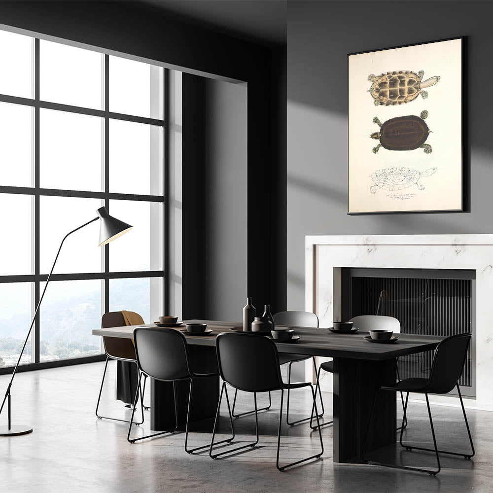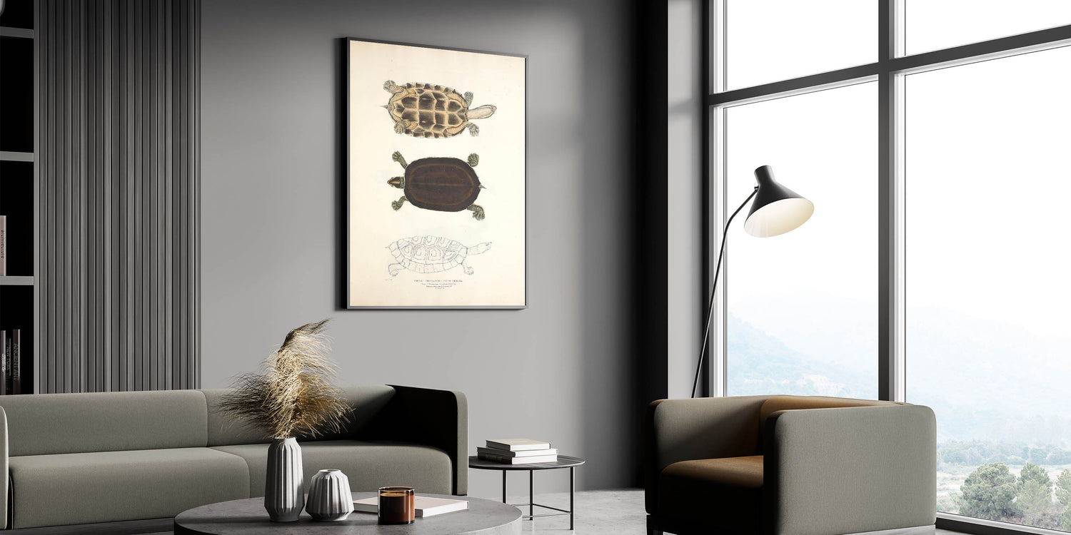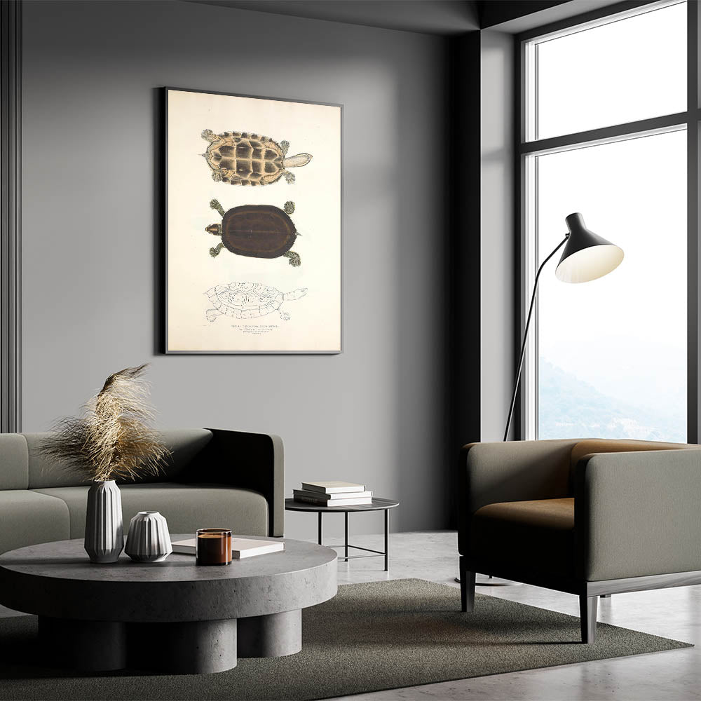 Discover the beauty of timeless vintage animal art with this Thuji Terrapin Turtle illustration. This detailed animal artwork presents multiple perspectives of these unique reptiles, highlighting their distinct shell patterns, textured skin, and intricate natural details. A perfect choice for animal wall decor enthusiasts and reptile lovers.