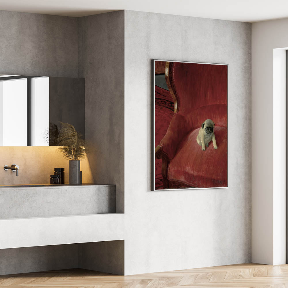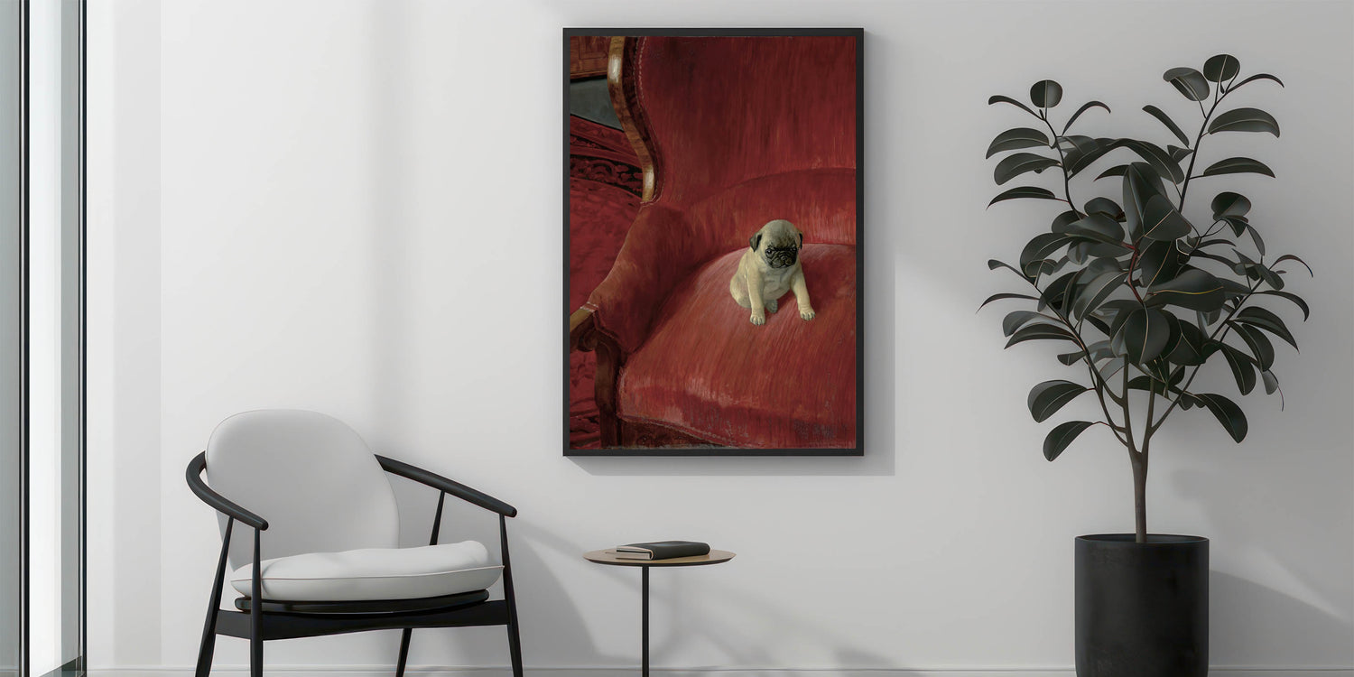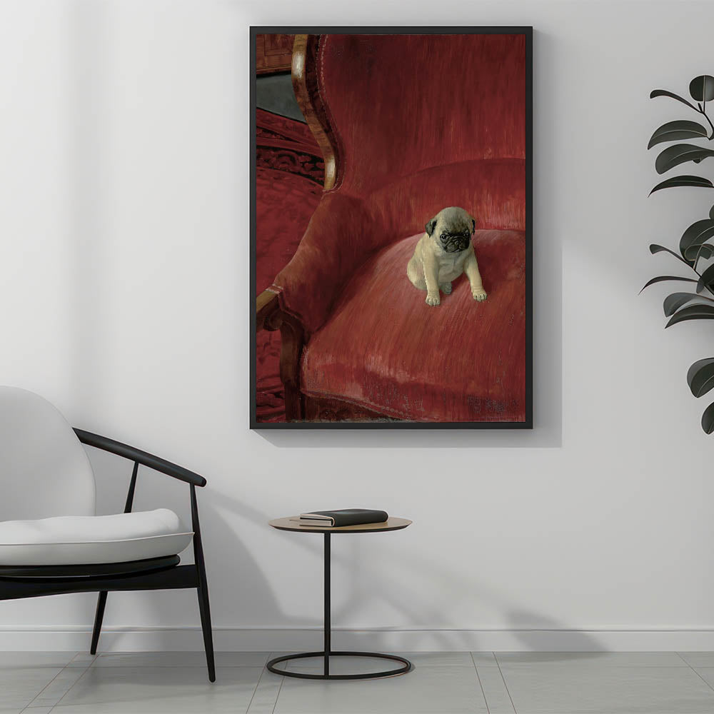 Bring a touch of charm and warmth to your space with this adorable vintage animal art, featuring a playful pug sitting on an elegant red chair. The lifelike detail and soft textures capture the personality of this cute pup, making it an ideal piece for pet lovers and collectors of nostalgic animal artwork. This timeless animal art print brings together classic style and modern realism, offering a delightful addition to your vintage-inspired animal decor. The rich red tones of the background complement the pug’s expressive features, creating a captivating focal point for any room in your home.