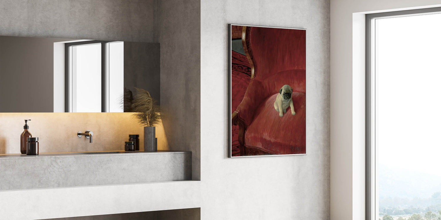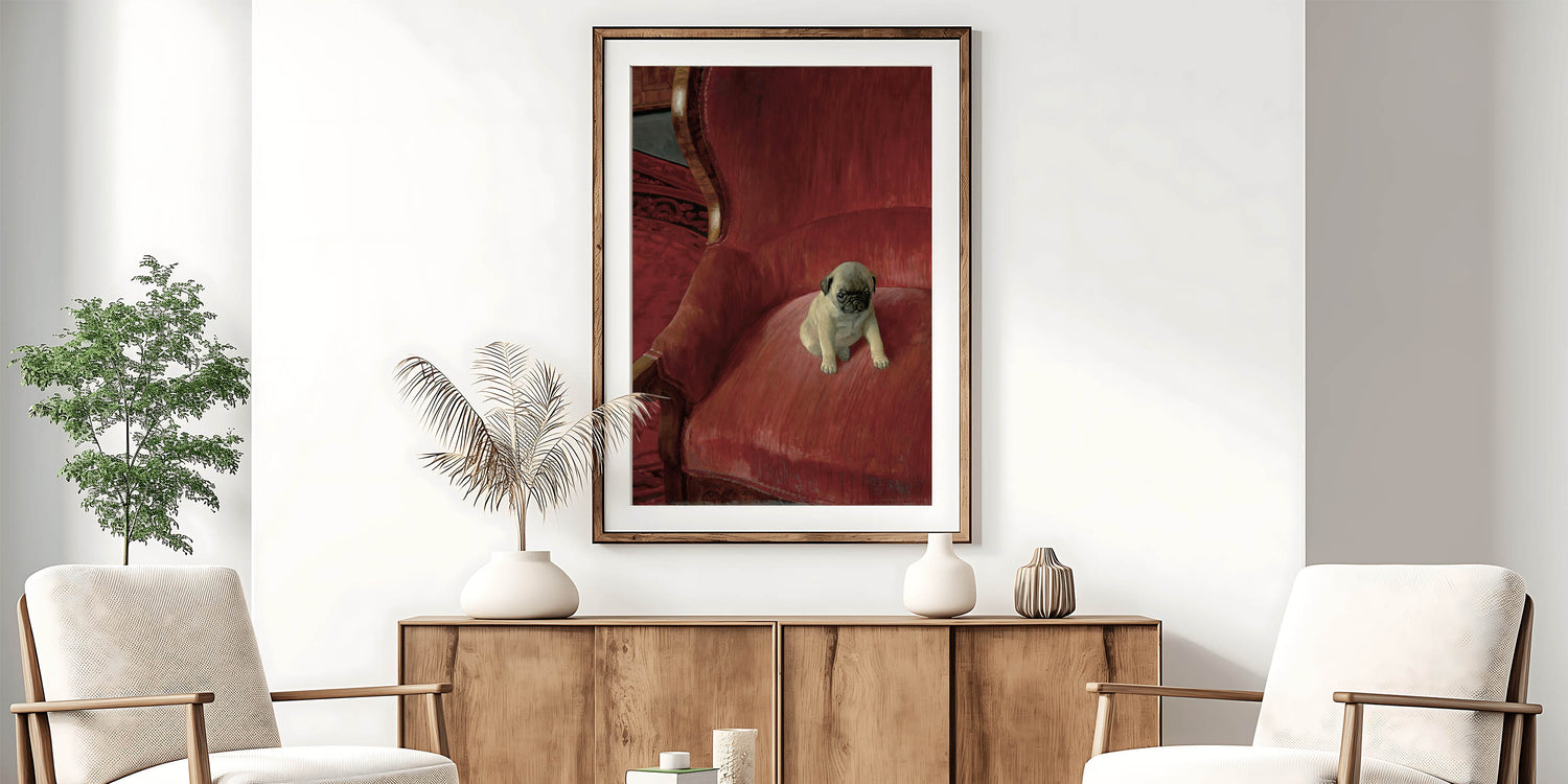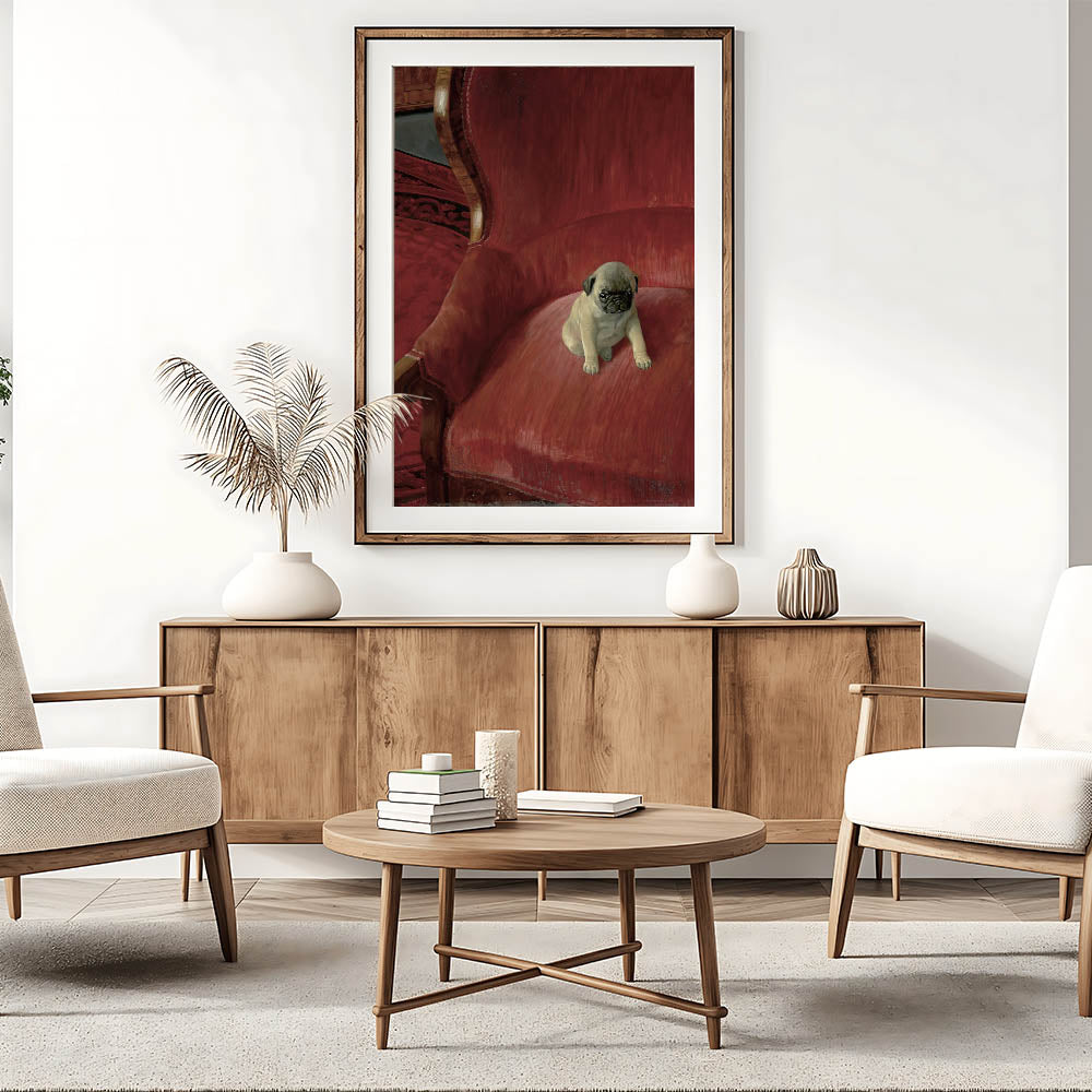 Bring a touch of charm and warmth to your space with this adorable vintage animal art, featuring a playful pug sitting on an elegant red chair. The lifelike detail and soft textures capture the personality of this cute pup, making it an ideal piece for pet lovers and collectors of nostalgic animal artwork. This timeless animal art print brings together classic style and modern realism, offering a delightful addition to your vintage-inspired animal decor. The rich red tones of the background complement the pug’s expressive features, creating a captivating focal point for any room in your home.