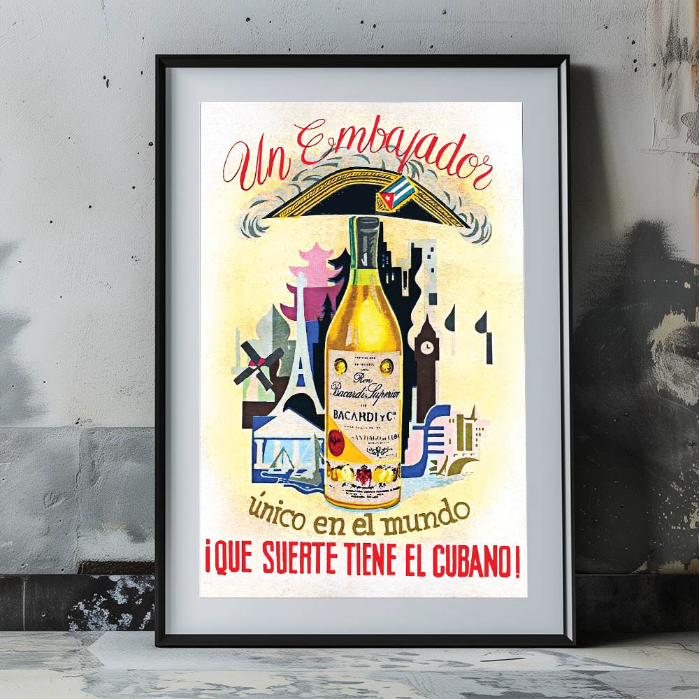 Capture the essence of Cuban heritage with this vibrant Vintage Bacardi Rum Poster. Featuring the iconic Bacardi bottle surrounded by famous landmarks from around the world, this poster beautifully celebrates the global legacy of Bacardi Rum. The colorful "Un Embajador único en el mundo" ("A unique ambassador in the world") text adds a touch of elegance and excitement, making it the perfect addition to your collection or home bar.