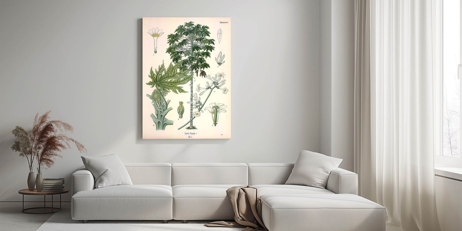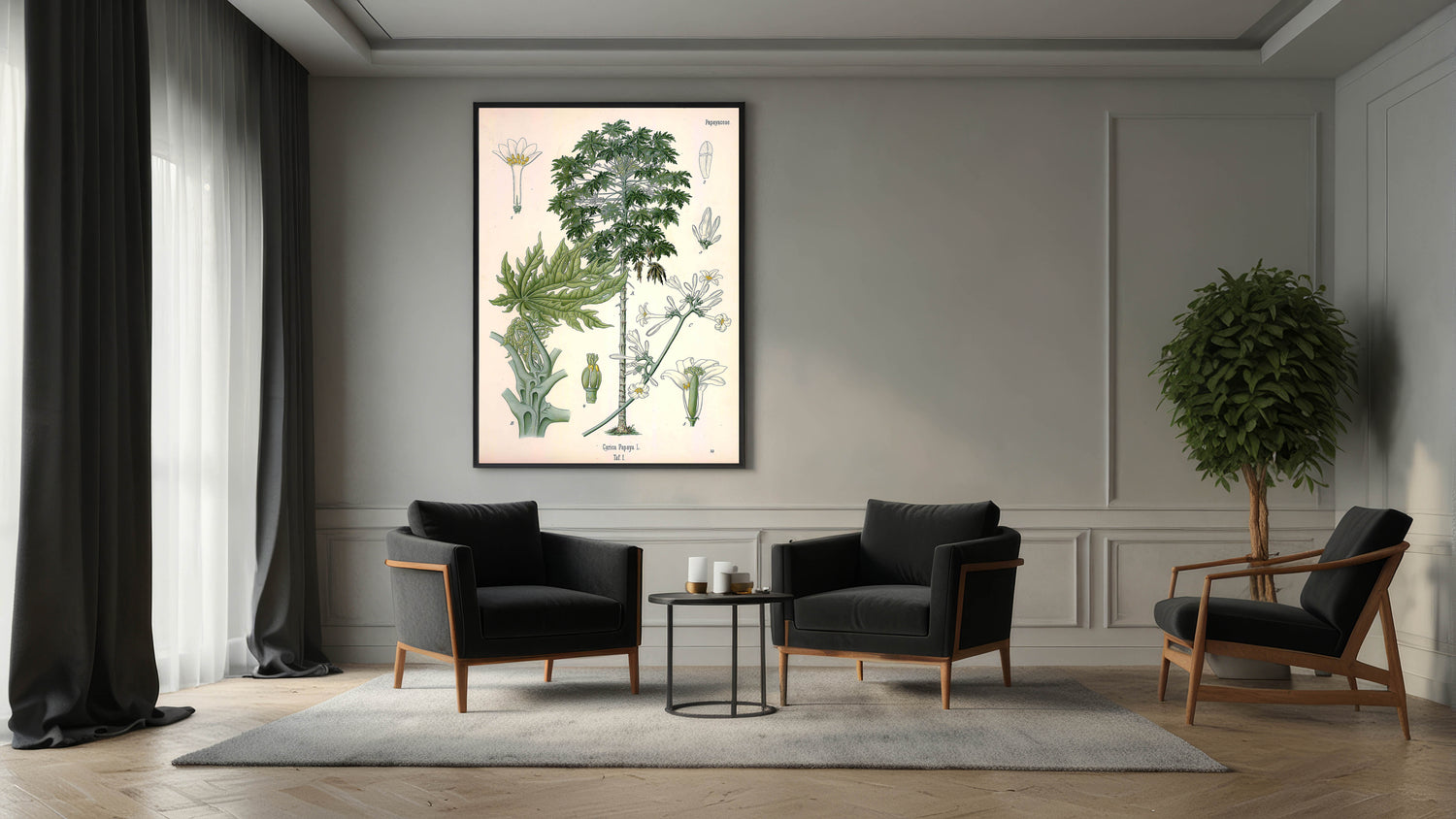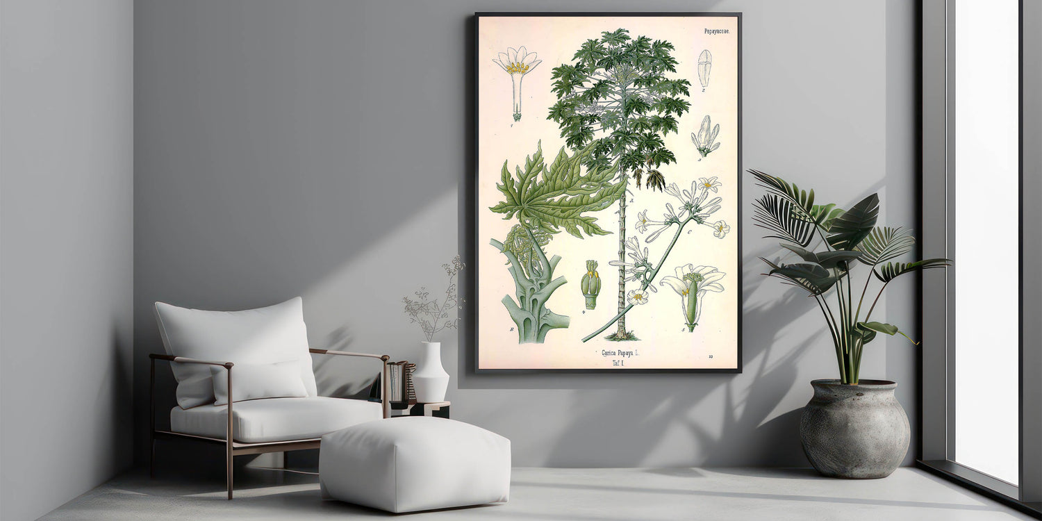Add a touch of nature’s elegance to your home with this stunning botanical art print of the Carica Papaya. Featuring intricate details of the papaya tree’s lush green leaves and delicate white flowers, this vintage botanical illustration brings the beauty of the tropics into any room. Ideal for nature lovers and vintage art collectors, this print offers a timeless piece of art.