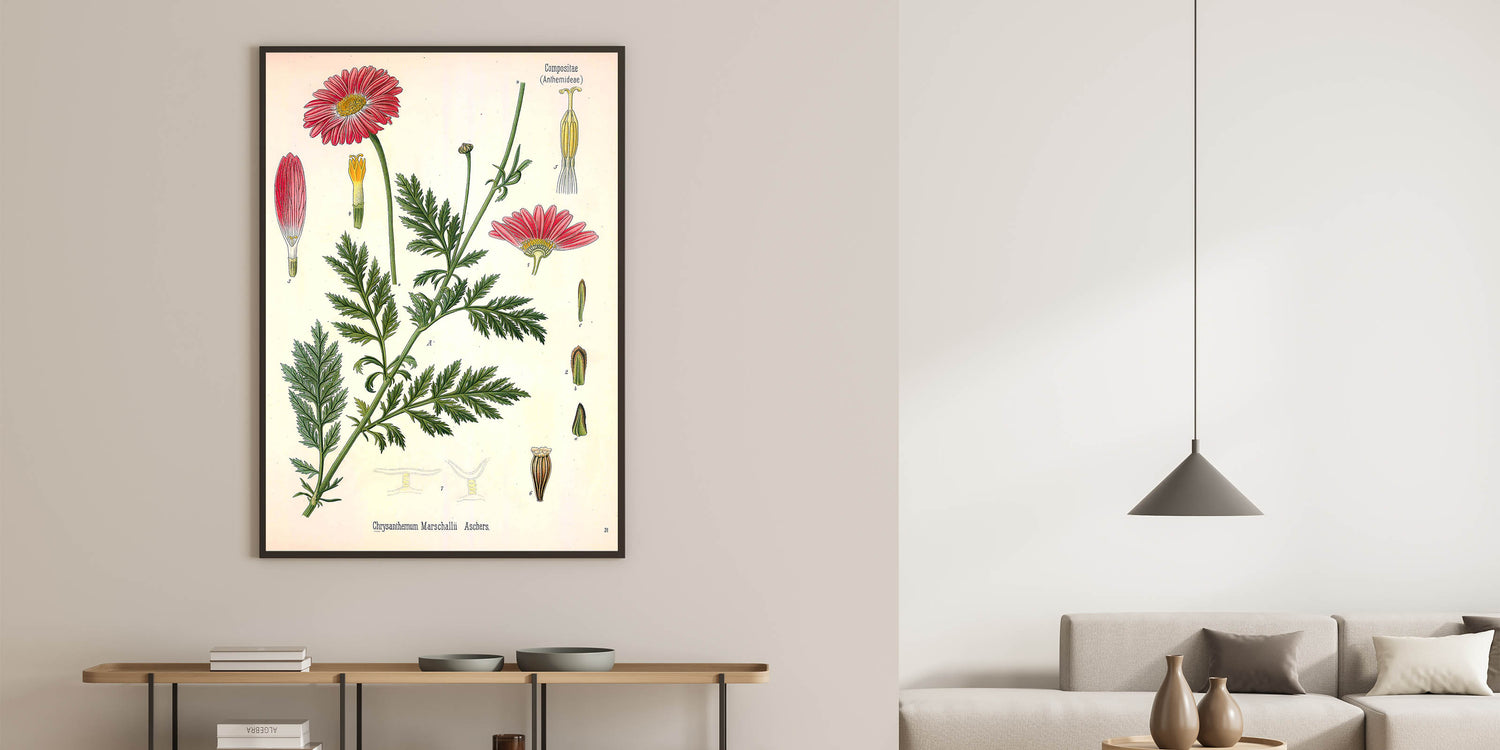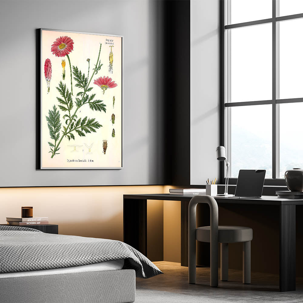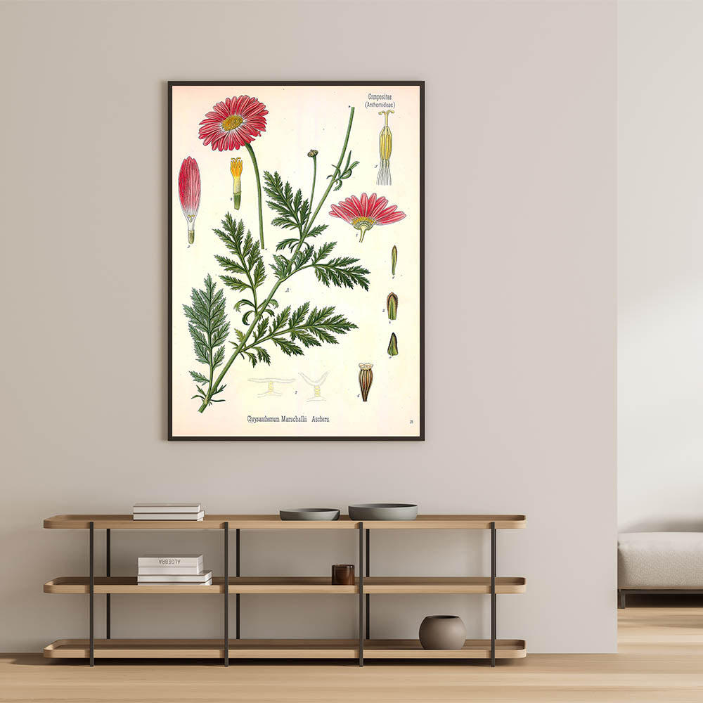 Elevate your space with this stunning botanical art print showcasing the vibrant red Chrysanthemum Marschalii. The detailed illustration captures the rich red petals and green foliage, adding a touch of vintage botanical charm to any room. Perfect for nature lovers and vintage art enthusiasts, this print is a timeless addition to your home decor.