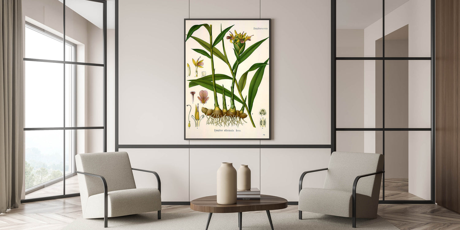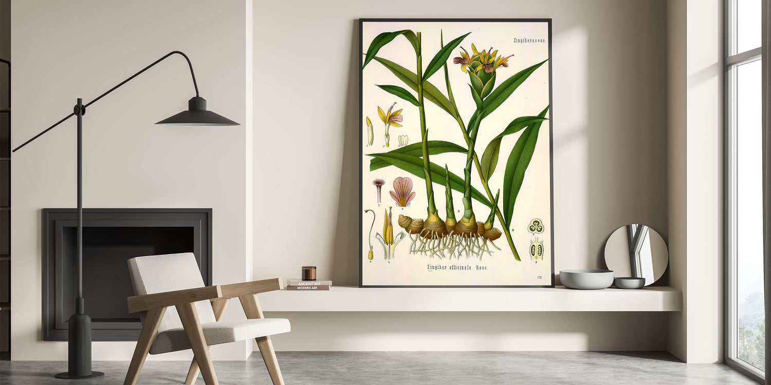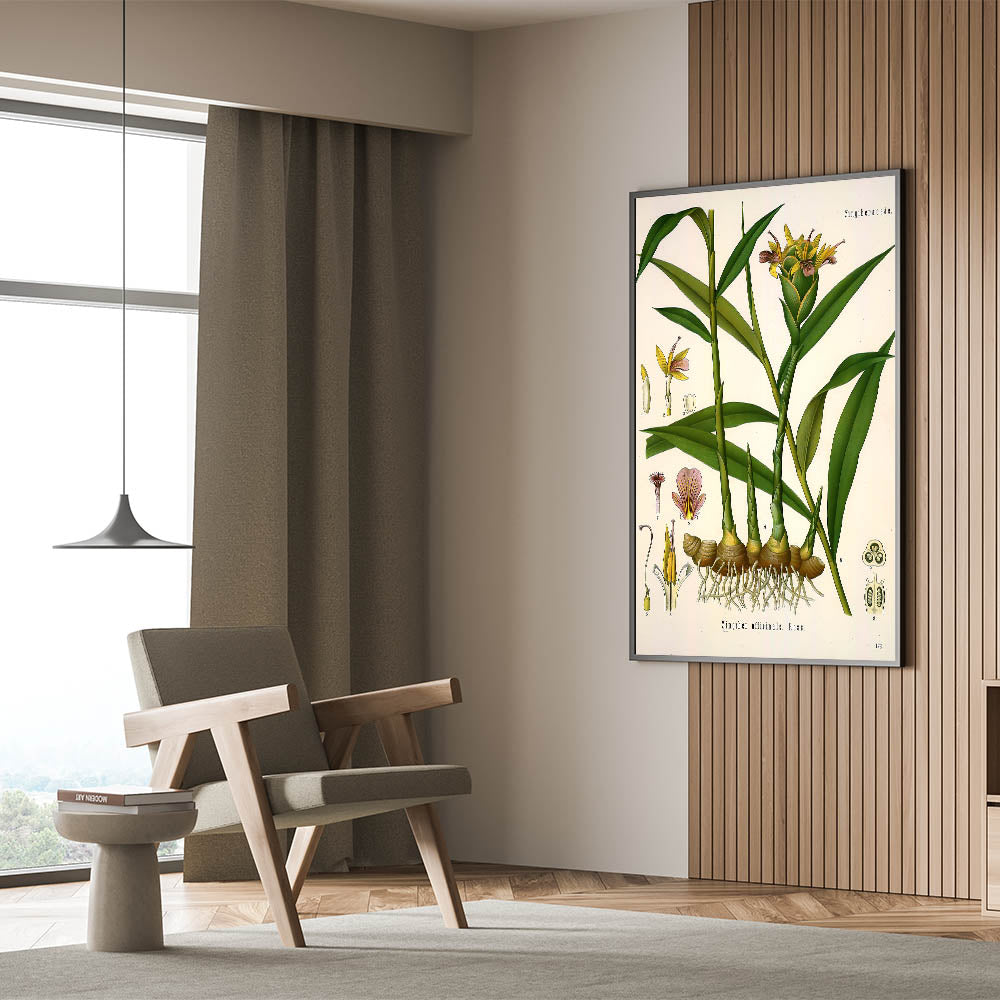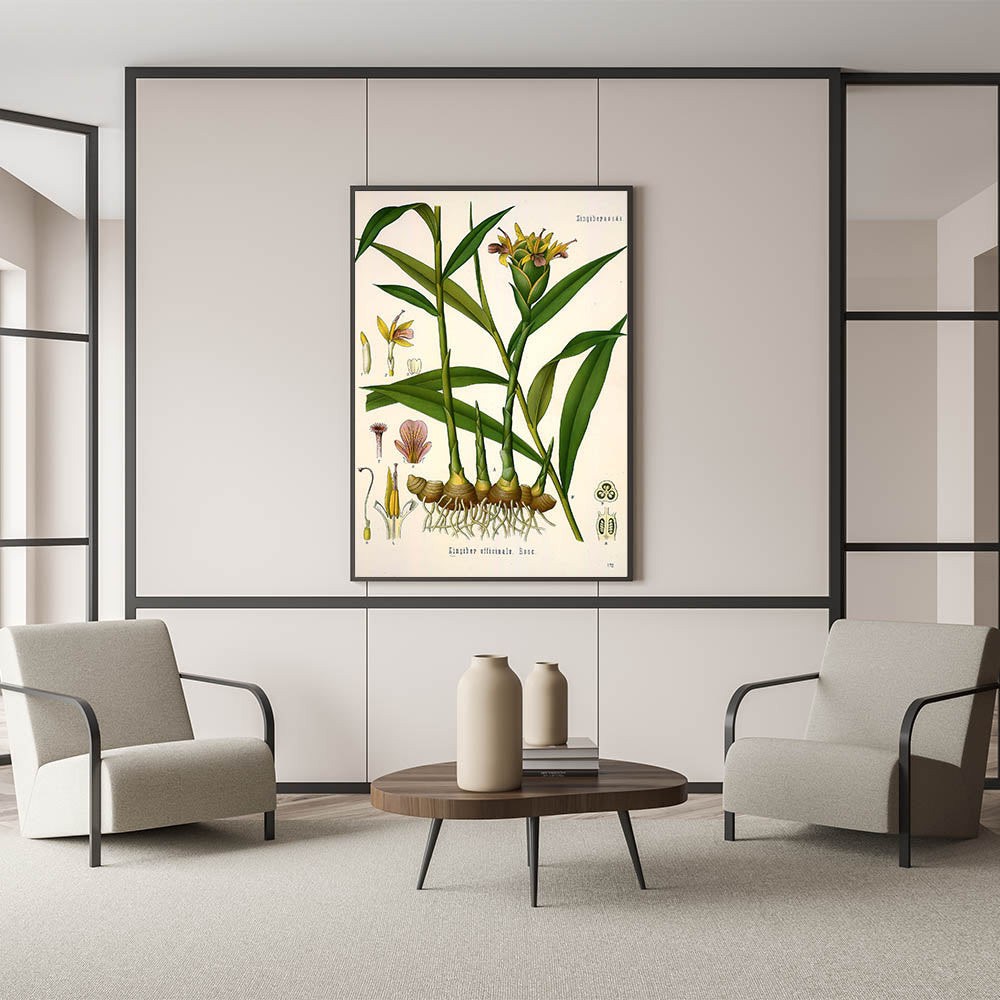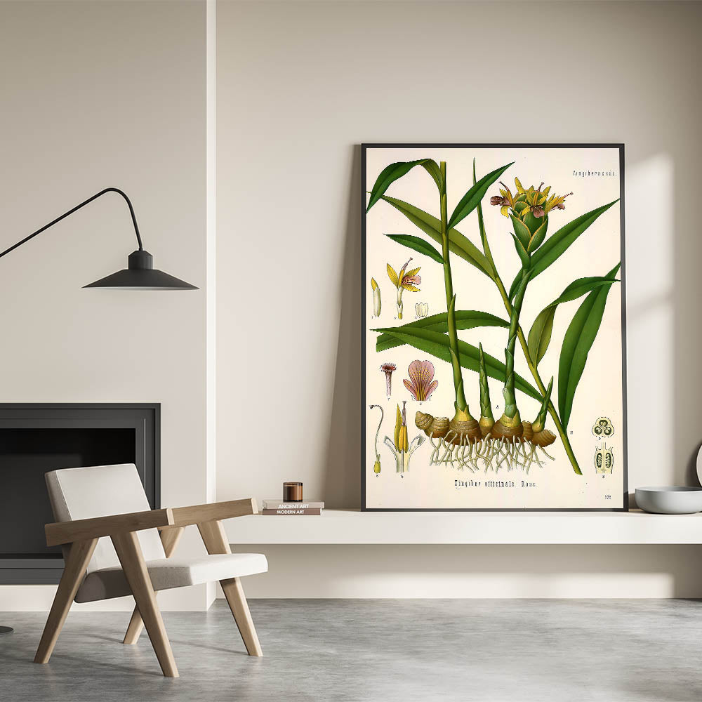 Bring a touch of nature into your home with this vintage botanical art print of Zingiber Officinale, commonly known as ginger. Featuring vibrant green stems, elegant yellow flowers, and detailed roots, this botanical illustration captures the essence of natural beauty. Perfect for botanical wall art lovers and nature-inspired decor enthusiasts, this print brings timeless charm to any space.