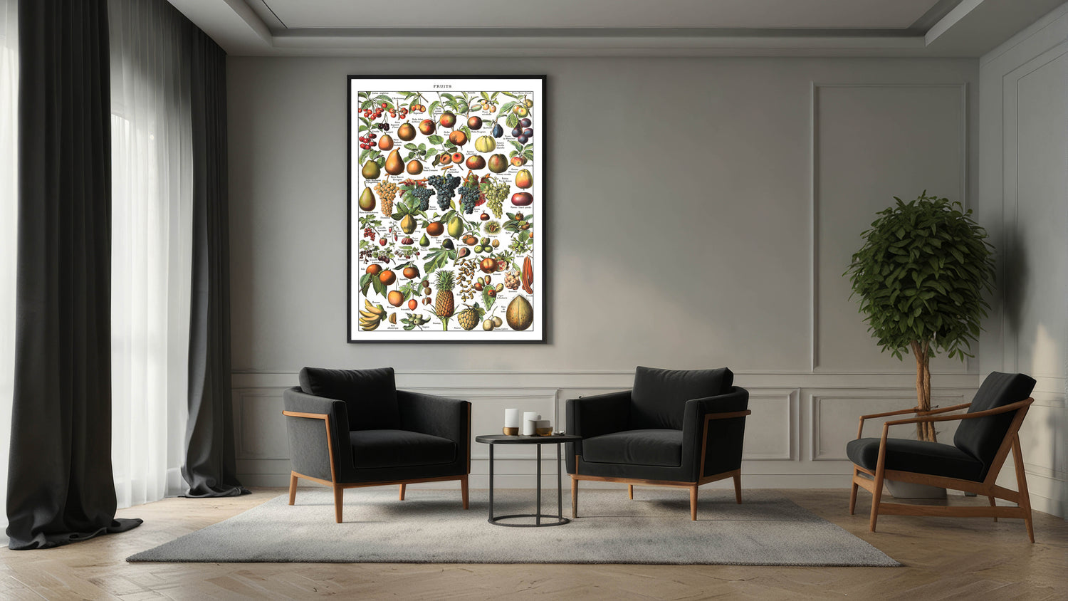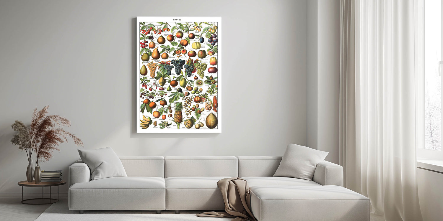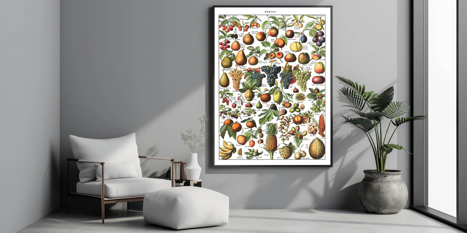 This botanical wall art is perfect for adding a touch of elegance to kitchens, living rooms, or offices. It’s a beautiful way to highlight nature’s diverse bounty and celebrate the beauty of fruits in their finest form.