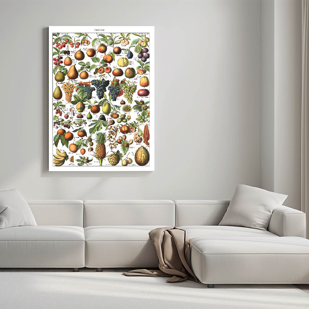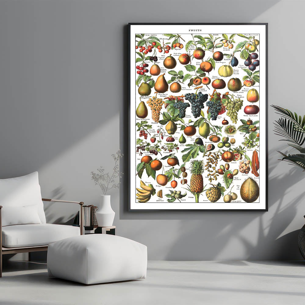 Bring the beauty of nature into your home with this vintage botanical art print. Featuring a detailed collection of fruits, this botanical illustration art beautifully showcases a variety of fruits like grapes, pineapples, bananas, and apples, capturing the essence of natural beauty. Whether you're a nature enthusiast or an art lover, this piece blends vintage charm with nature-inspired decor, making it a perfect addition to any room.