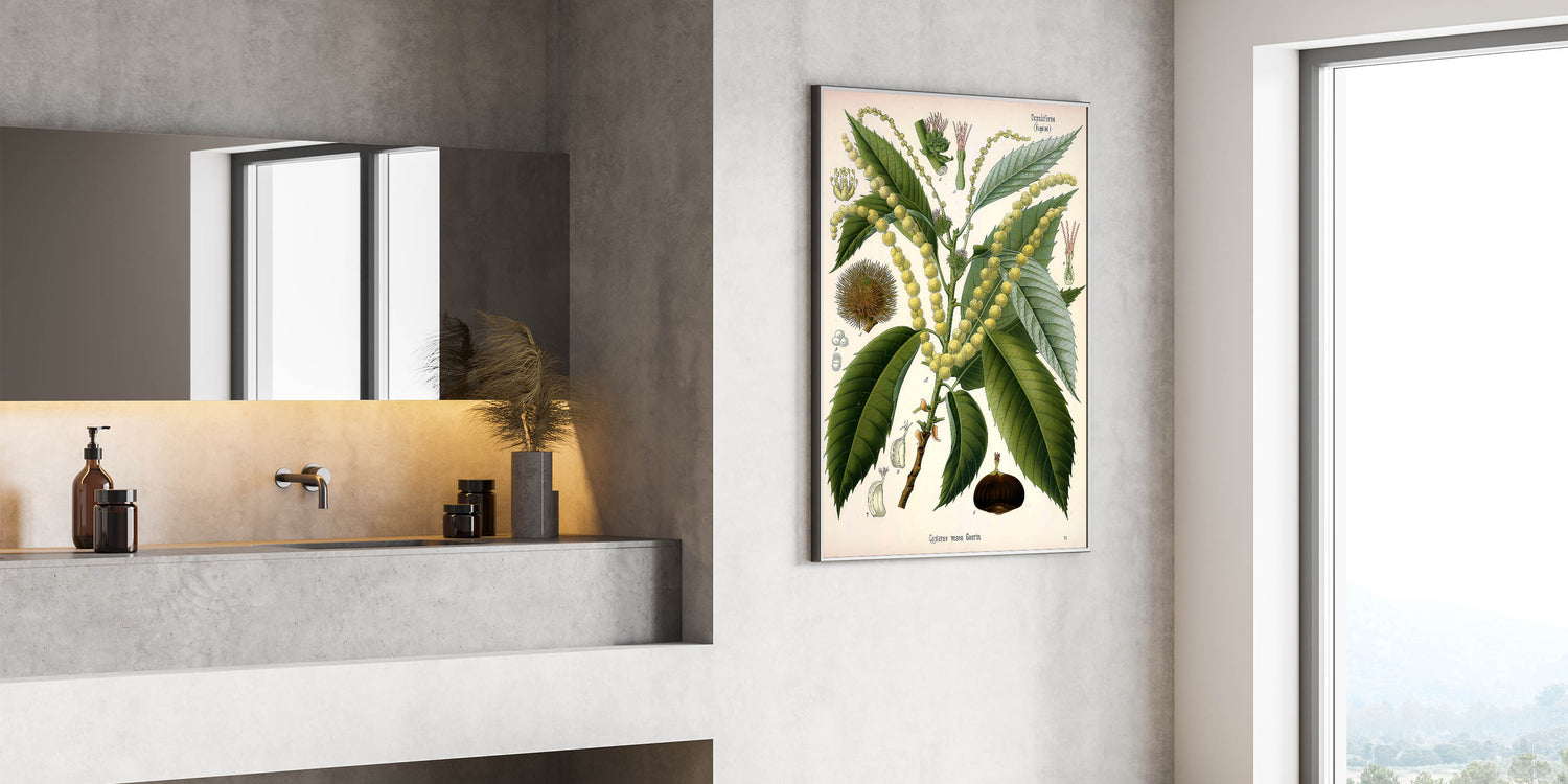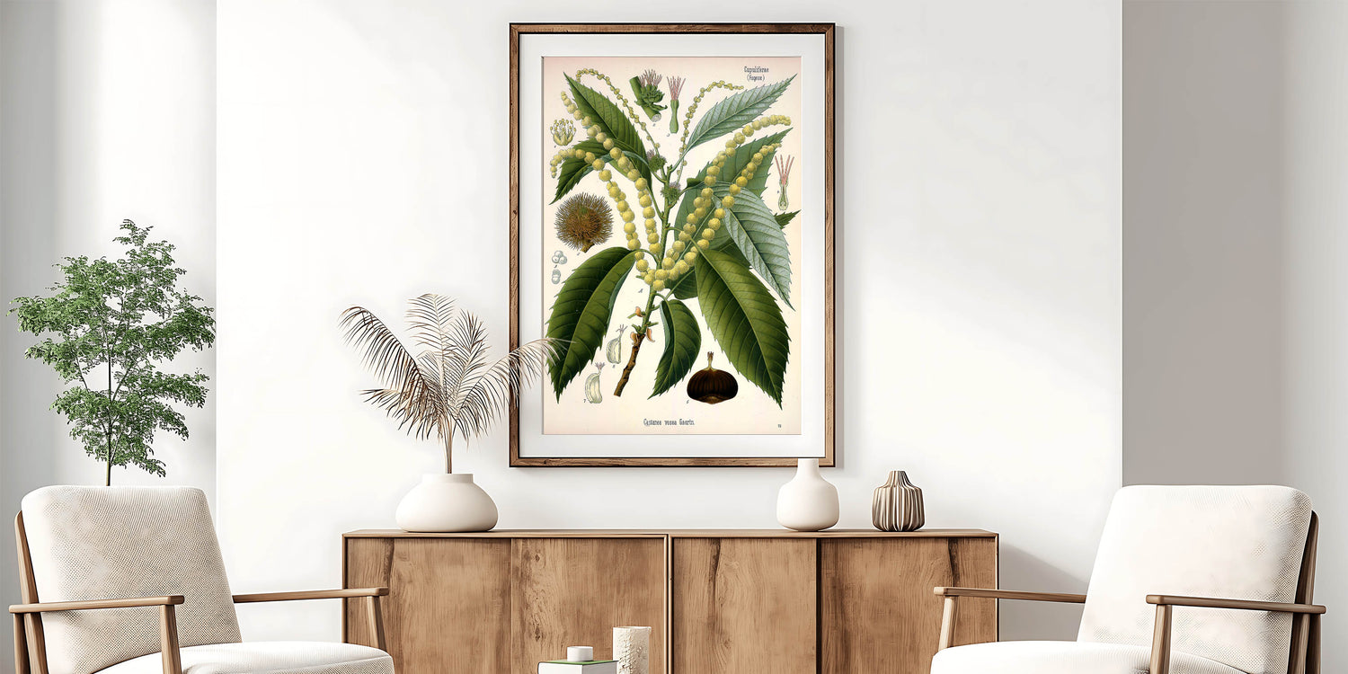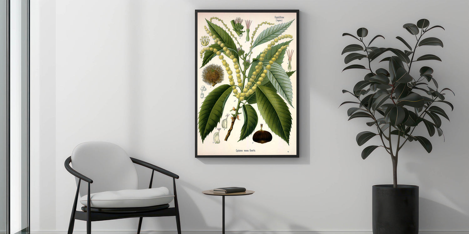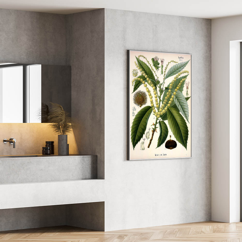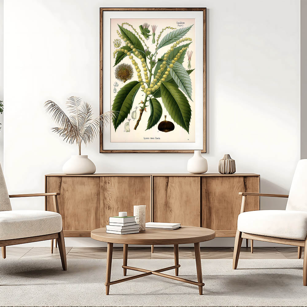 Bring the beauty of nature into your home with this vintage botanical illustration of Castanea vesca Gaertn., the chestnut tree. This piece captures the tree’s stunning leaves, unique yellow flowers, and distinctive chestnut fruit in exquisite detail. Perfect for adding nature-inspired decor to your living room, study, or office, this botanical art print celebrates the timeless elegance of vintage botanical illustrations. With its intricate design, it makes a striking focal point in any space, ideal for nature lovers and botanical art enthusiasts.
