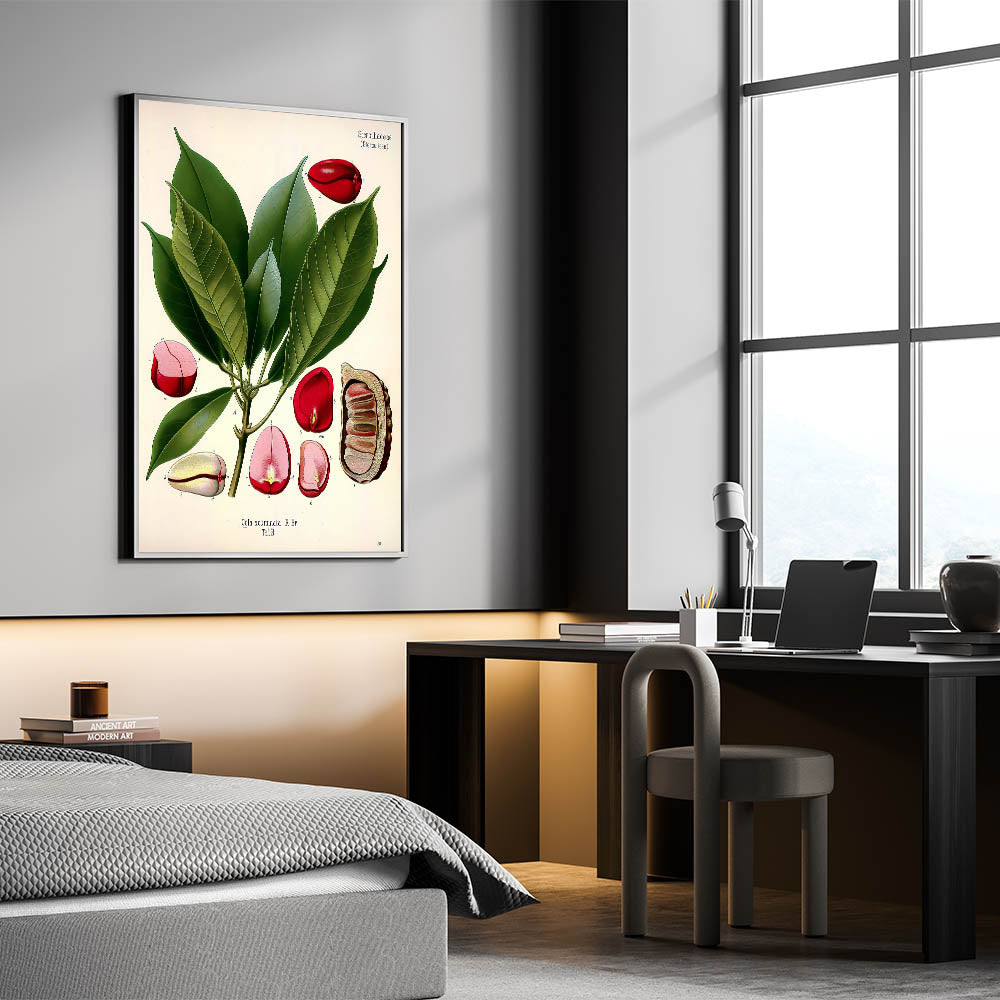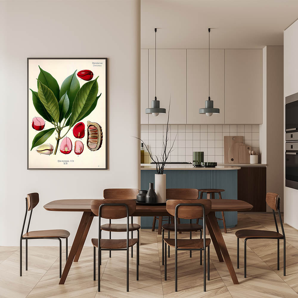 This vintage botanical art print features the detailed illustration of the Cola Acuminata, with vibrant green leaves and the striking red seeds. The deep red and pink tones of the seeds contrasted with the green foliage create a bold and elegant statement piece. Perfect for nature enthusiasts and art collectors, this botanical illustration art brings a fresh touch of the outdoors to your living space.