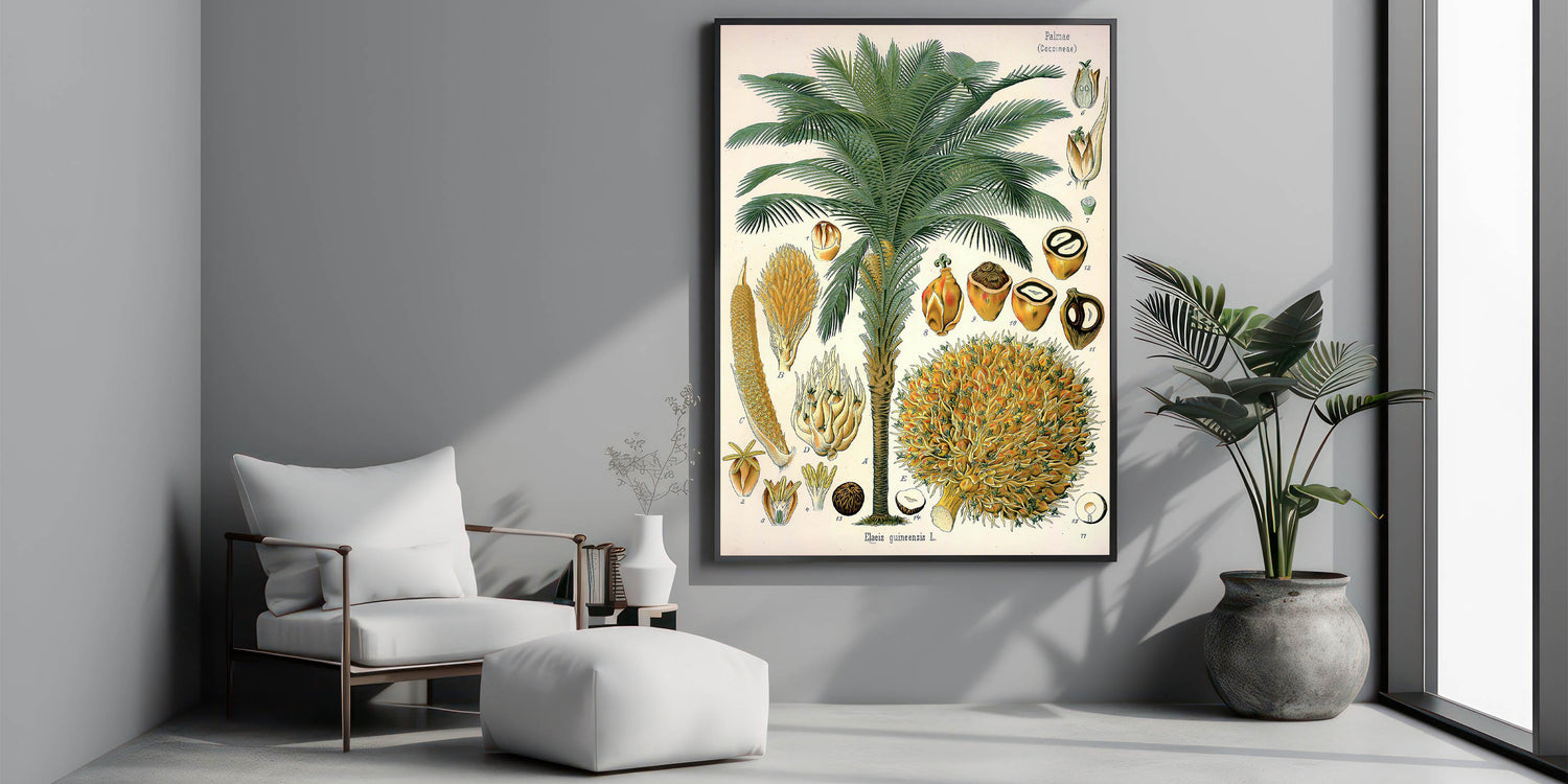 Celebrate the charm of the oil palm tree with this botanical illustration, bringing a piece of the tropics into your space.