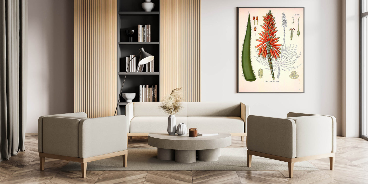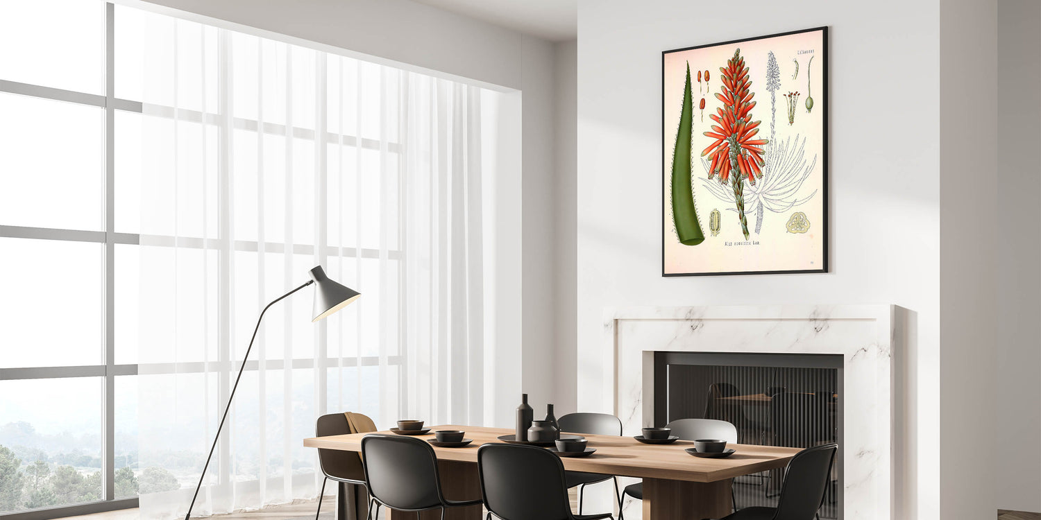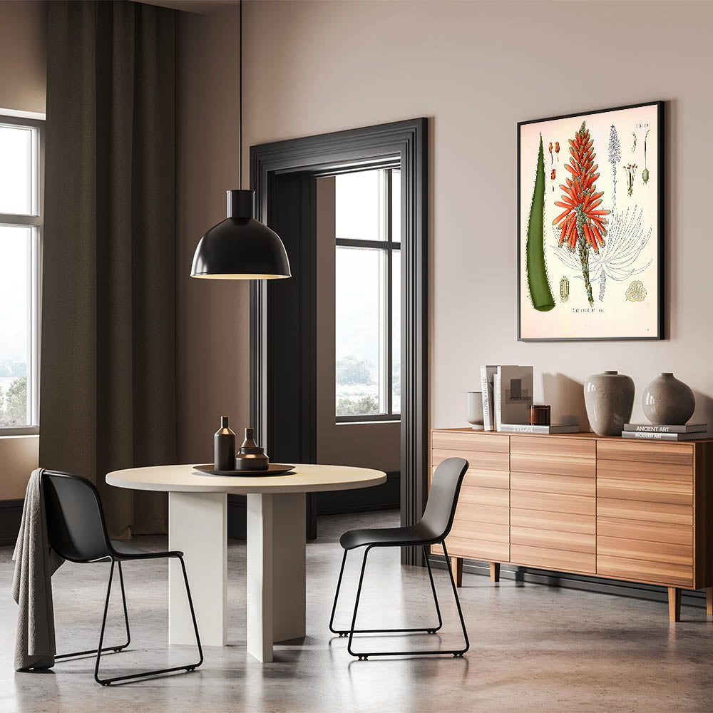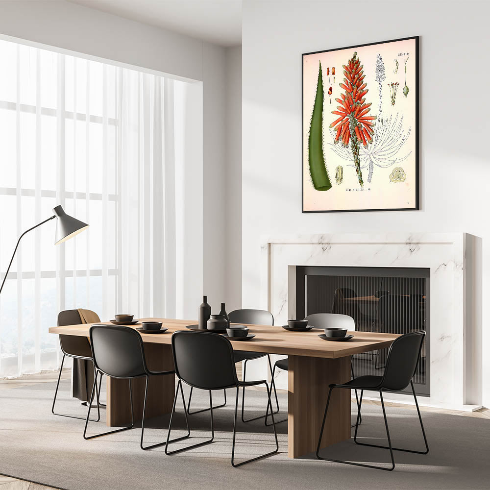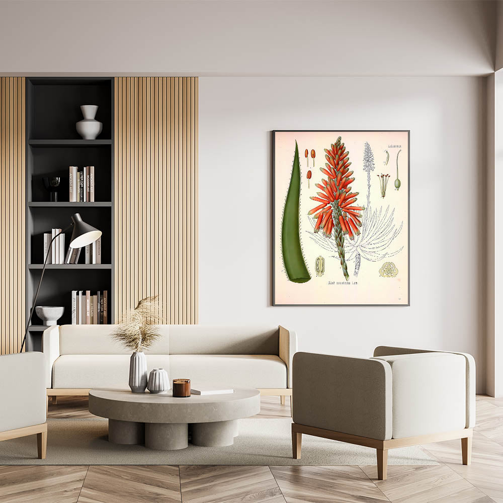 Enhance your decor with this vintage botanical illustration of the Aloe Socotrina plant. Showcasing vibrant red blossoms and rich green leaves, this artwork captures the exotic beauty of nature with intricate details and bold colors. Ideal for those who appreciate nature-inspired decor and vintage art style, this print brings a touch of sophistication to any room.