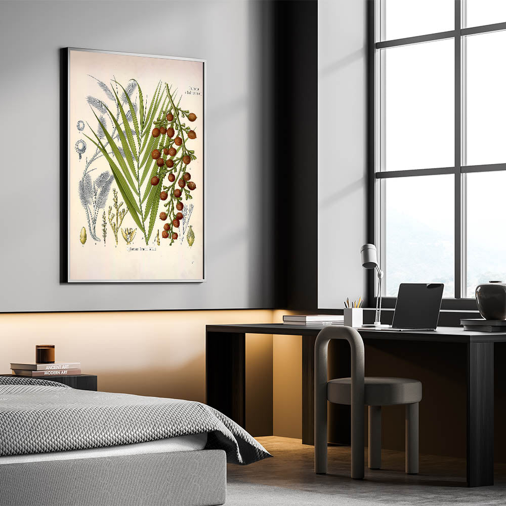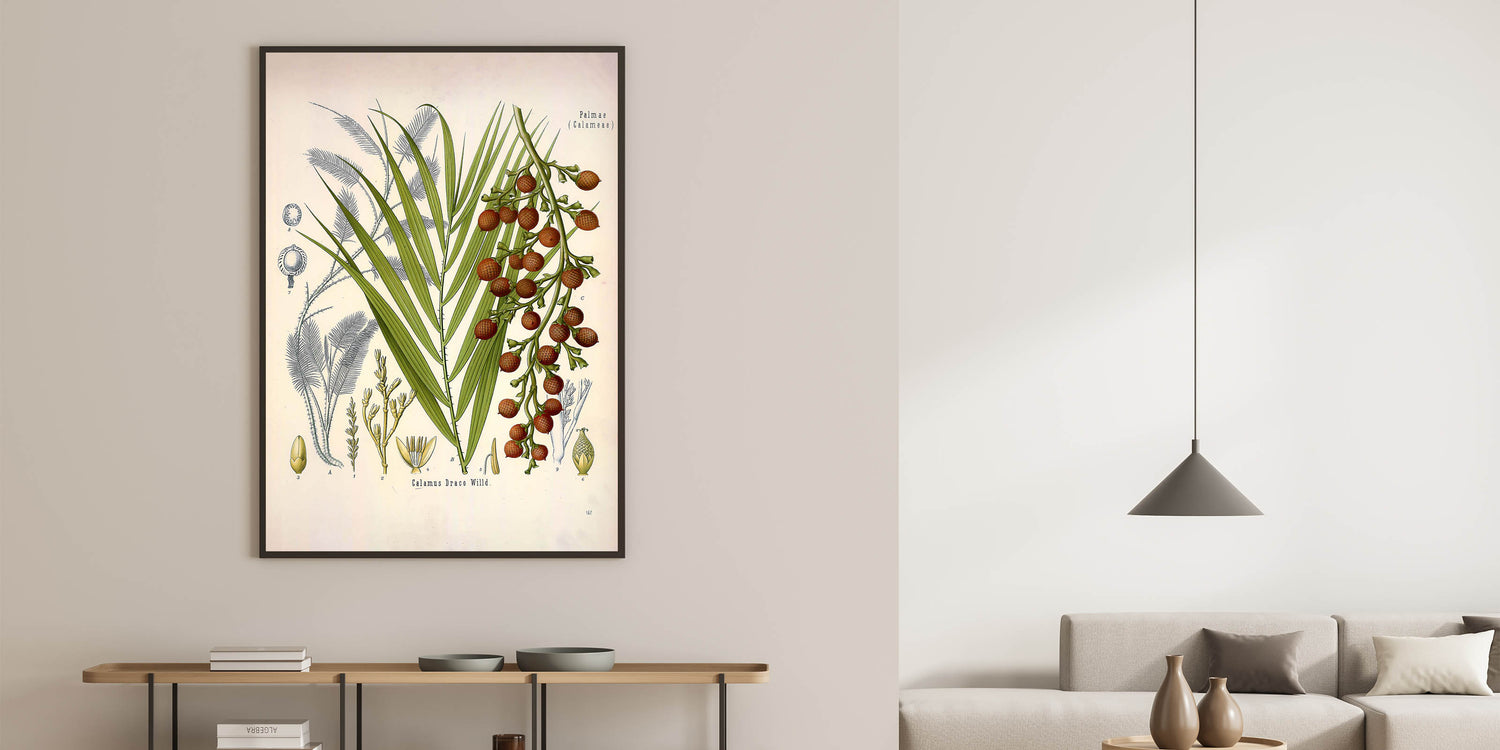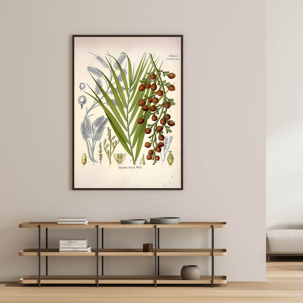 Transform your space with this detailed vintage botanical illustration of Calamus draco (Dragon's Blood Palm). Featuring elongated green leaves and clusters of textured red fruits, this art print embodies the essence of classic botanical studies. Perfect for nature lovers and those seeking to infuse a tropical yet vintage flair into their decor, this piece shines in living rooms, offices, or study spaces.