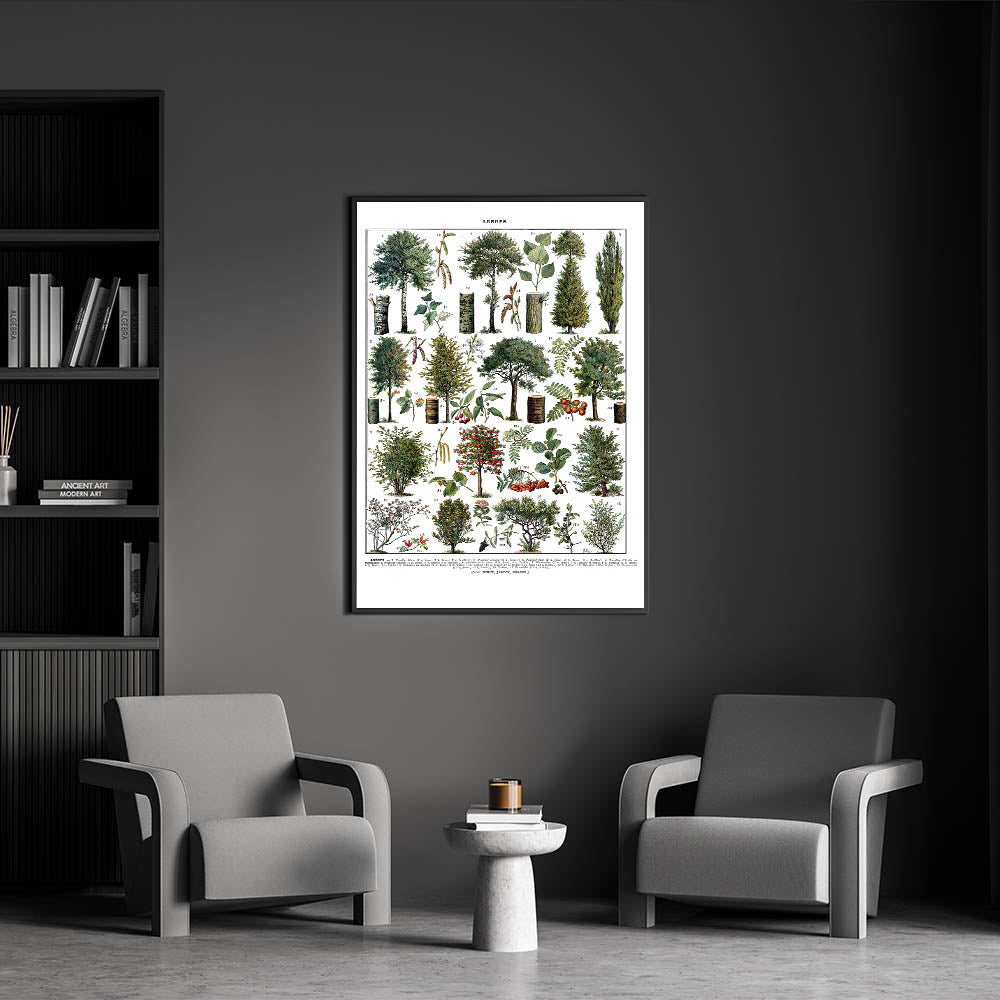 Transform your space with this vintage botanical illustration featuring a diverse collection of trees. This artwork captures the unique details of each tree's leaves, bark, and fruits with intricate precision and a harmonious blend of green and earthy tones. Ideal for nature-inspired decor and those who appreciate vintage art style, this print brings a touch of timeless elegance to any room.