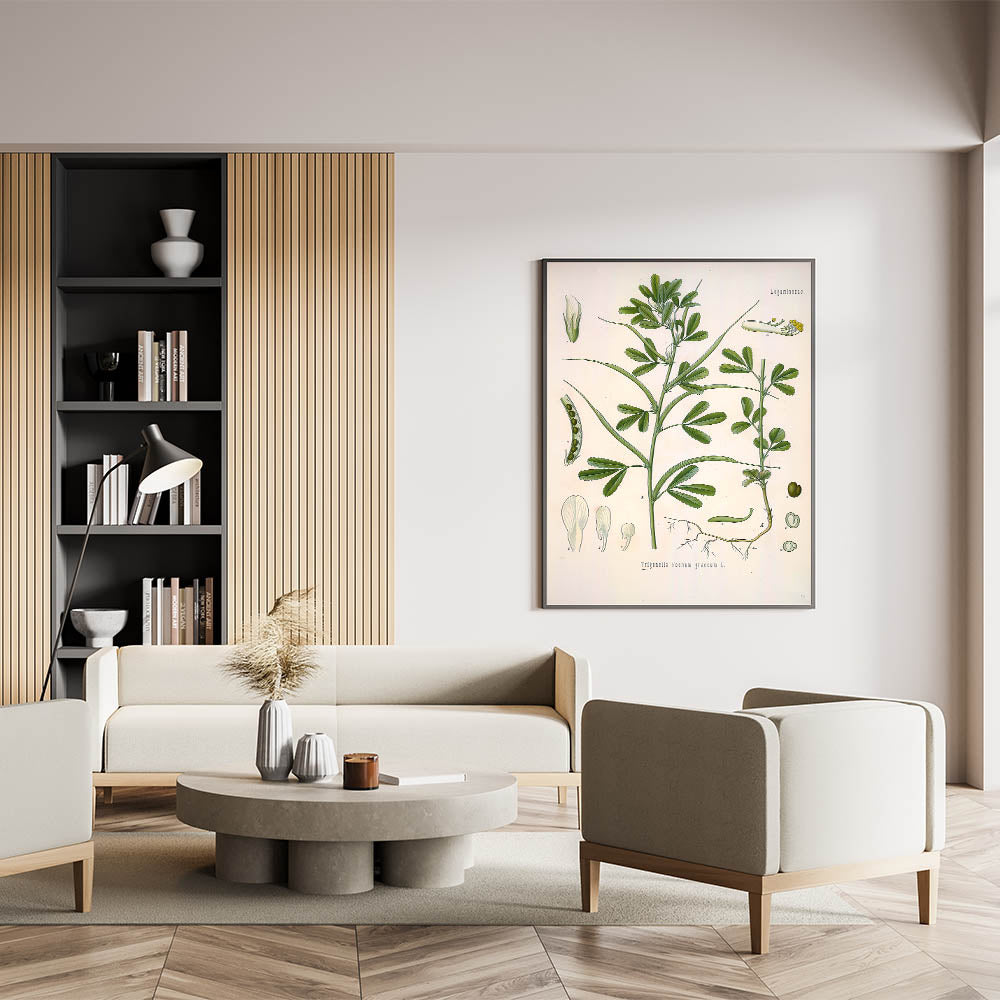 Enhance your decor with this vintage botanical illustration of the Trigonella foenum-graecum plant, commonly known as fenugreek. Featuring detailed green leaves, pods, and seeds, this artwork captures the natural beauty of herbs with intricate precision. Ideal for those who appreciate nature-inspired decor and vintage art style, this print brings a touch of timeless elegance to any room.