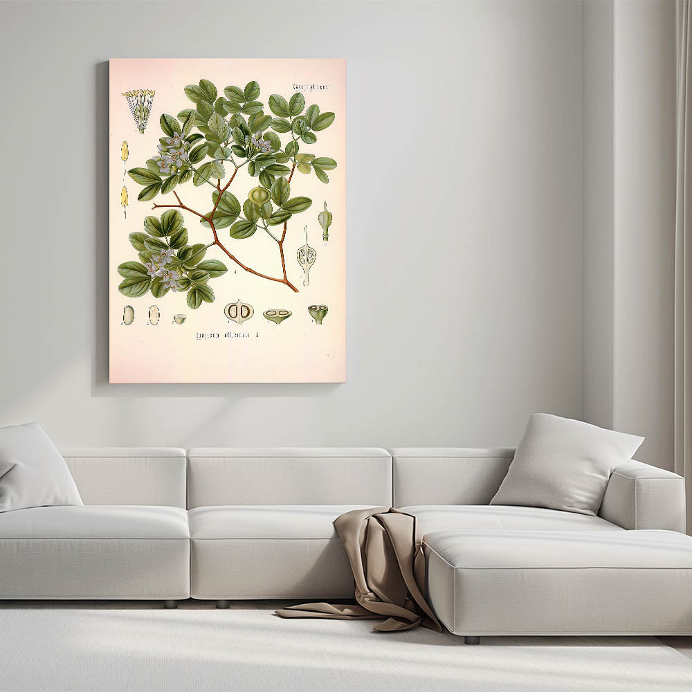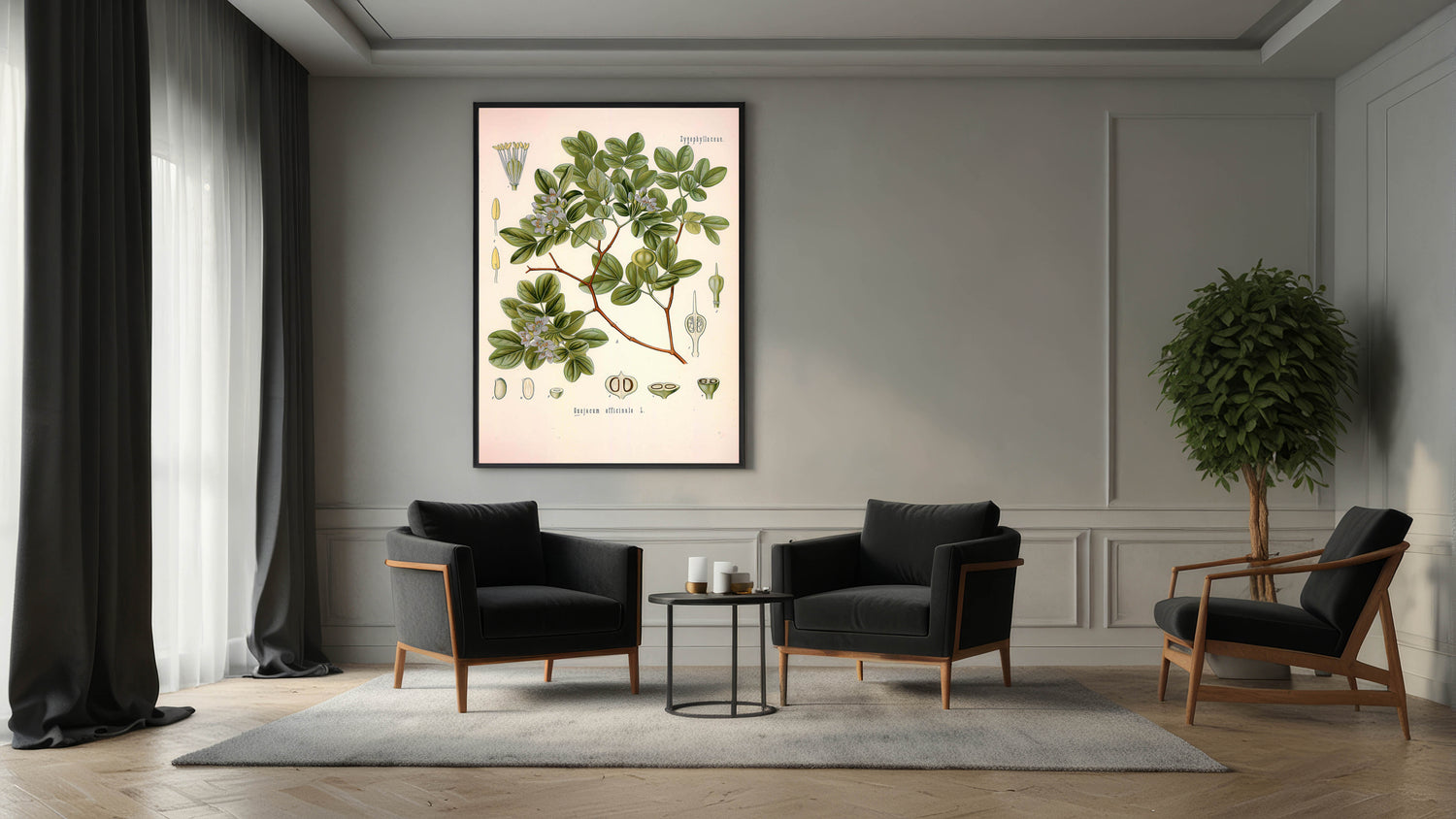 Enhance your decor with this vintage botanical illustration of Guaiacum officinale L.. This artwork beautifully captures the lush green leaves and delicate pale blue blossoms of the guaiacum plant, presenting a harmonious blend of nature's elegance and historical artistry. The intricate details of the flowers and seed pods add depth and sophistication to this print, making it an ideal choice for those who appreciate nature-inspired decor and vintage art style.