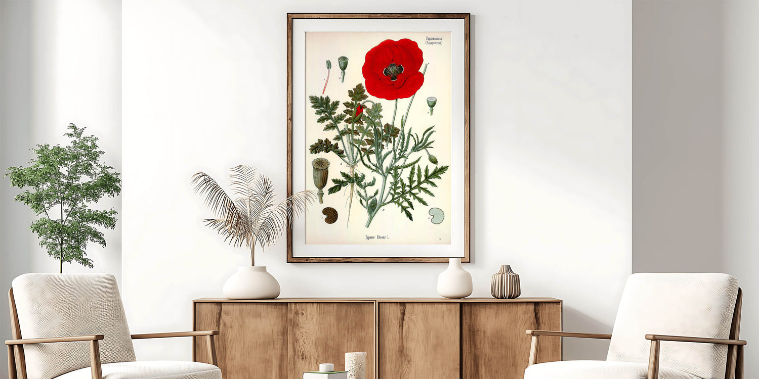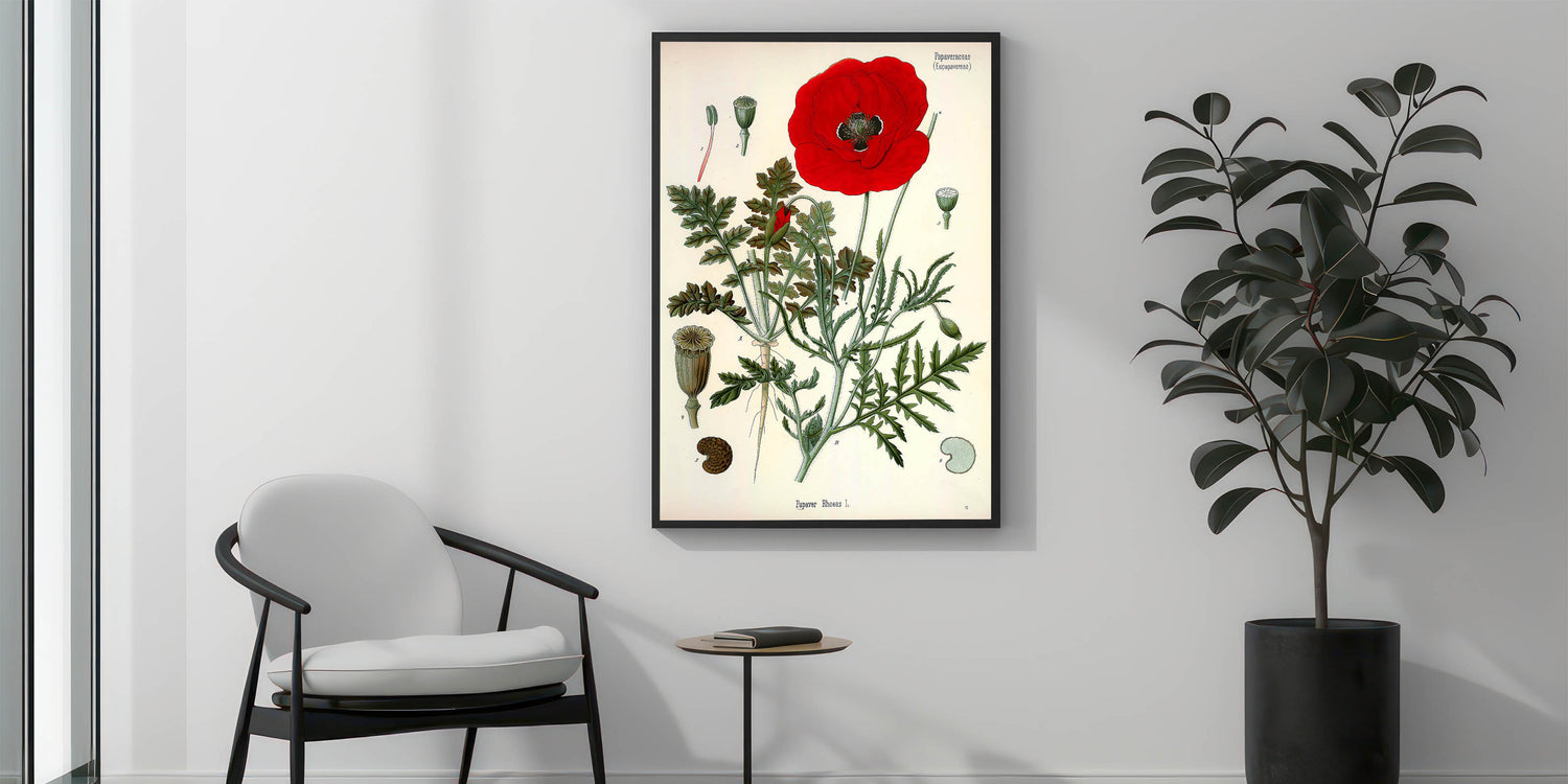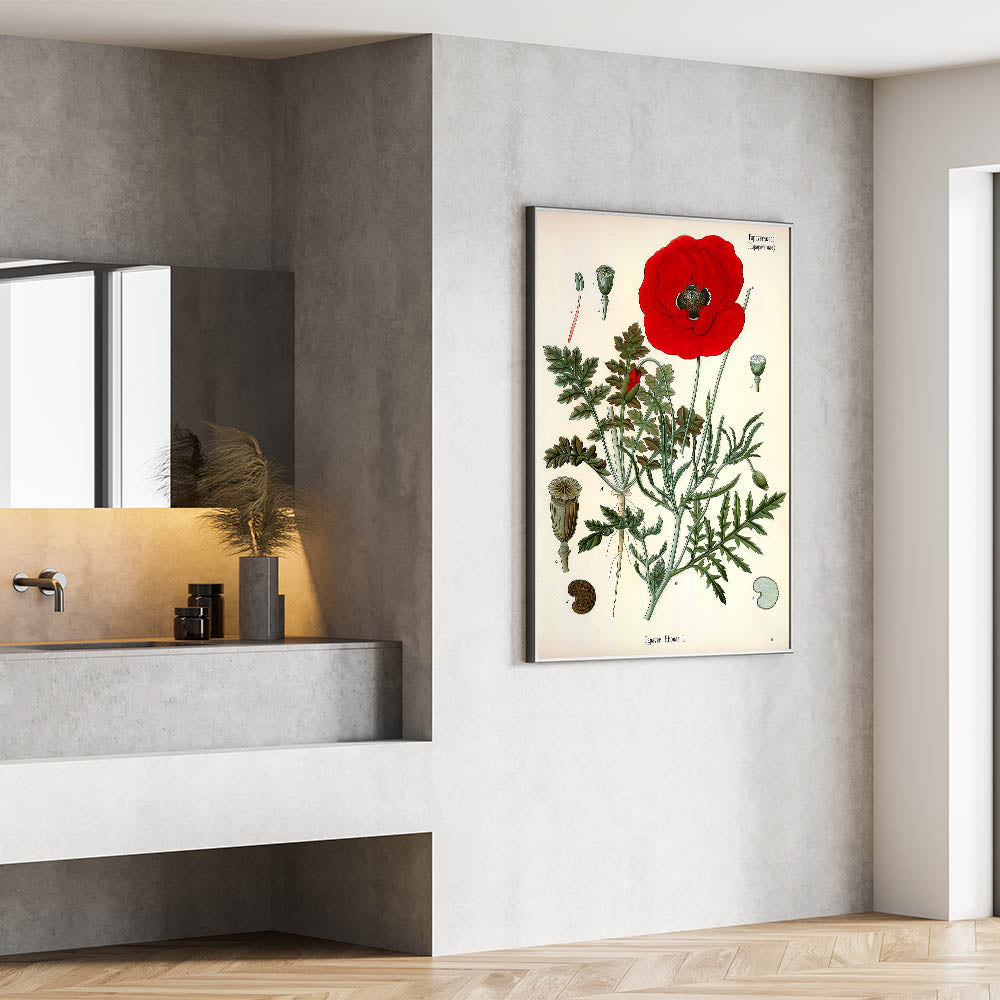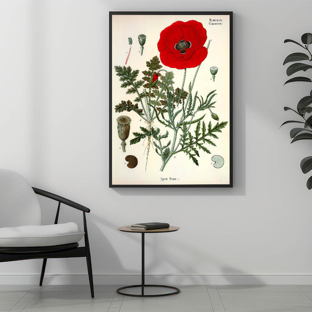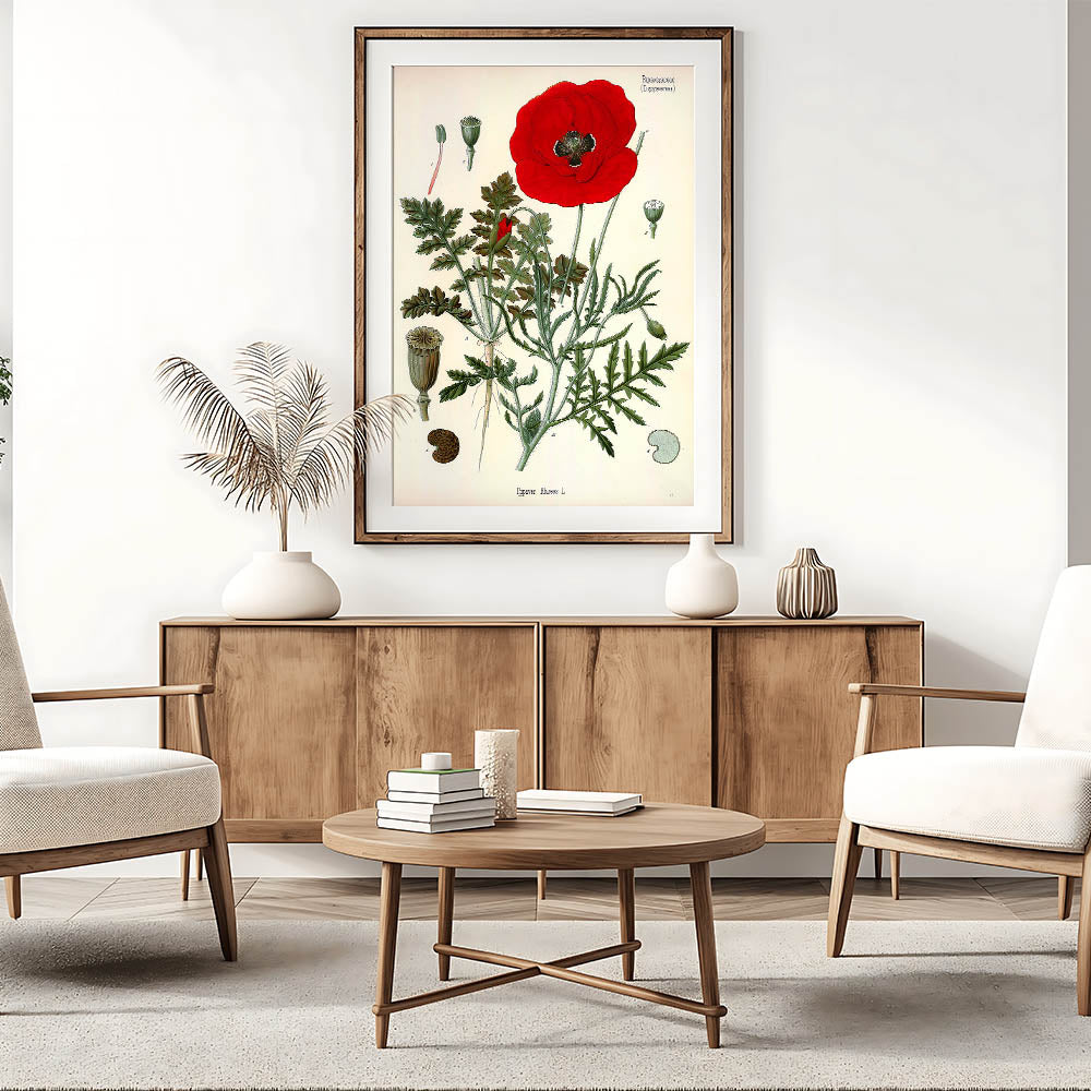 Add a touch of timeless beauty to your space with this vintage botanical illustration of Papaver Rhoeas (Common Poppy). This art print showcases the vivid red petals and intricate green foliage in exquisite detail, capturing the elegance of nature with a classic vintage flair. Perfect for living rooms, bedrooms, or offices seeking a bold yet natural accent.