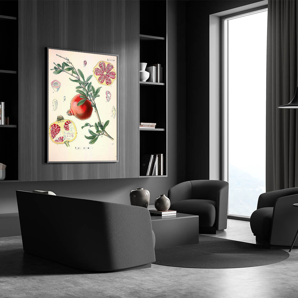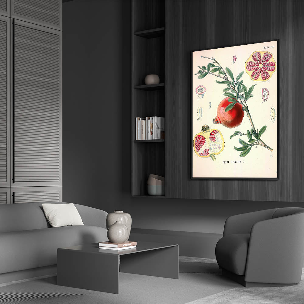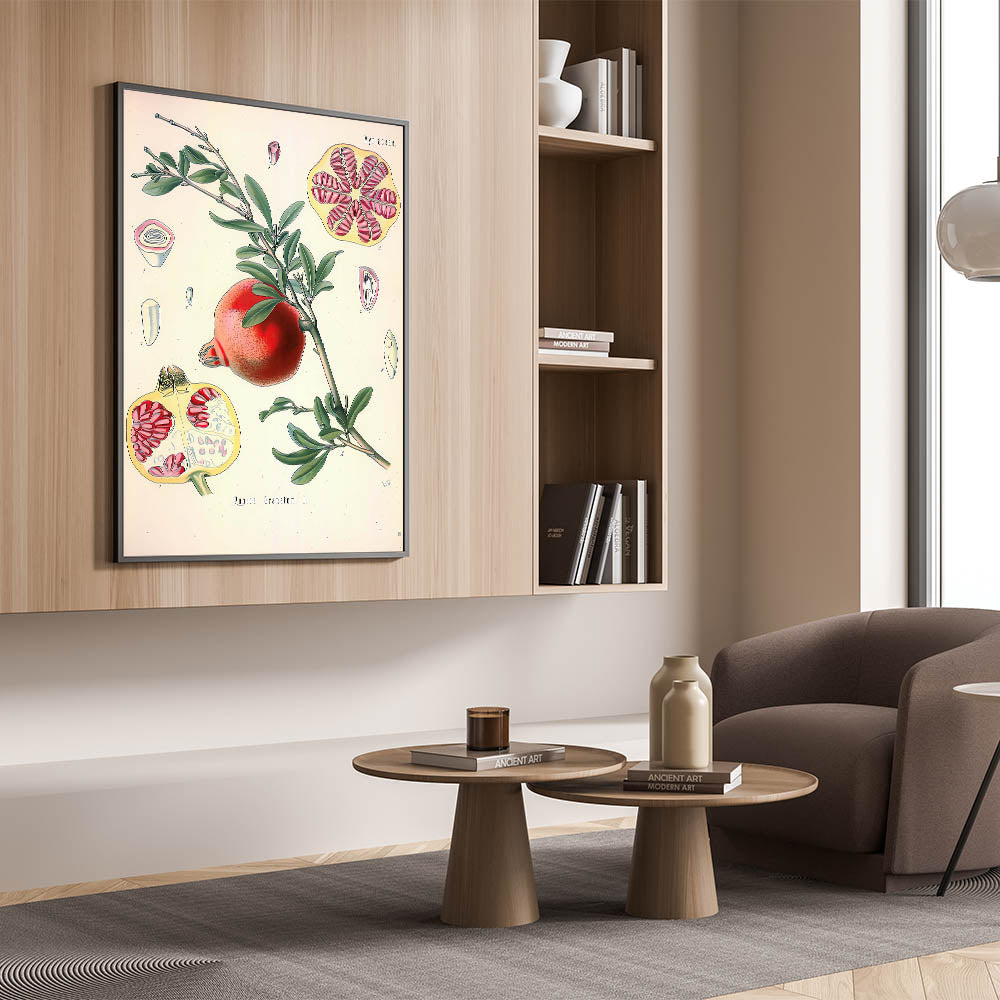 Bring the richness of nature indoors with this vintage botanical illustration of the Pomegranate fruit (Punica Granatum L.). This artwork captures the vibrant red tones of the pomegranate and its intricate seeds, contrasted with lush green leaves, making it a stunning piece for nature-inspired decor. The detailed cross-sections of the fruit add a scientific yet artistic touch, ideal for those who appreciate vintage art style and illustrative botanical designs.