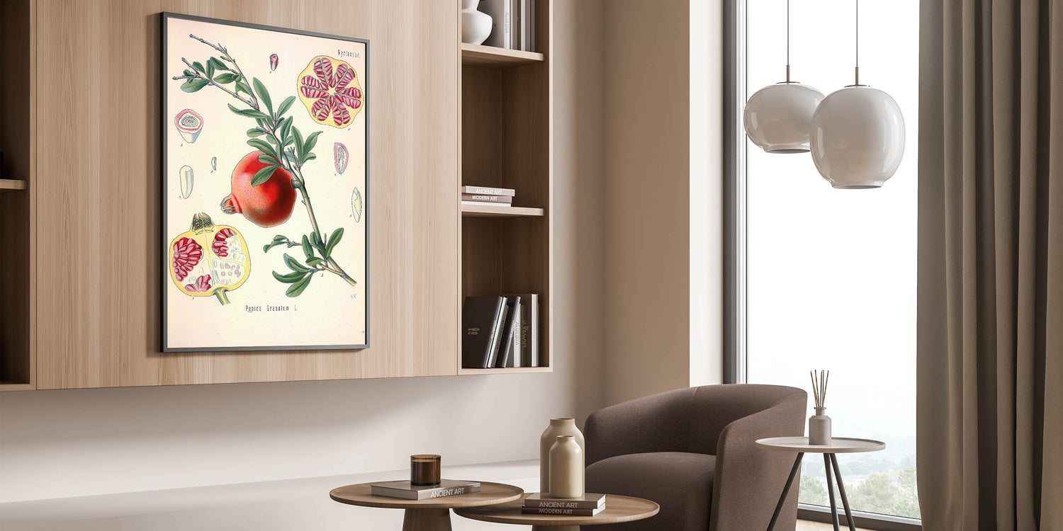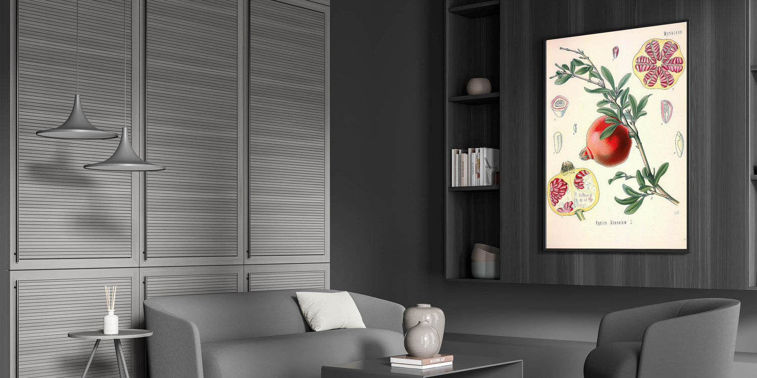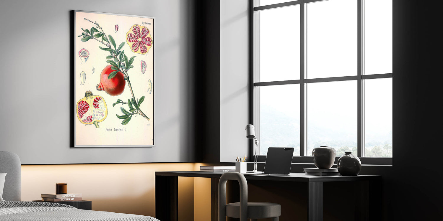 Bring the richness of nature indoors with this vintage botanical illustration of the Pomegranate fruit (Punica Granatum L.). This artwork captures the vibrant red tones of the pomegranate and its intricate seeds, contrasted with lush green leaves, making it a stunning piece for nature-inspired decor. The detailed cross-sections of the fruit add a scientific yet artistic touch, ideal for those who appreciate vintage art style and illustrative botanical designs.