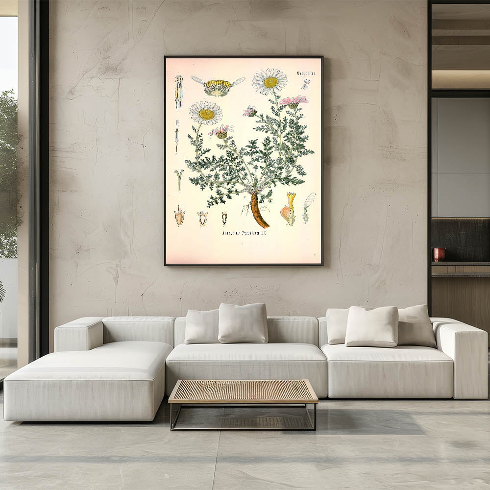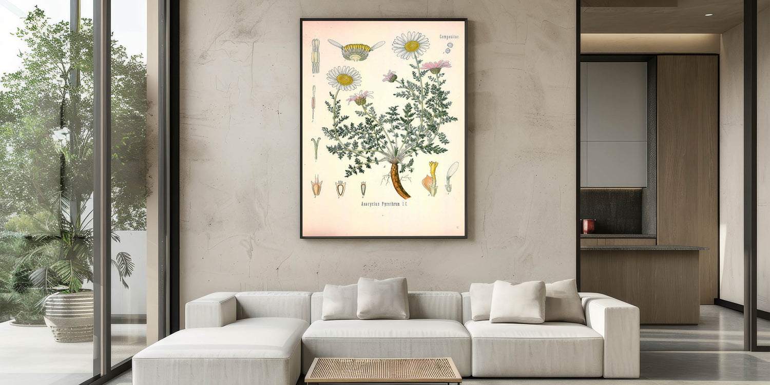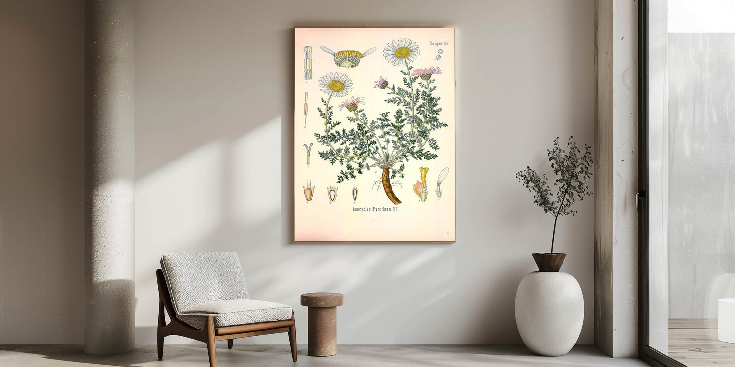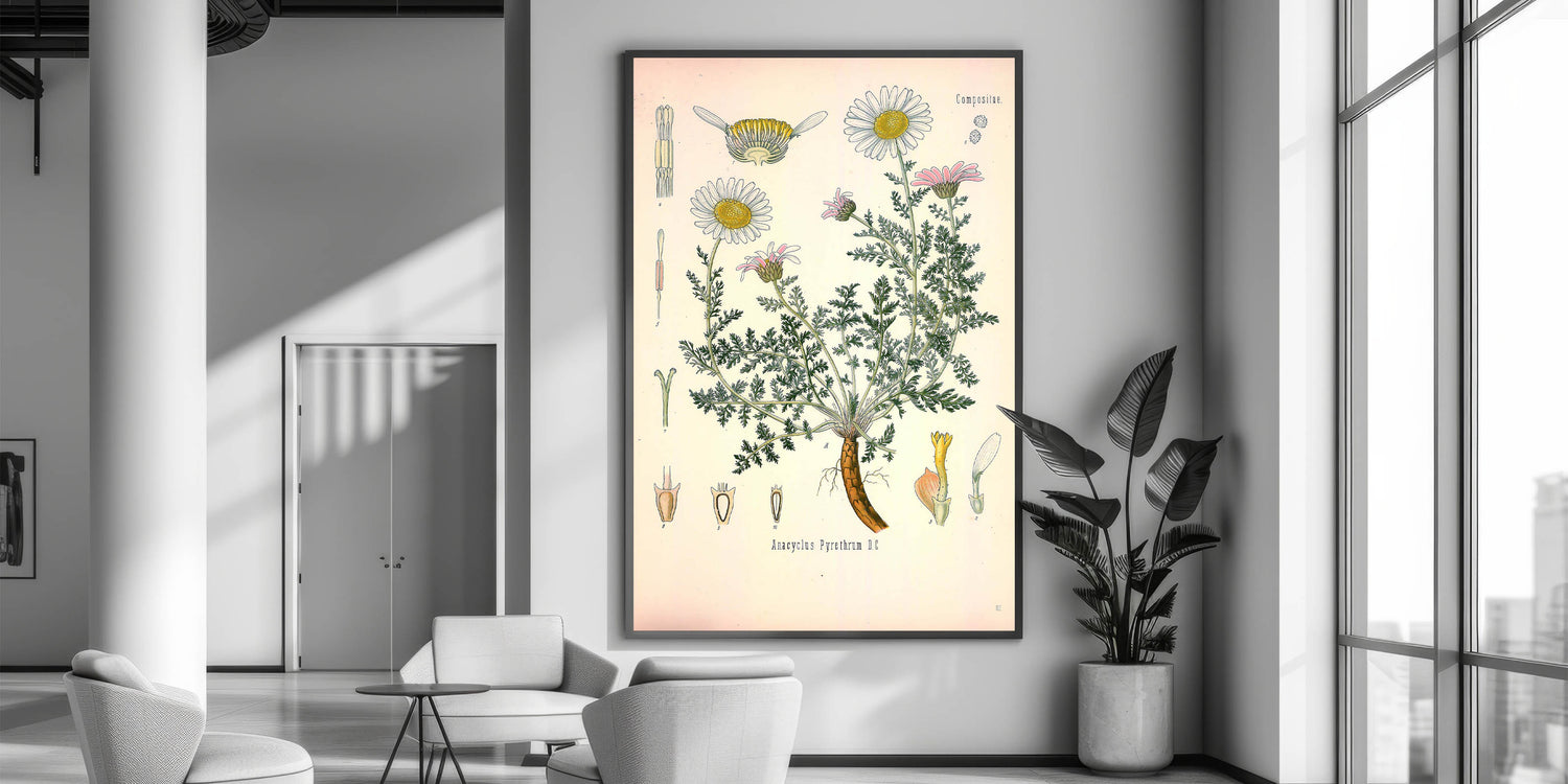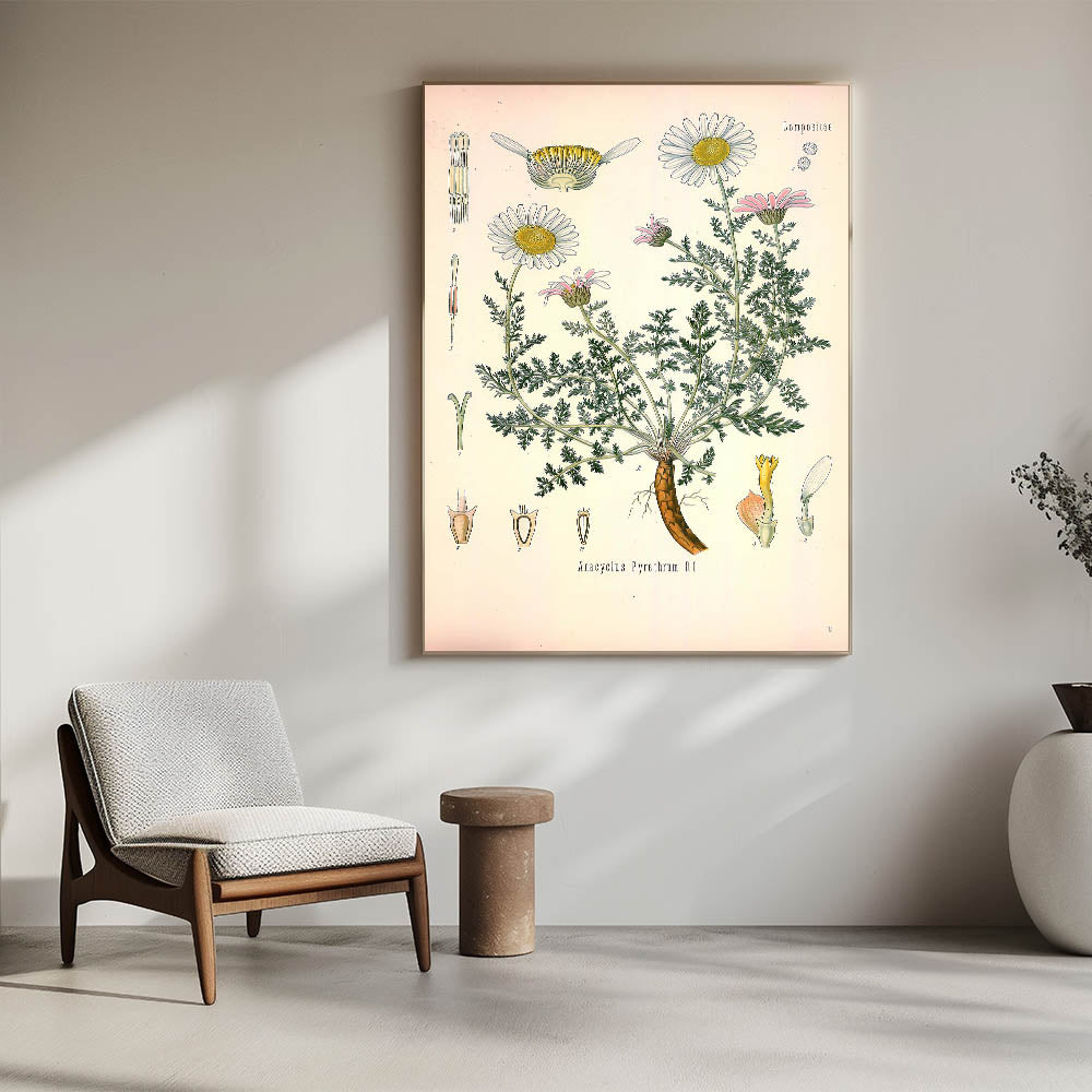 Infuse your space with nature’s charm with this vintage botanical illustration of Anacyclus Pyrethrum D.C.. This artwork beautifully portrays the delicate white and pink petals of the pyrethrum flowers, along with their detailed green foliage and roots. Ideal for those who appreciate vintage art style and nature-inspired decor, this print adds a soft, botanical elegance to any room.