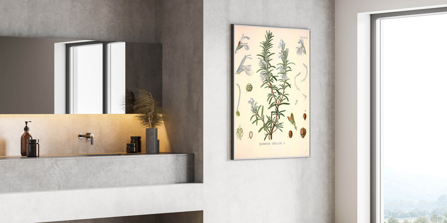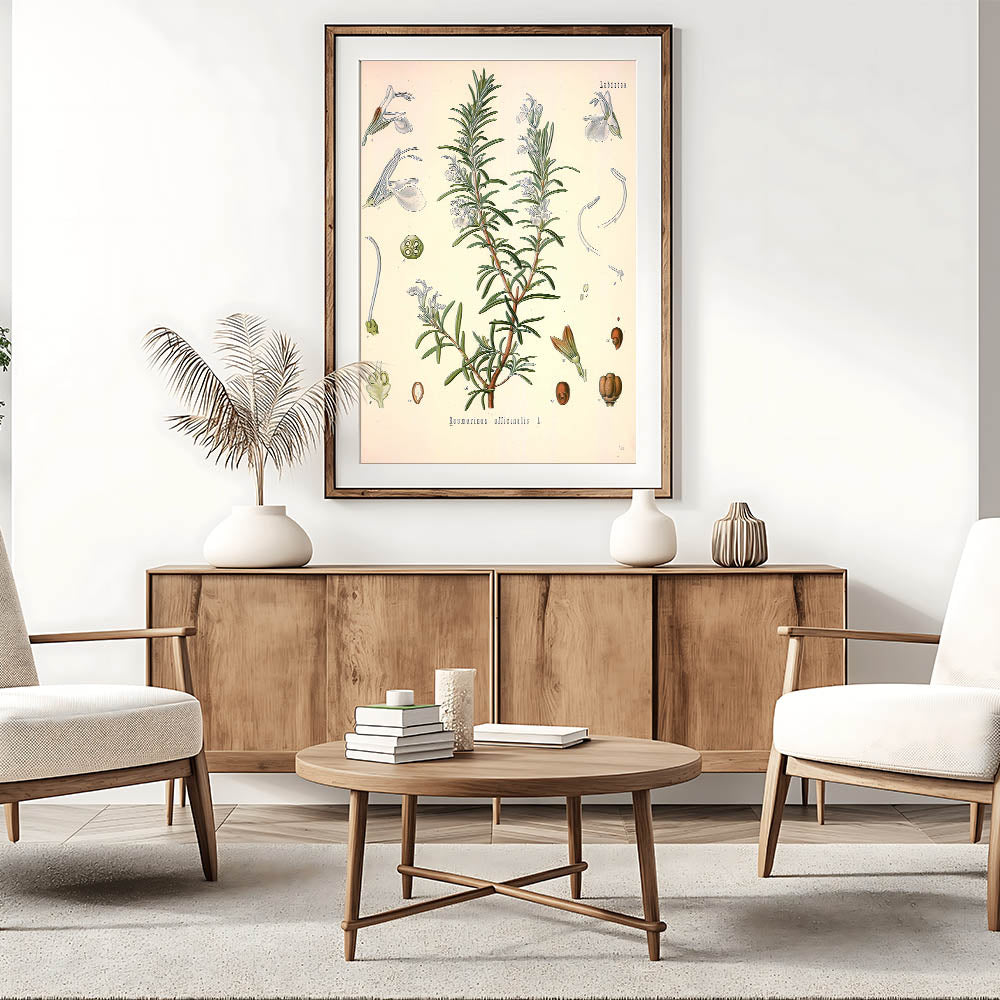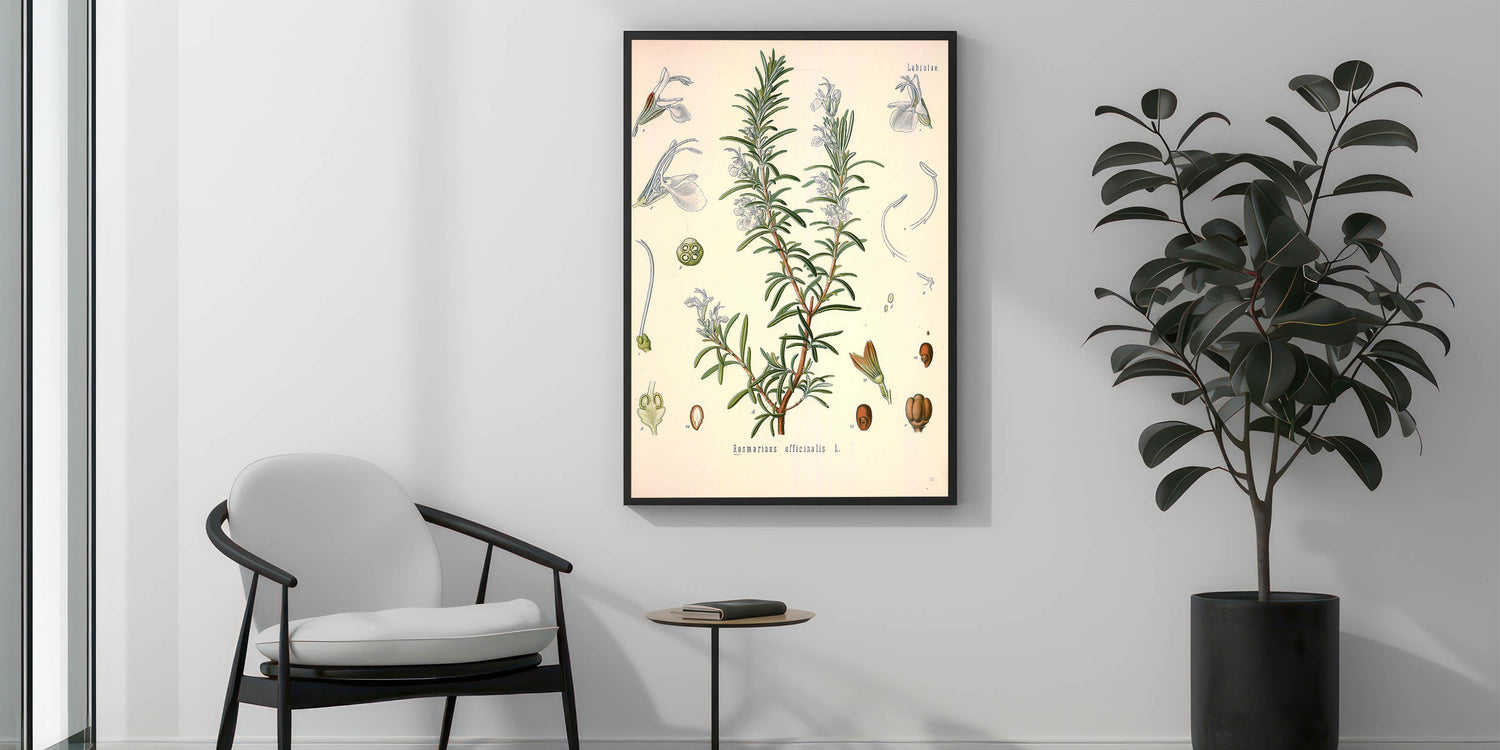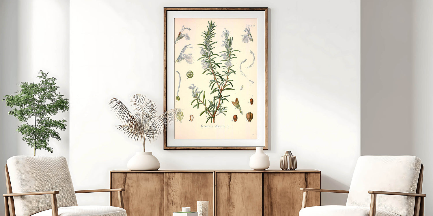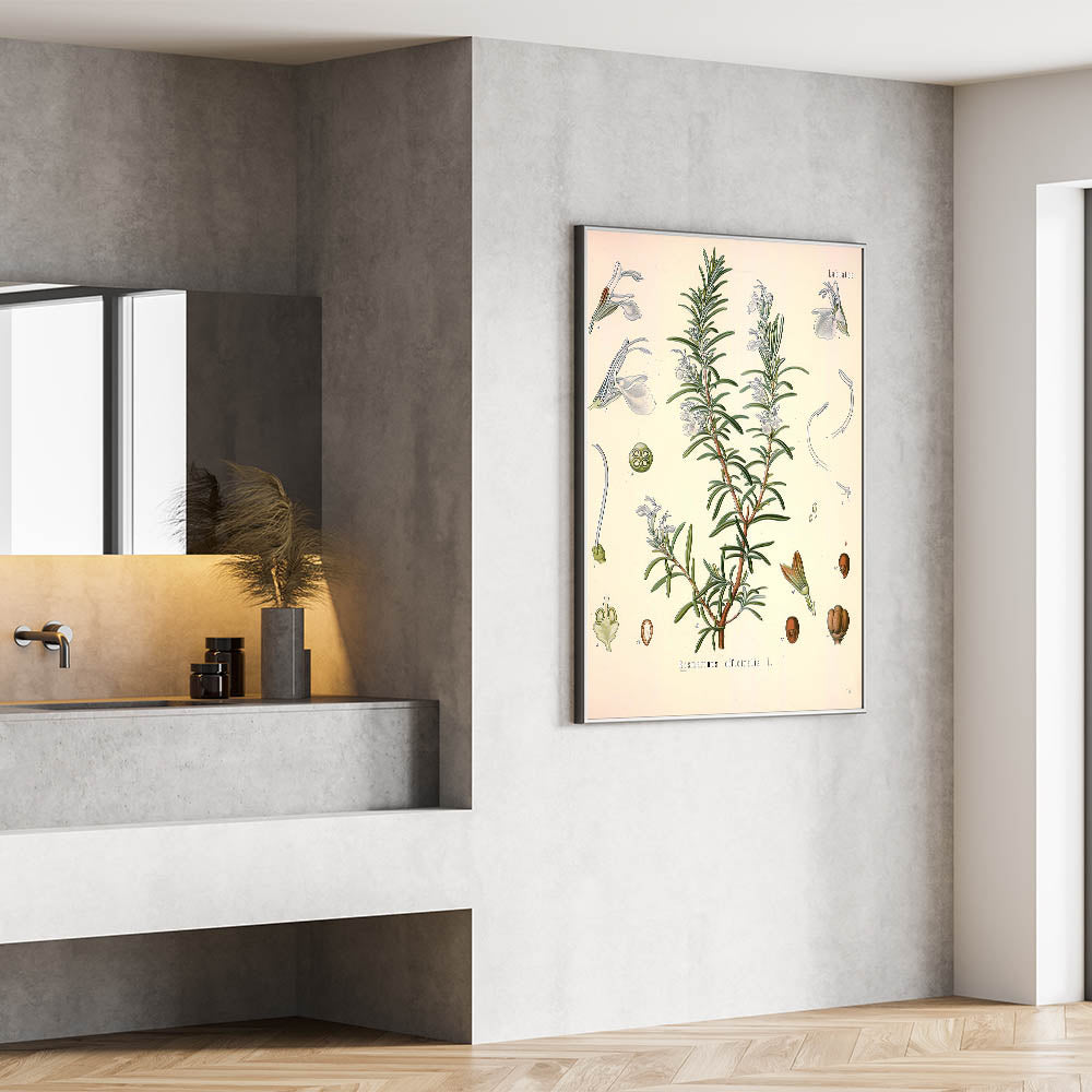 Add a touch of nature’s charm to your decor with this vintage botanical illustration of Rosmarinus officinalis L. (Rosemary). This artwork beautifully captures the slender green leaves and delicate pale blue blossoms of the rosemary plant, presenting a harmonious blend of nature's simplicity and historical artistry. Ideal for those who appreciate vintage art style and nature-inspired decor, this print brings a refreshing and elegant botanical vibe to any room.