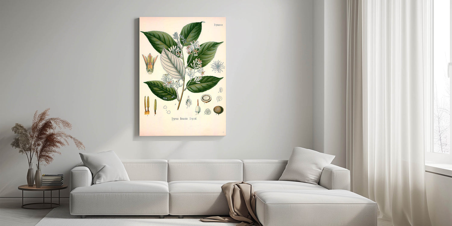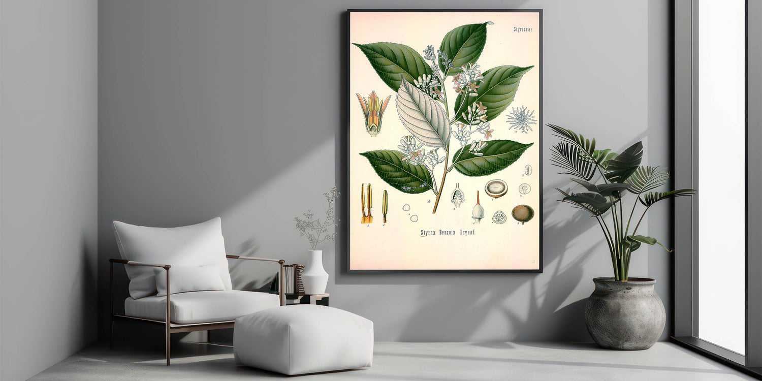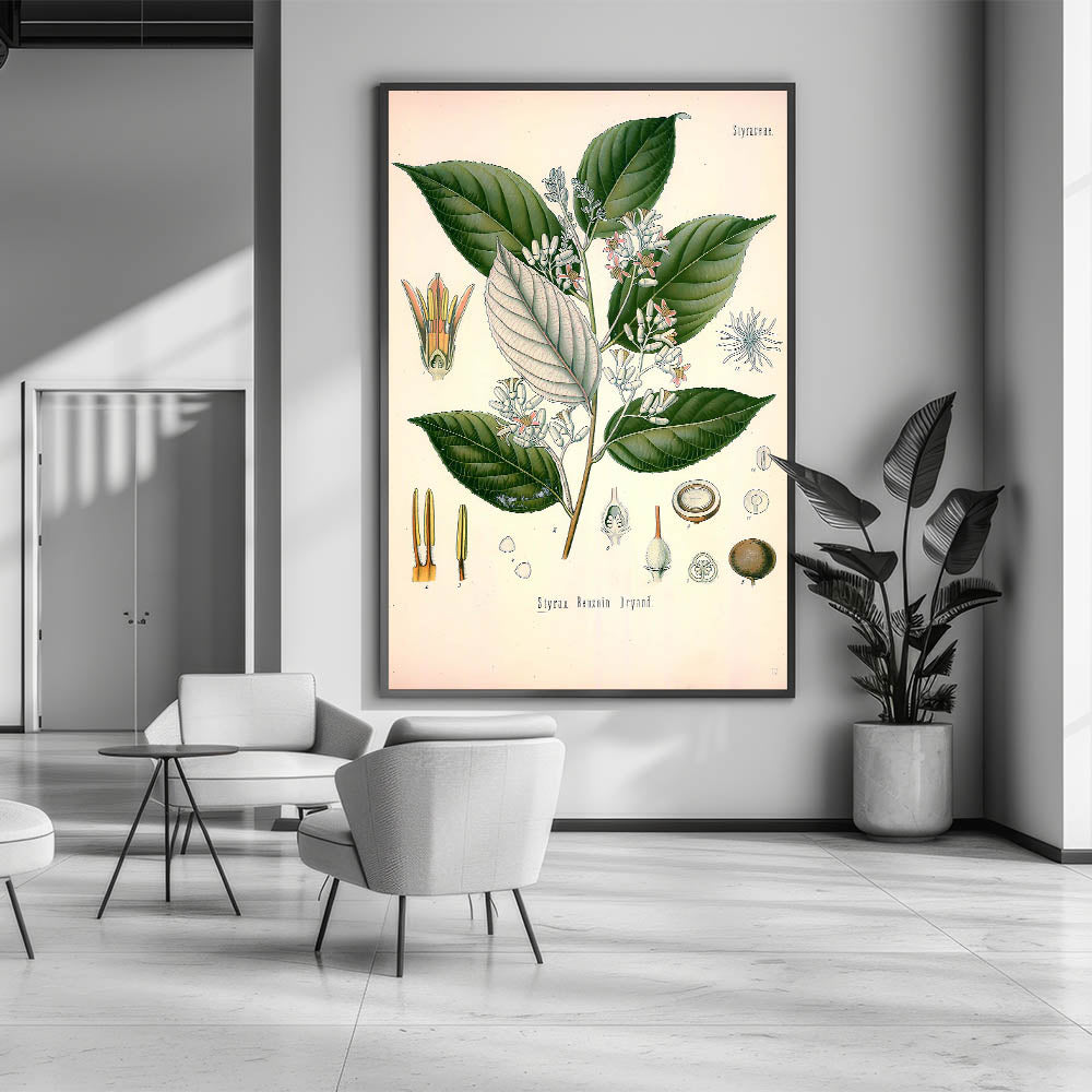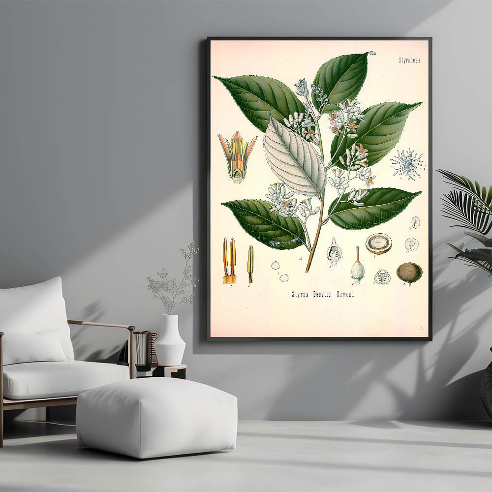 Transform your space with this vintage botanical illustration of Styrax Benzoin Dryand. This artwork beautifully captures the lush green leaves and delicate blossoms, showcasing nature's intricate details with precision and charm. The soft white and pink tones of the flowers, contrasted against the deep green foliage, make it an ideal choice for nature-inspired decor. Perfect for those who appreciate vintage art style and illustrative botanical designs, this print adds a touch of timeless elegance to any room.