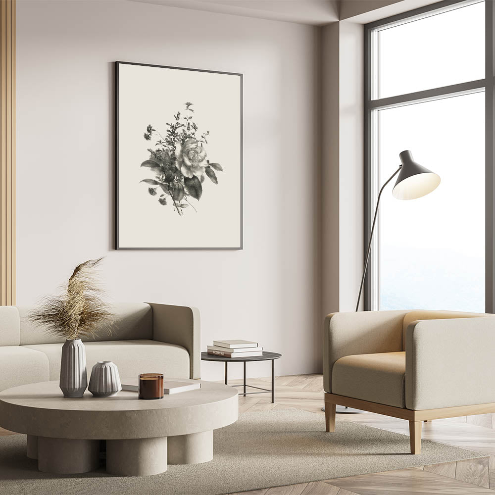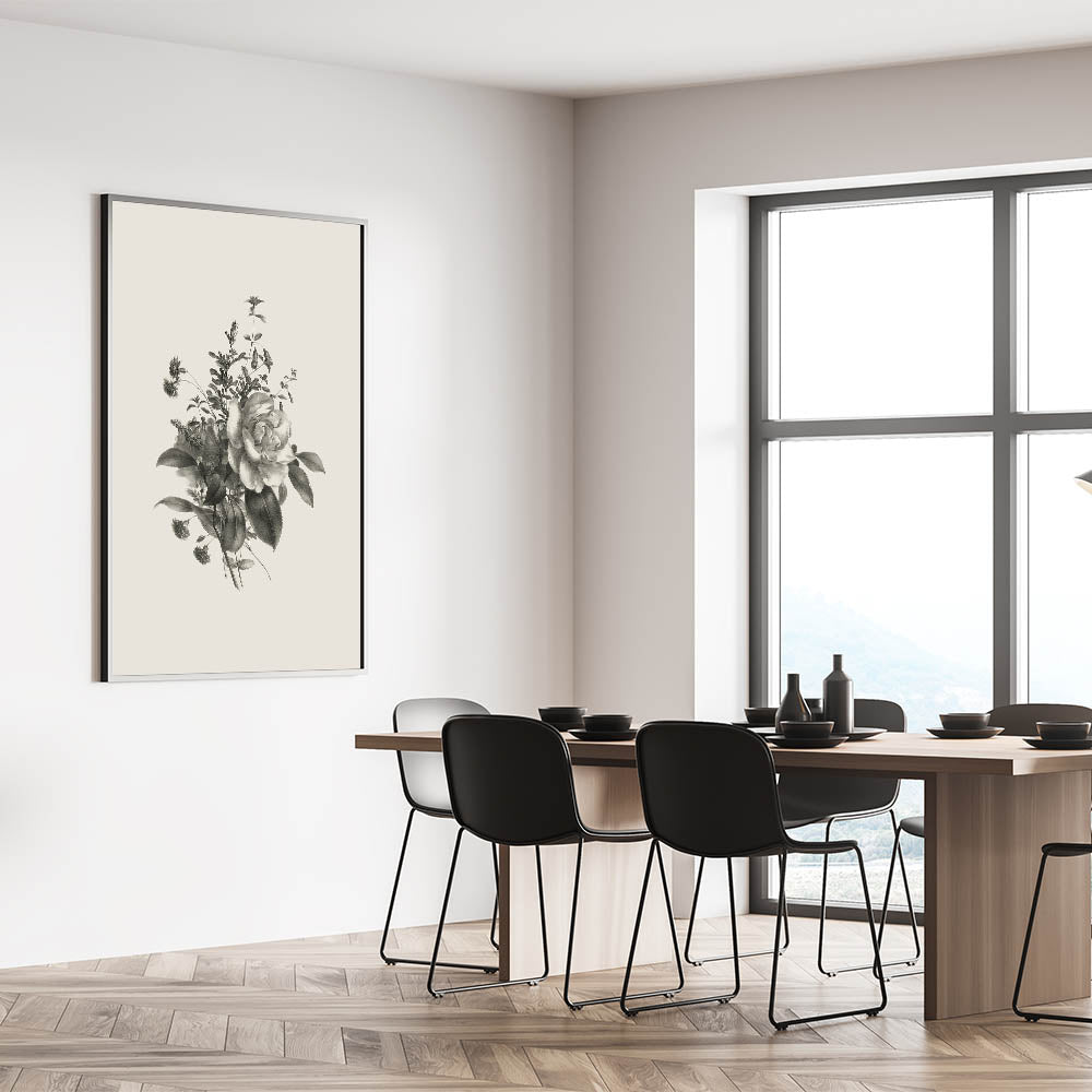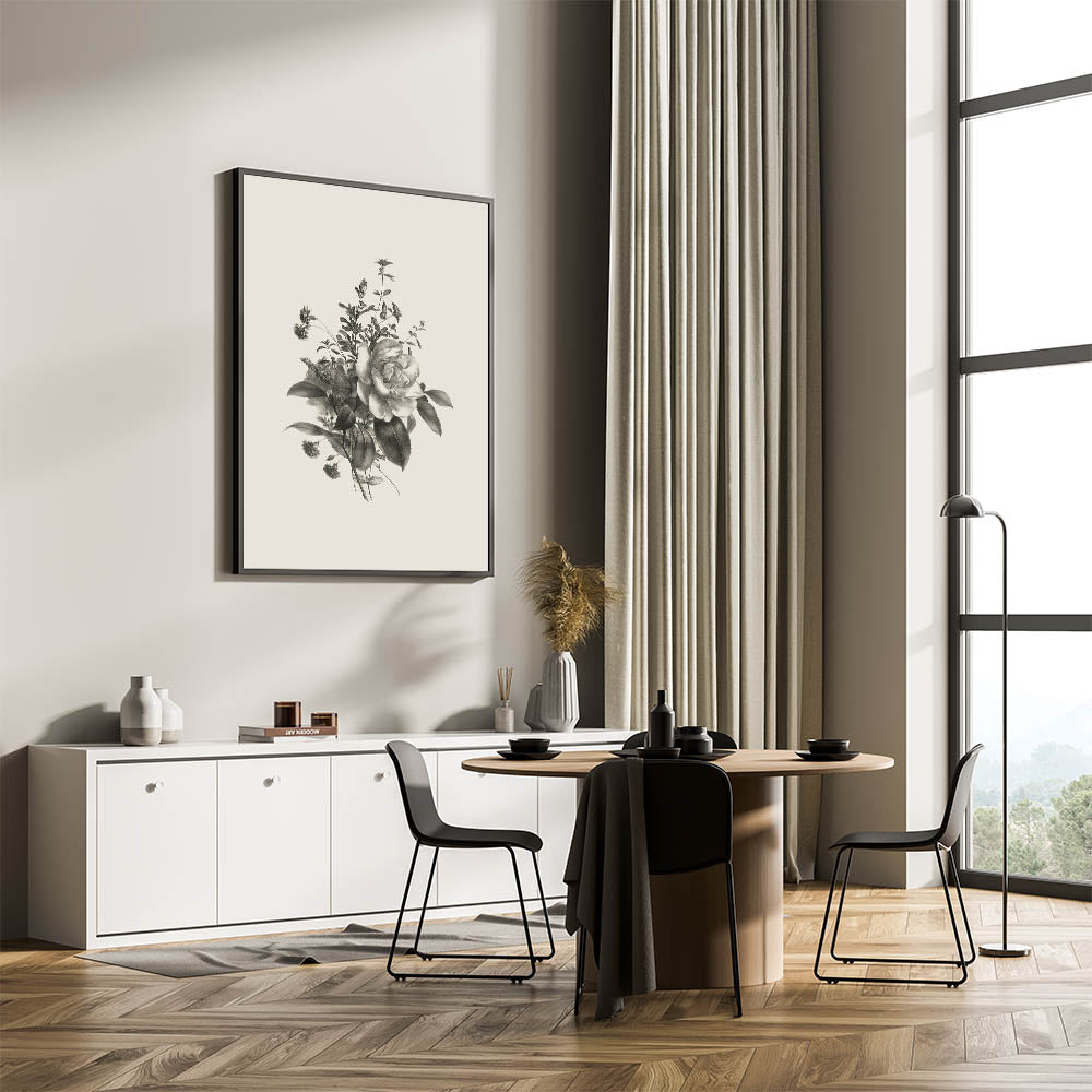 Add timeless elegance to your space with this black and white botanical art print. Featuring delicate roses and a variety of other plants, this vintage botanical illustration captures nature's beauty in stunning detail. Its classic monochrome palette makes it a perfect addition to both modern and traditional interiors, creating a sophisticated and serene atmosphere.