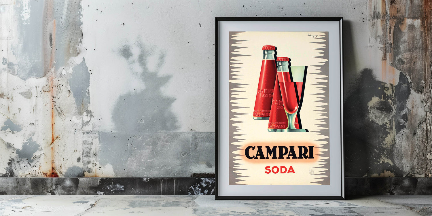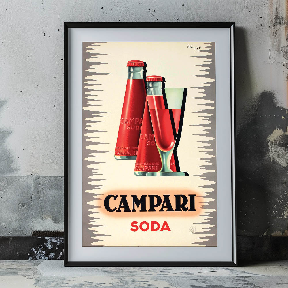 This elegant Vintage Campari Soda Poster captures the essence of Italian refreshment with its iconic design. Featuring the classic Campari soda bottles alongside a glass filled with the vibrant red drink, this retro advertising piece is perfect for anyone who appreciates the timeless appeal of Italian aperitivo culture. With its sleek, modernist design and bold use of color, this poster is both a work of art and a great piece of advertising history.