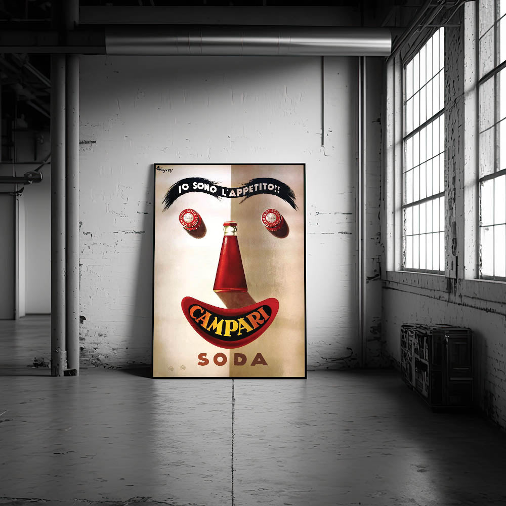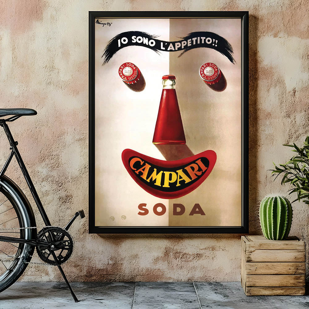 This playful and creative Vintage Campari Soda Poster is a bold representation of Italian advertising art. Featuring a dynamic design where the Campari bottle and cap form facial features, it captures the essence of the Italian aperitivo culture with humor and style. The tagline "Io sono l'appetito" (I am the appetite) adds an extra layer of charm, making it a unique and engaging piece.