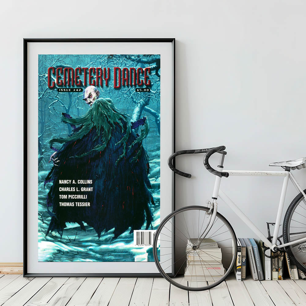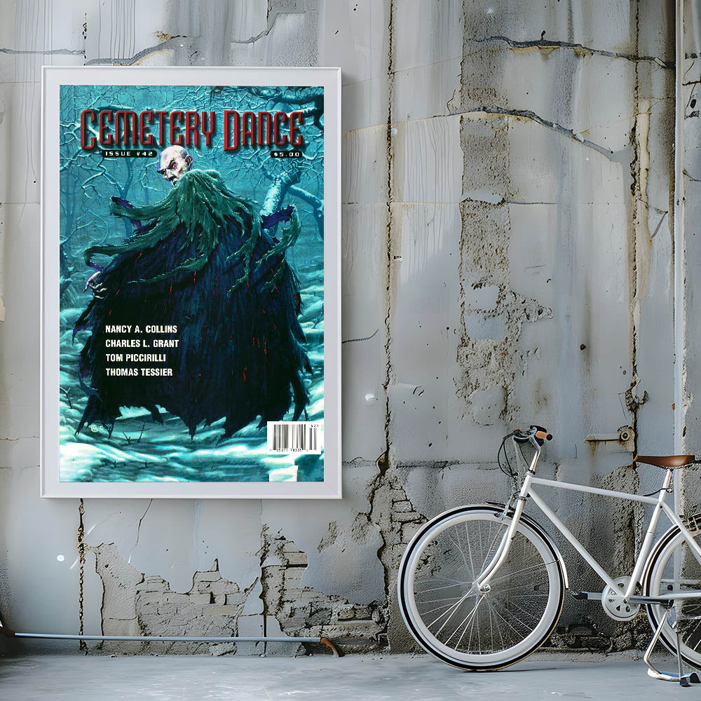 Step into a world of horror with this chilling vintage cover from Cemetery Dance (Issue #42). The image of a dark, sinister figure cloaked in a forest of snow creates an eerie, foreboding atmosphere. With its unsettling tone and detailed artwork, this cover art is perfect for collectors of vintage horror magazines or those seeking to add a touch of dark, supernatural charm to their decor.