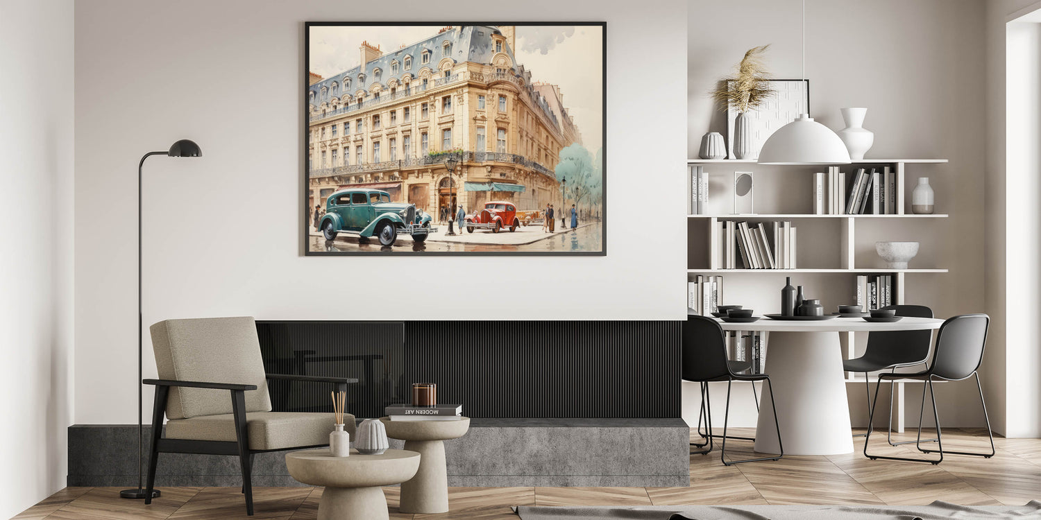 Step back in time with this vintage cityscape art showcasing a charming Parisian street scene. The iconic classic cars parked along the sidewalk, coupled with the elegant architecture, evoke the timeless beauty of Paris from a bygone era. This piece captures the essence of retro landscape decor and vintage-inspired wall art, making it a perfect addition to any home decor that celebrates nostalgia and old-world charm.