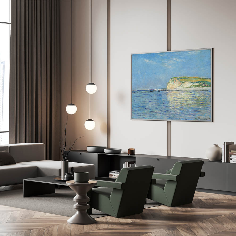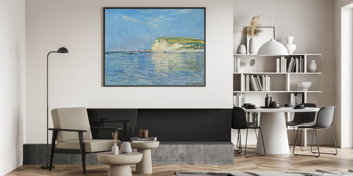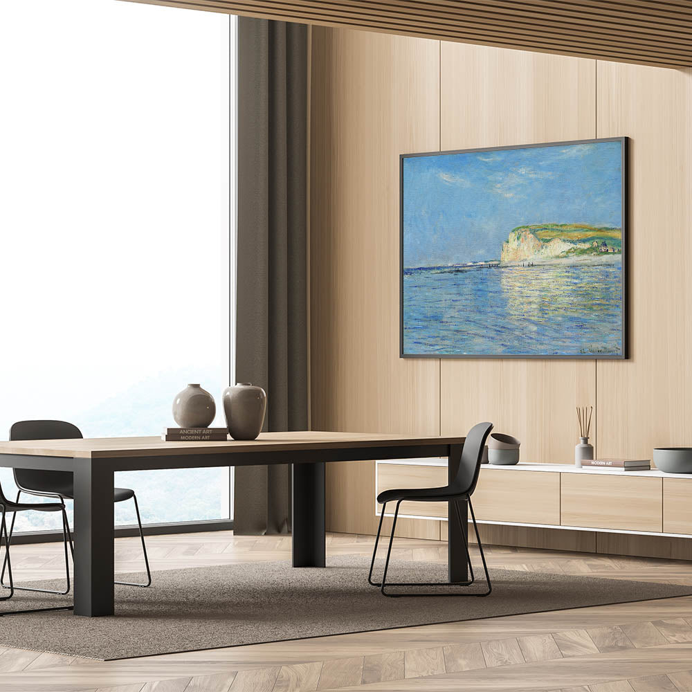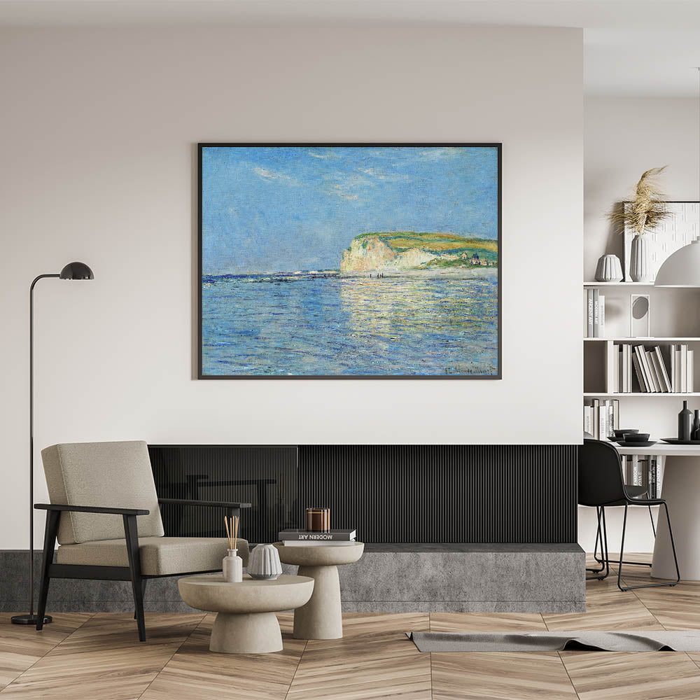 Infuse your space with the serene beauty of the coast with this vintage coastal landscape artwork. Featuring a bright and calming beach scene with the sparkling sea reflecting the clear blue sky, this piece evokes a sense of peace and tranquility. The soft brushstrokes and vivid blues, paired with the scenic cliffs in the distance, bring a timeless seaside view into your home.