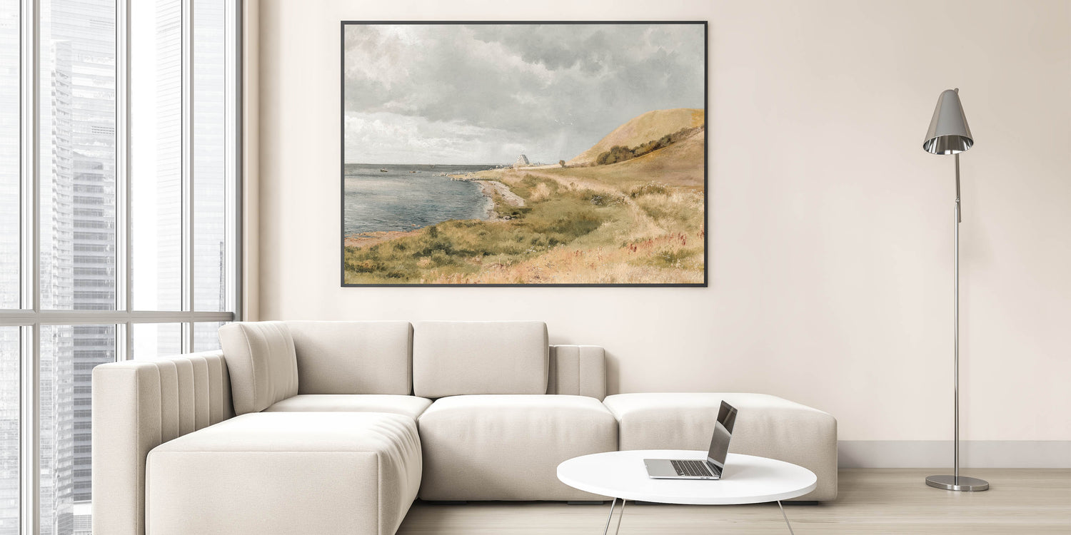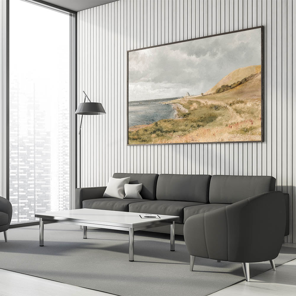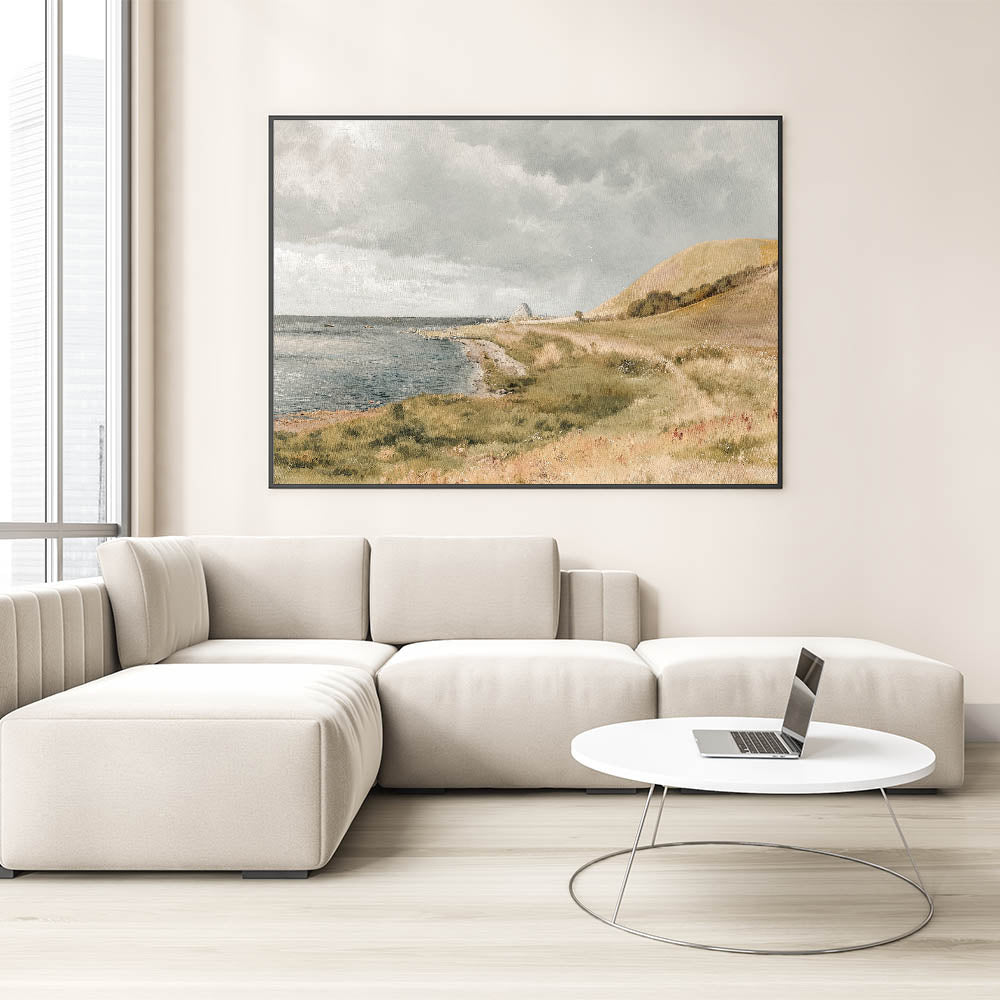 Bring the calm beauty of the coast into your home with this vintage coastal landscape artwork. Featuring rolling hills, a peaceful shoreline, and boats gently floating on the water, this piece captures the essence of seaside tranquility. The soft, muted colors and serene setting evoke a sense of relaxation, making it perfect for any space in need of vintage charm and calm.