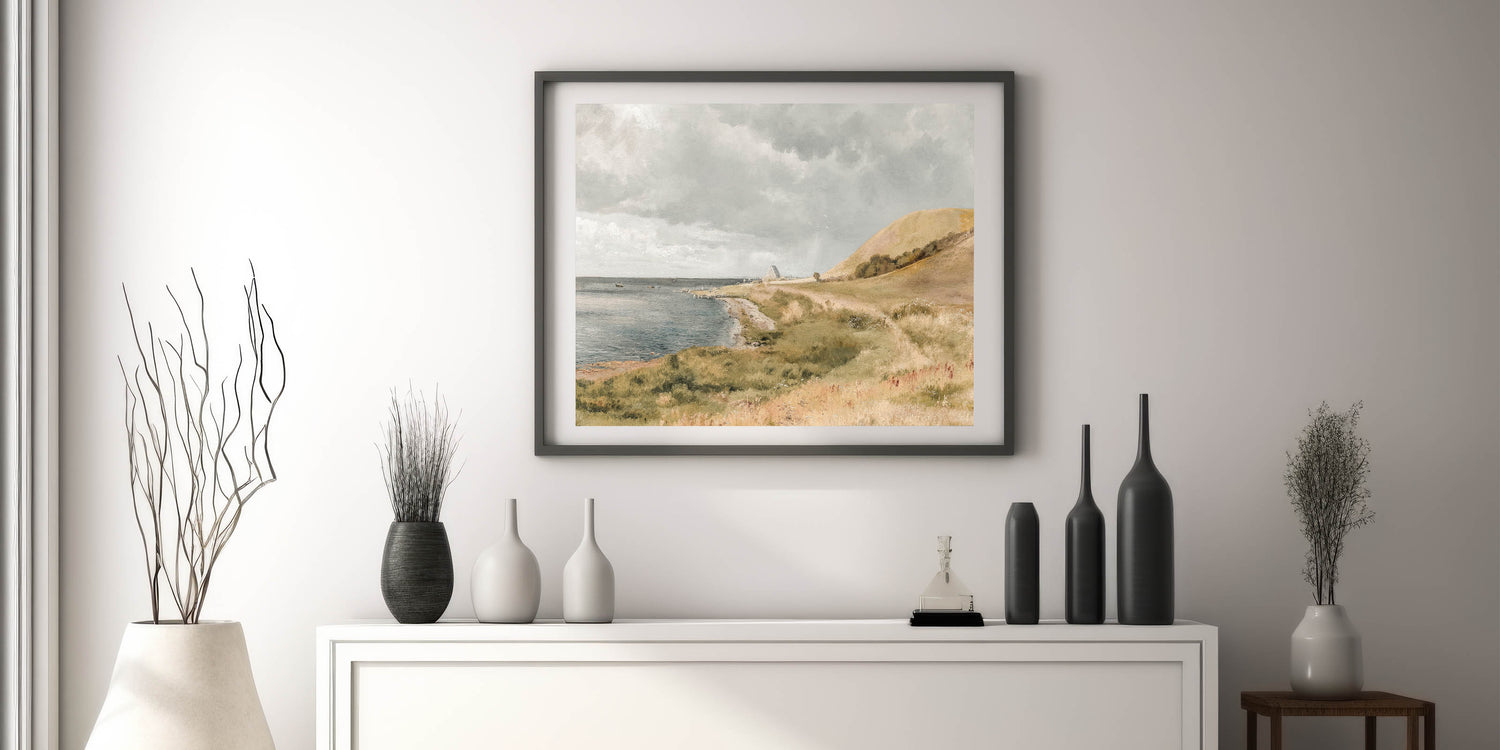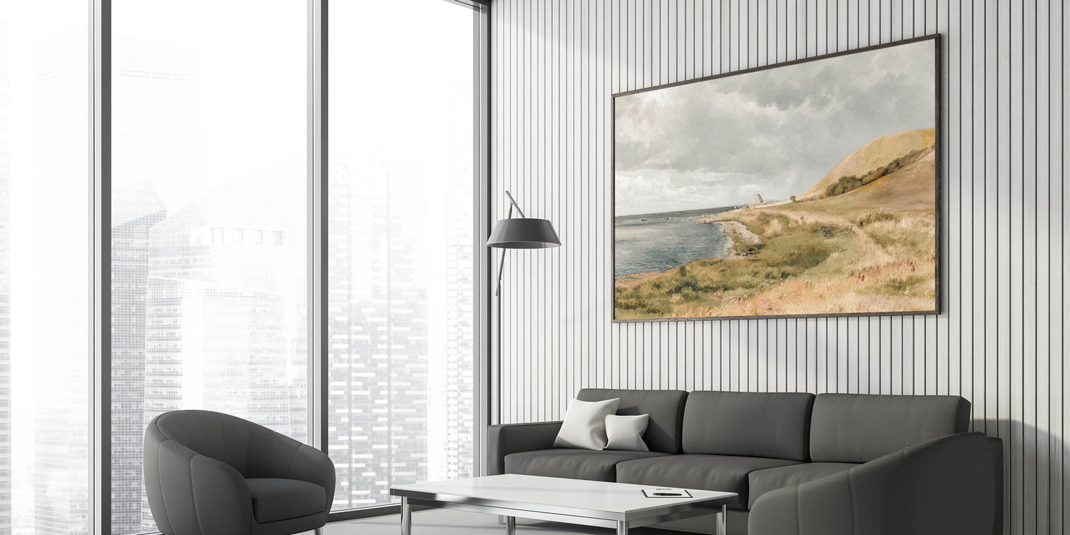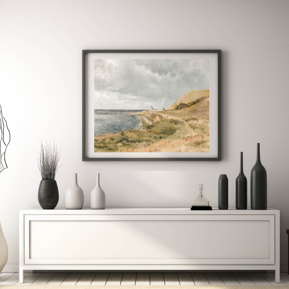 Bring the calm beauty of the coast into your home with this vintage coastal landscape artwork. Featuring rolling hills, a peaceful shoreline, and boats gently floating on the water, this piece captures the essence of seaside tranquility. The soft, muted colors and serene setting evoke a sense of relaxation, making it perfect for any space in need of vintage charm and calm.