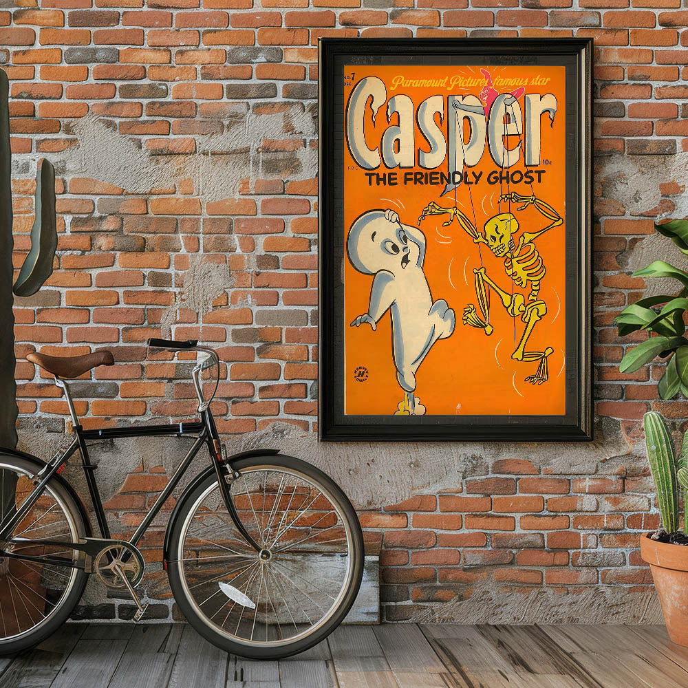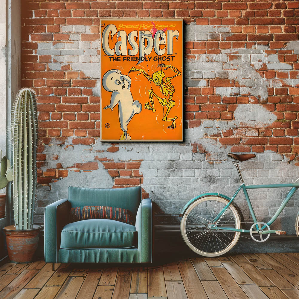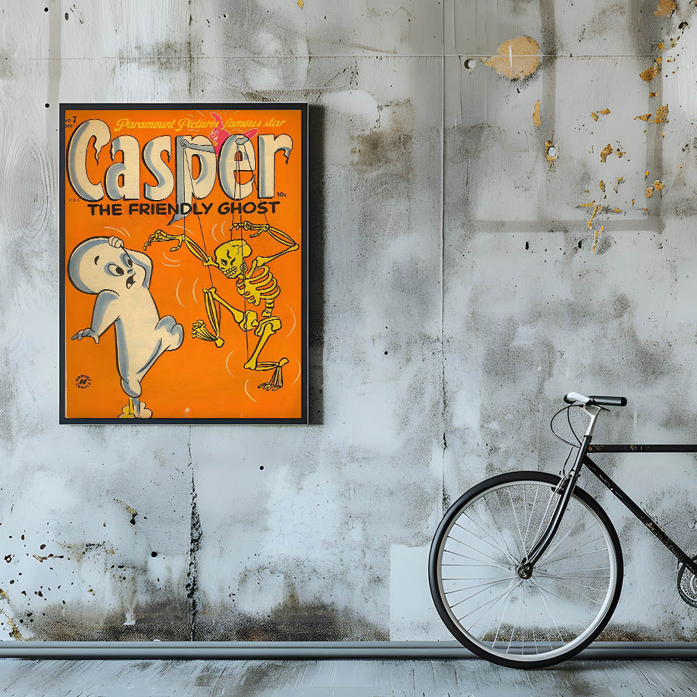 Add a touch of spooky nostalgia with this Casper the Friendly Ghost Vintage Comics Wall Art Featuring Casper and a dancing skeleton puppet, this classic comic book poster blends Halloween fun with retro charm, making it a must-have for collectors and fans