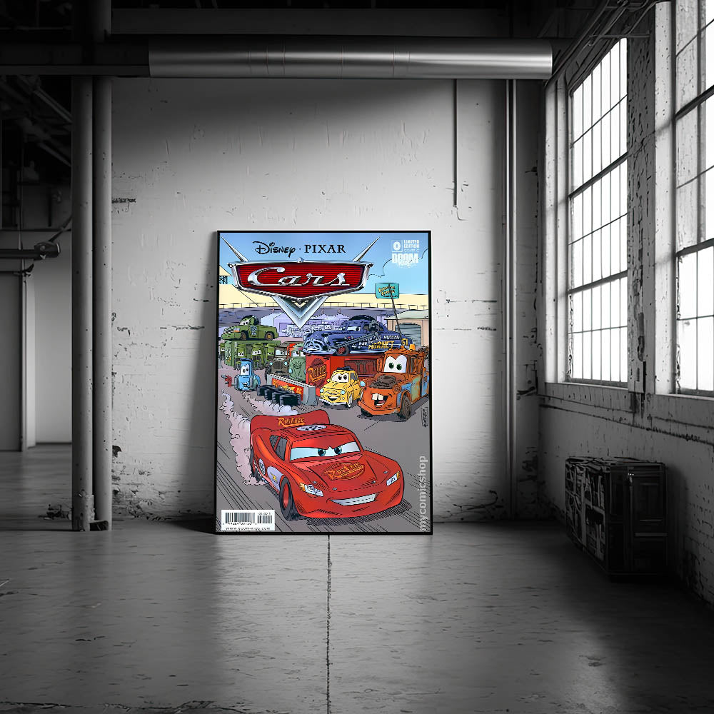 - High-quality retro comic art print featuring Lightning McQueen and friends