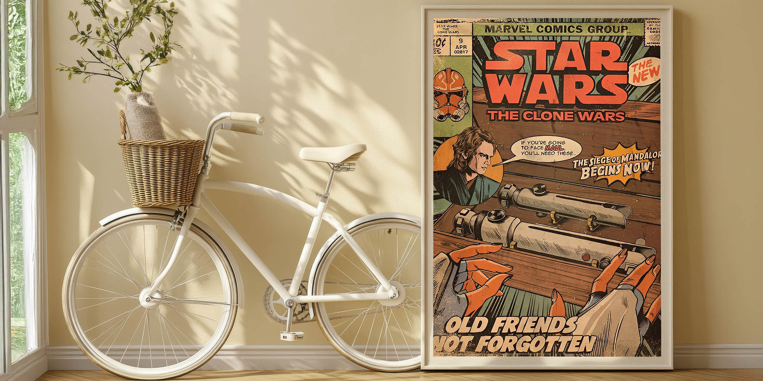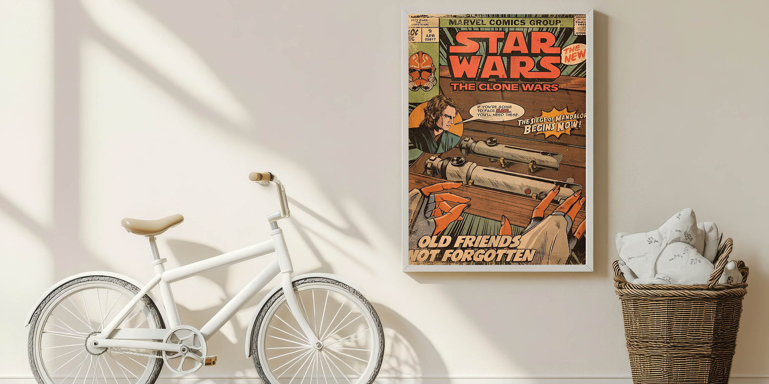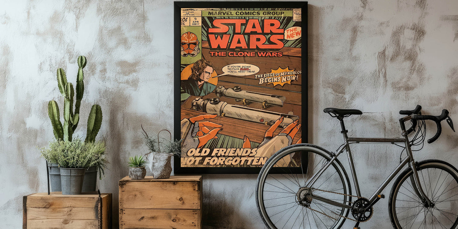 Step into a galaxy far, far away with this Star Wars: The Clone Wars Vintage Comics Wall Art Featuring Anakin Skywalker, lightsabers, and the Siege of Mandalore storyline, this classic comic book poster is a must-have for any Star Wars fan and collector