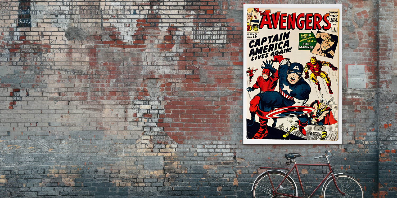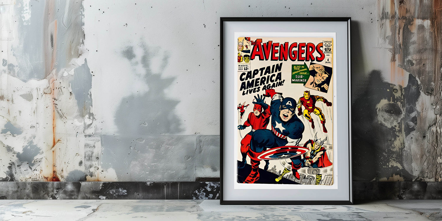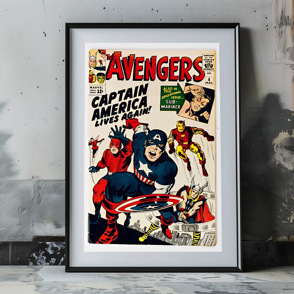 Celebrate Marvel’s greatest heroes with this Avengers Vintage Comics Wall Art Featuring Captain America, Iron Man, Thor, and more in an action-packed cover, this classic comic book poster is a must-have for superhero fans and collectors