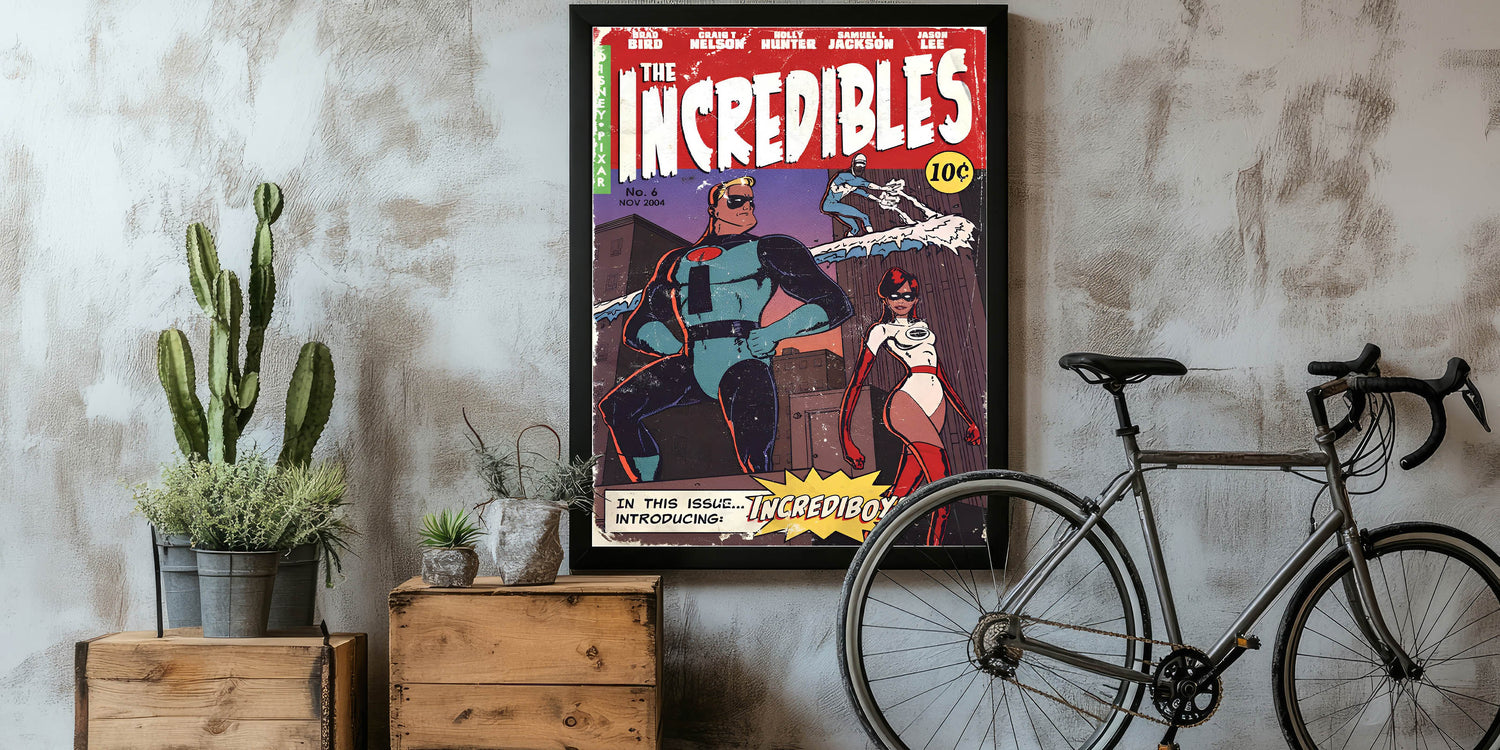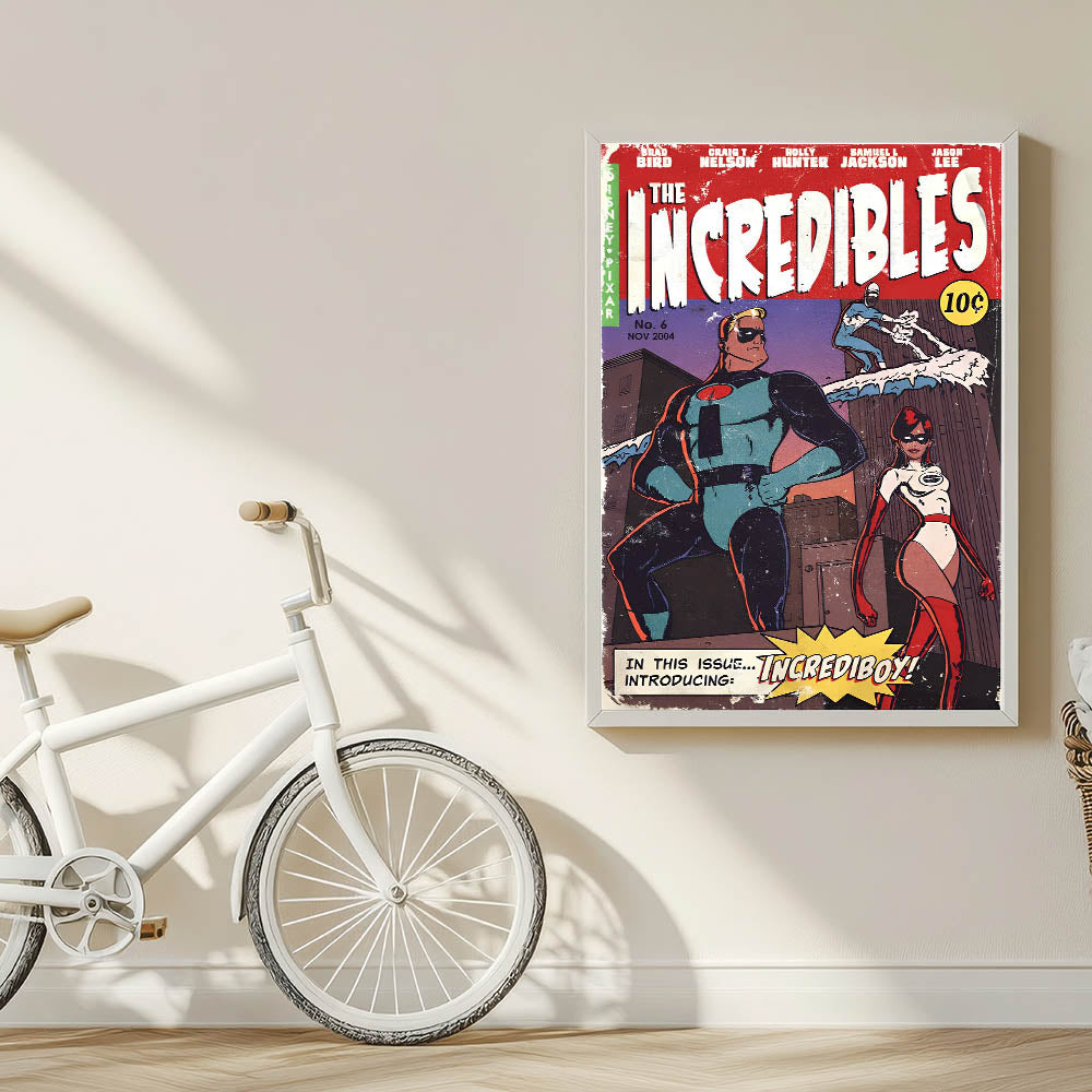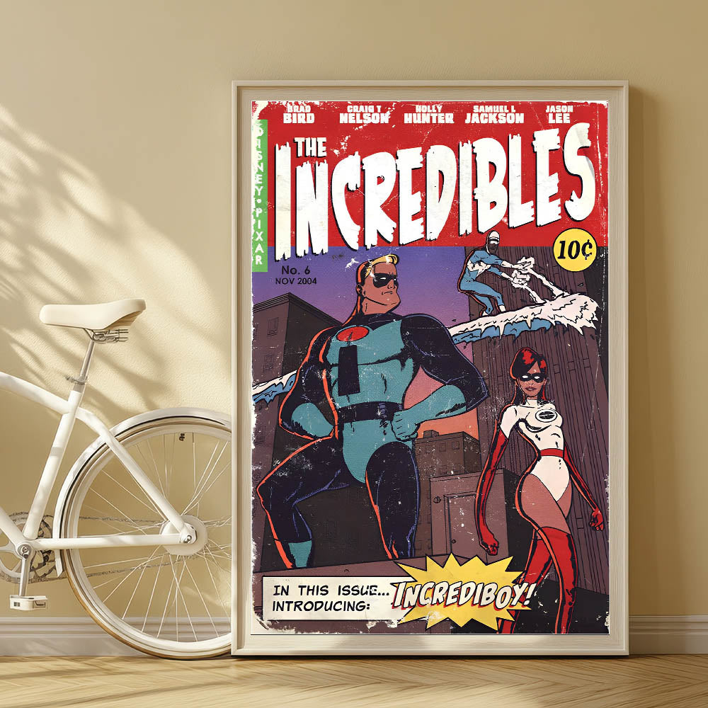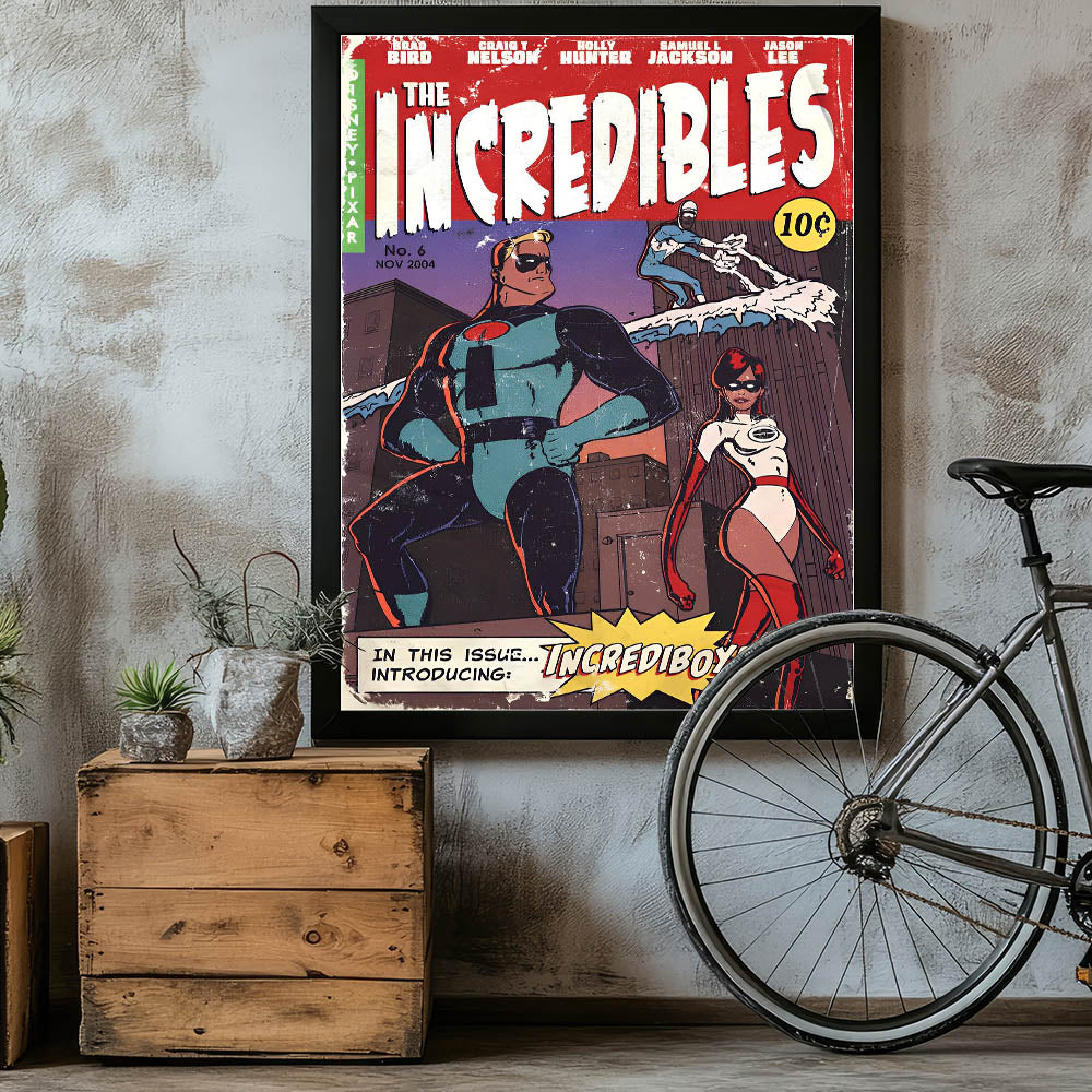 - High-quality retro comic art print featuring The Incredibles