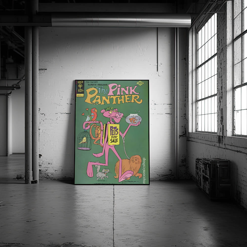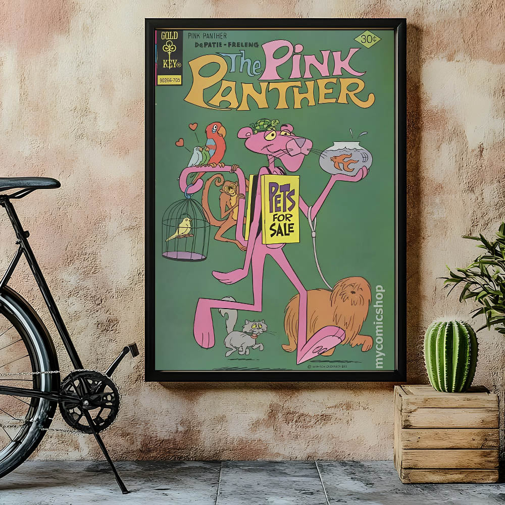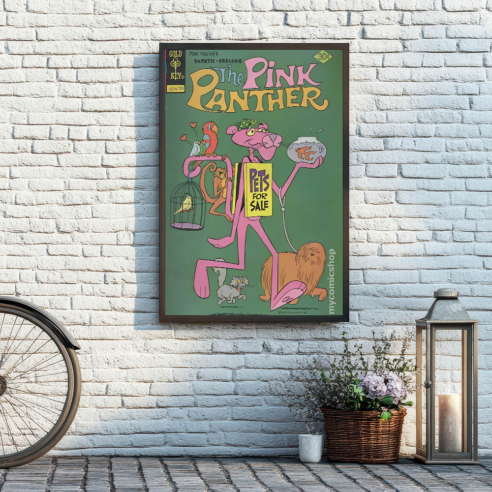 Bring playful nostalgia to your space with this Pink Panther Vintage Comics Wall Art Featuring the Pink Panther as a pet shop seller with a fun mix of animals, this classic comic book poster is a must-have for fans of retro cartoons and timeless animation