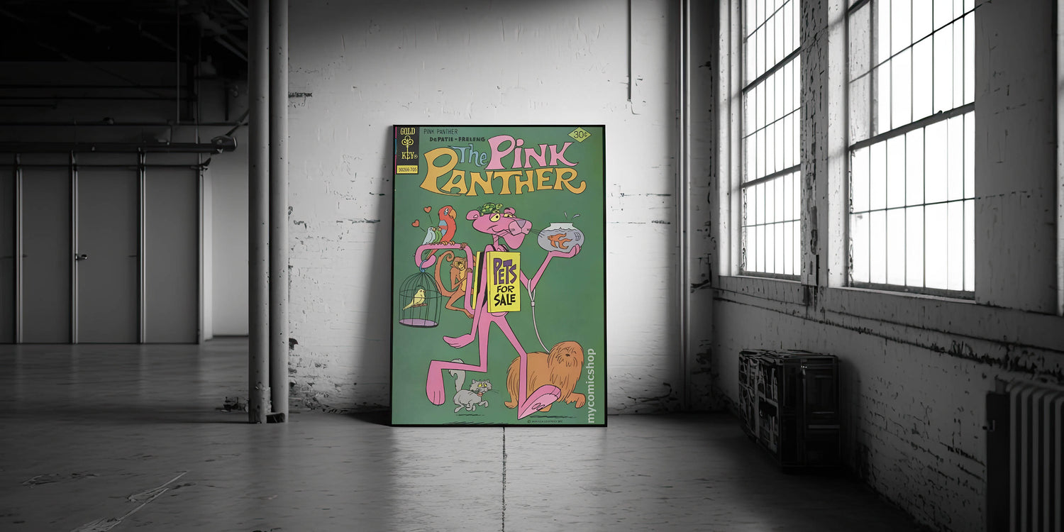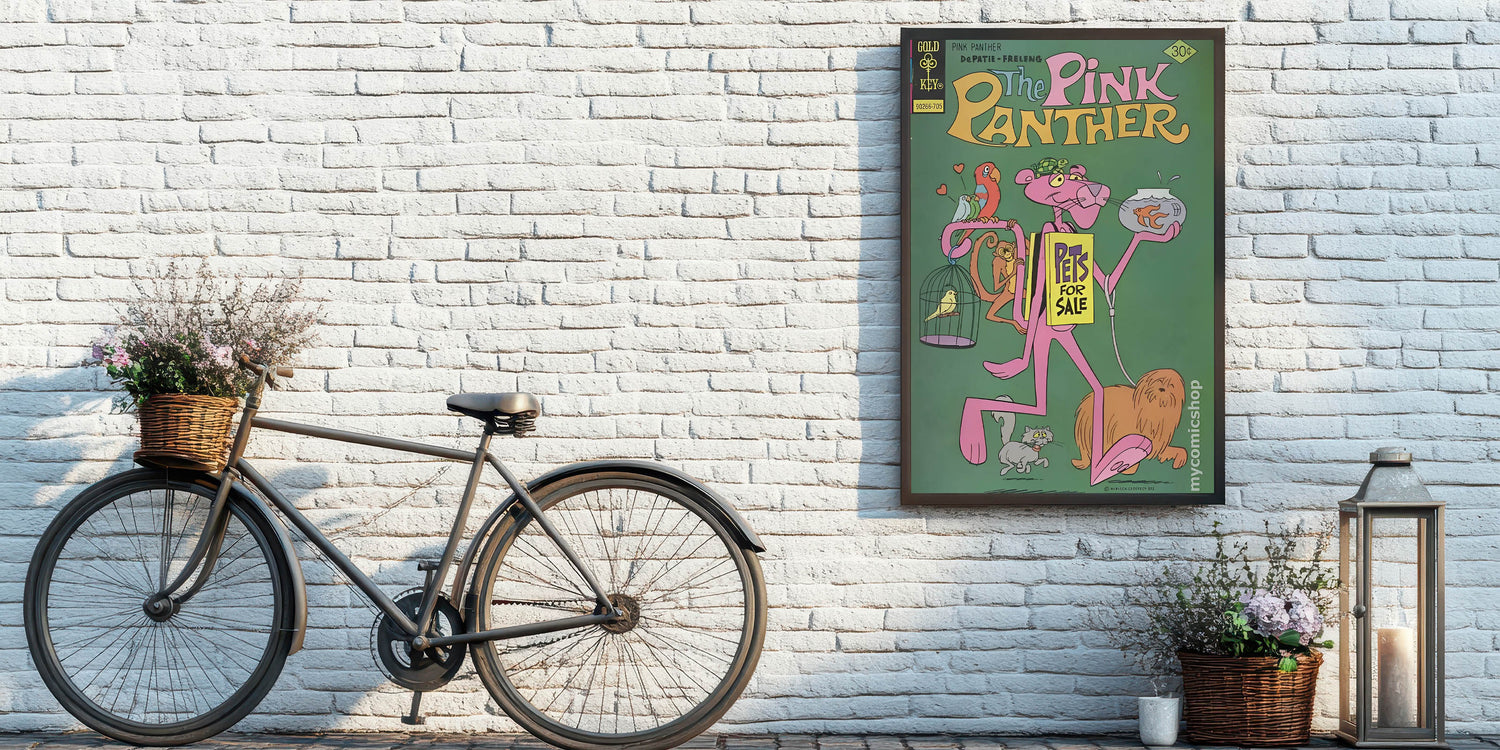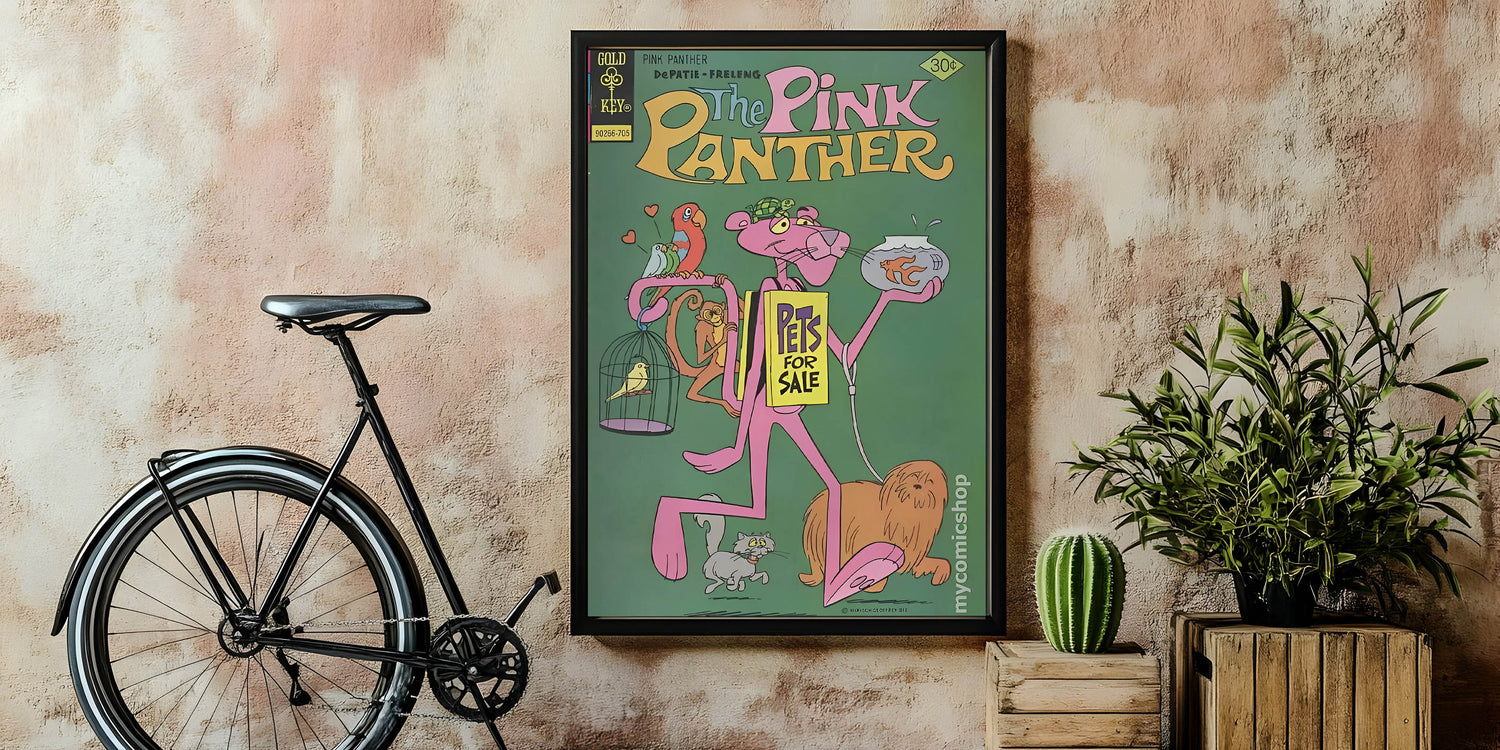 Bring playful nostalgia to your space with this Pink Panther Vintage Comics Wall Art Featuring the Pink Panther as a pet shop seller with a fun mix of animals, this classic comic book poster is a must-have for fans of retro cartoons and timeless animation