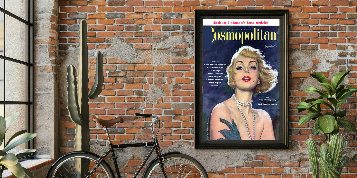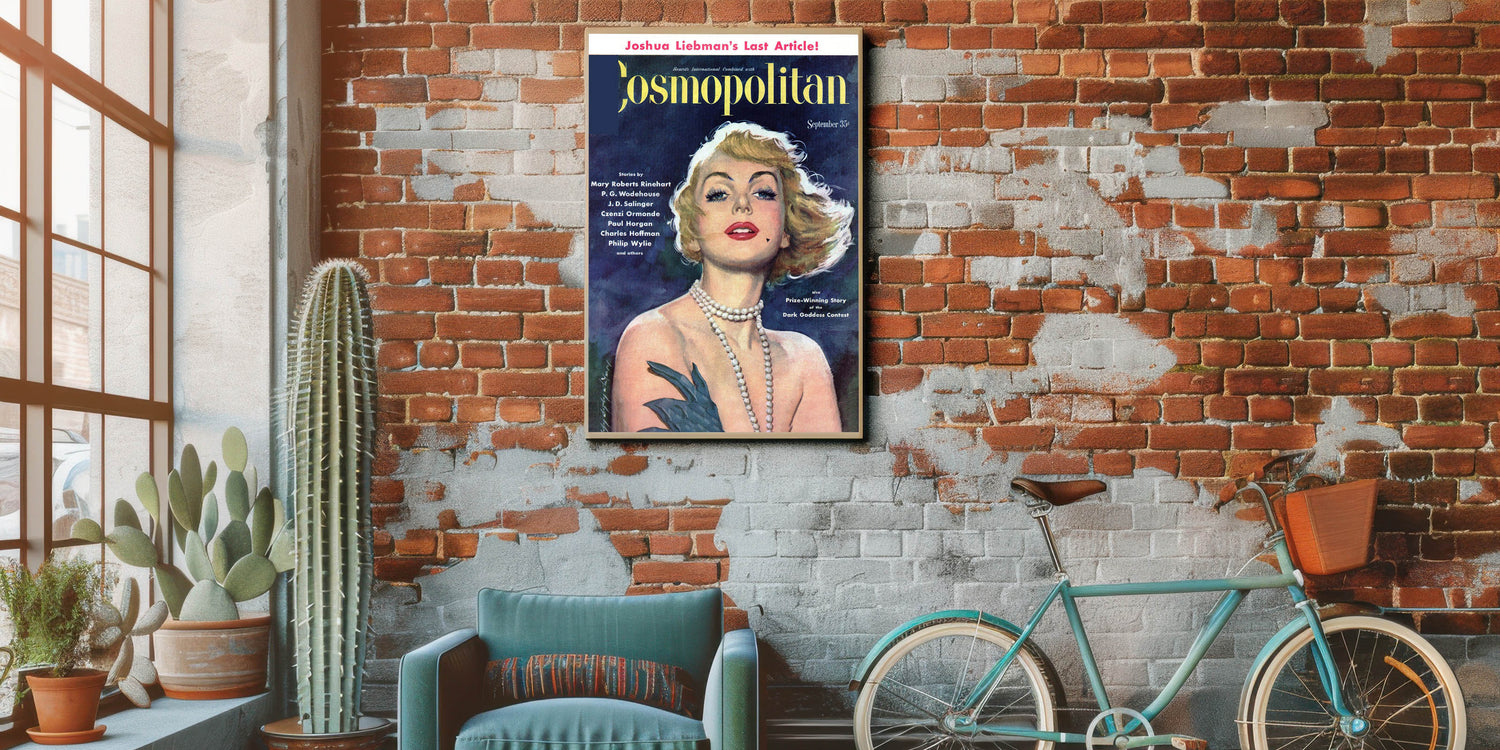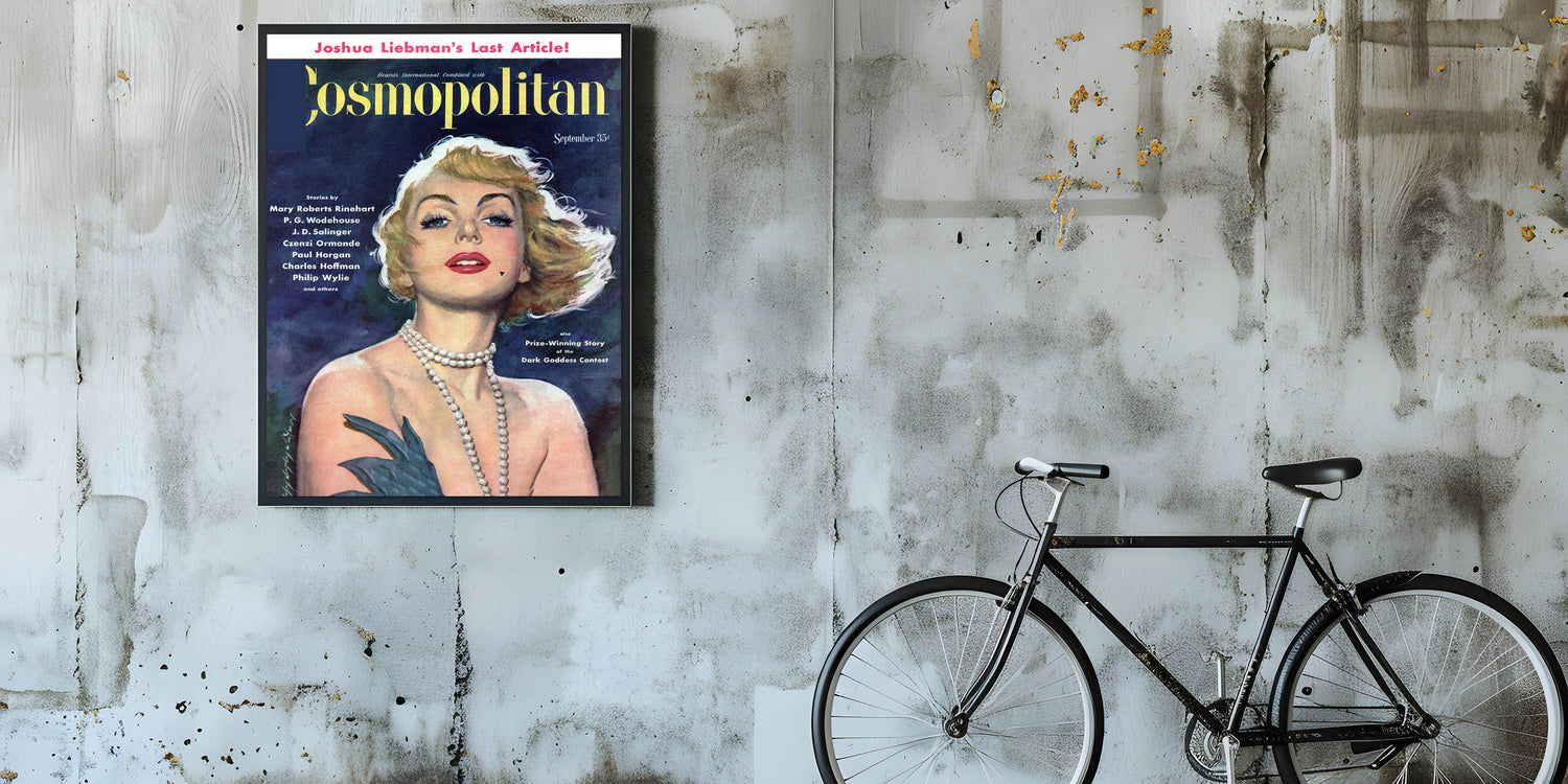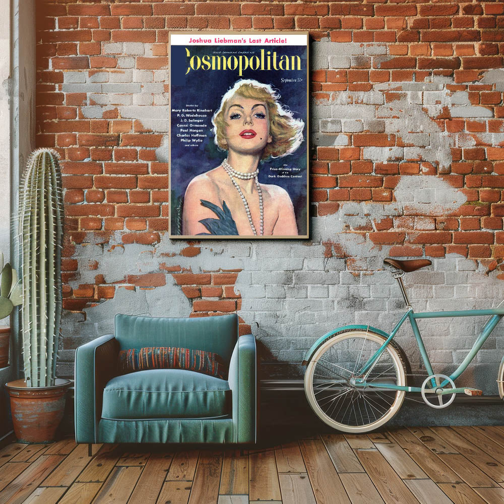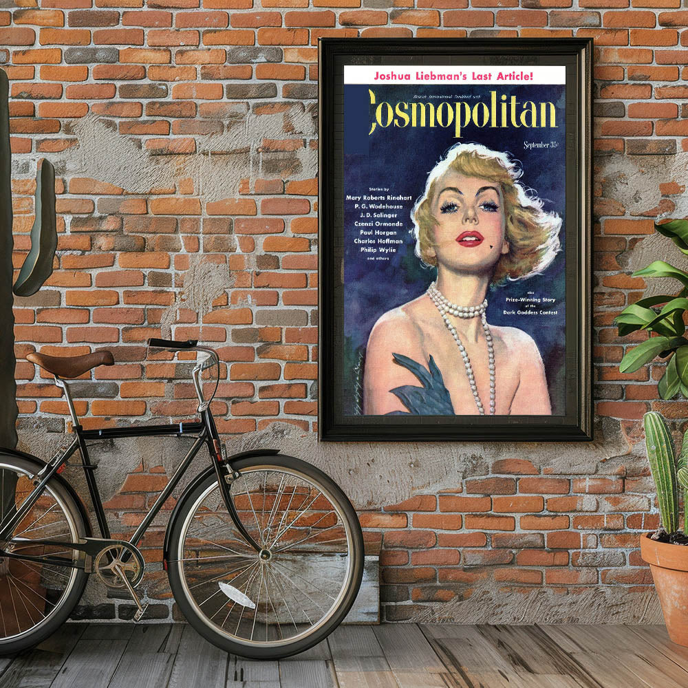Bring a piece of 1950s glamour into your home with this antique magazine cover art that showcases the timeless appeal of Cosmopolitan.