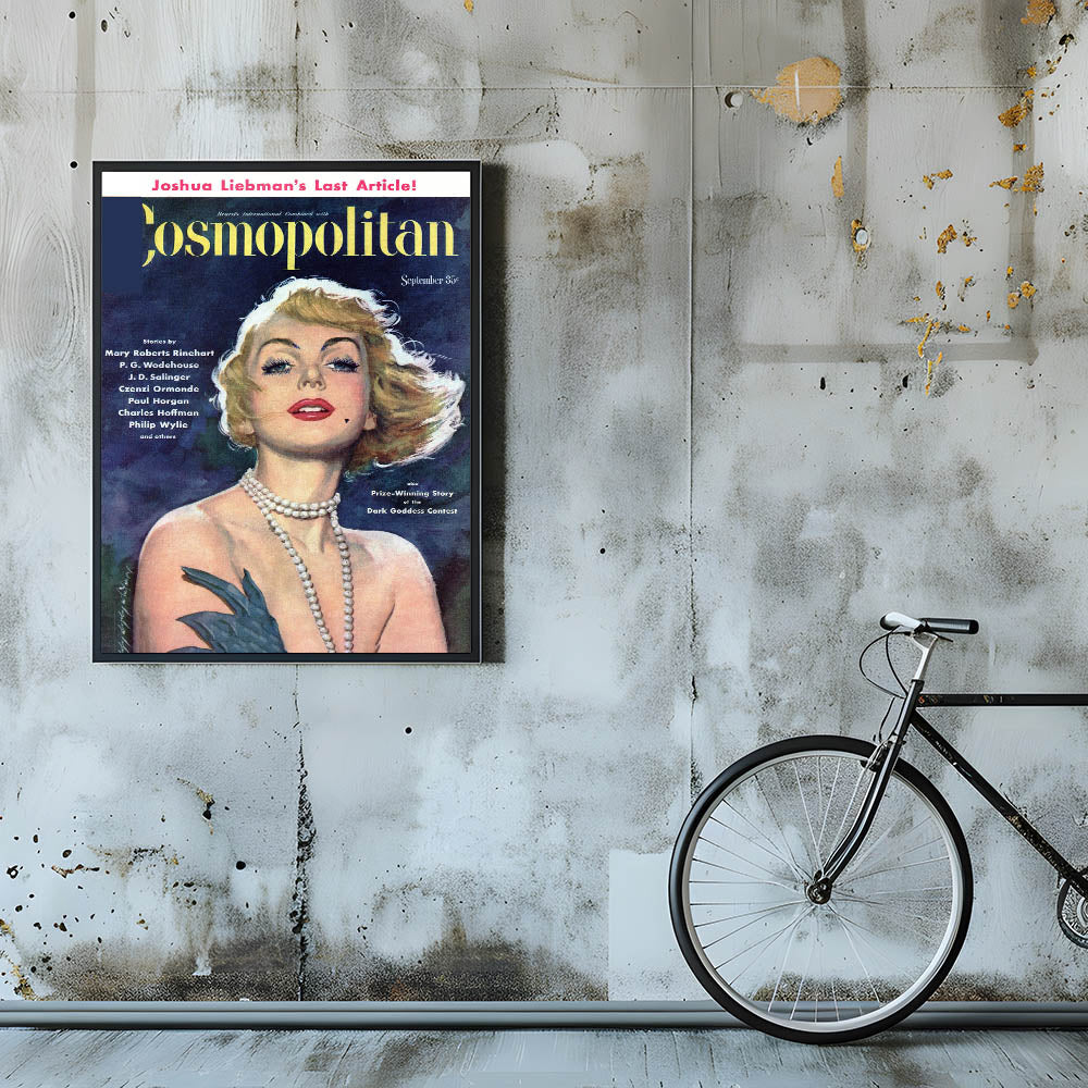 Add a touch of vintage elegance to your space with this Vintage Magazine Cover Art from Cosmopolitan (September issue). Featuring a glamorous portrait of a woman adorned with pearls, this cover captures the essence of 1950s style and sophistication. The soft color palette of blues and pinks, combined with the bold yellow title, creates a visually striking and timeless design. This retro magazine cover print is perfect for anyone looking to add nostalgic vintage decor prints or iconic magazine cover reproductions to their home or office space.